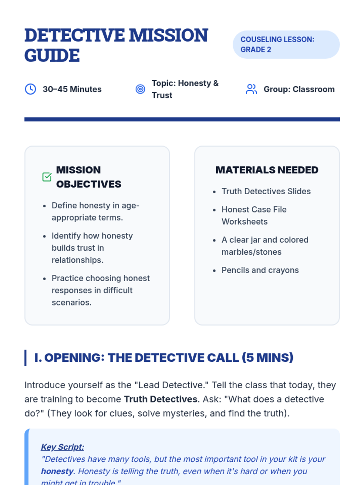 An engaging second-grade counseling lesson that uses a detective theme to explore the importance of honesty and building trust. Students learn to identify truthful choices and understand how honesty helps maintain strong relationships.