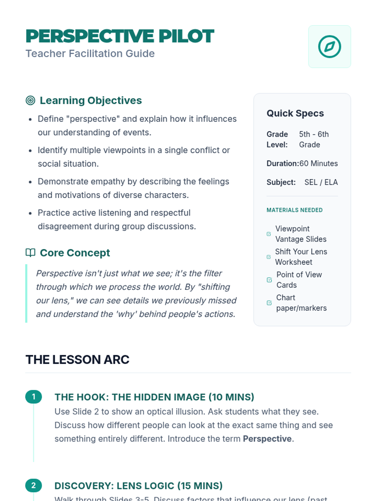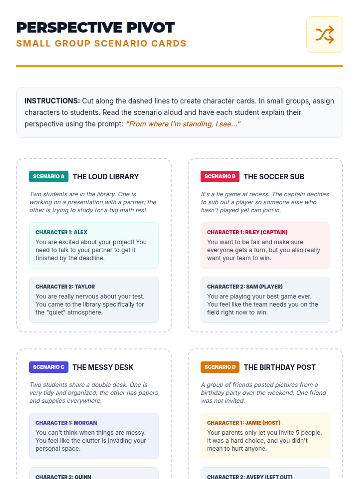 An engaging lesson for 5th and 6th graders that explores perspective-taking through creative scenarios and character analysis. Students will learn to step into others' shoes to foster empathy and critical thinking about social dynamics.