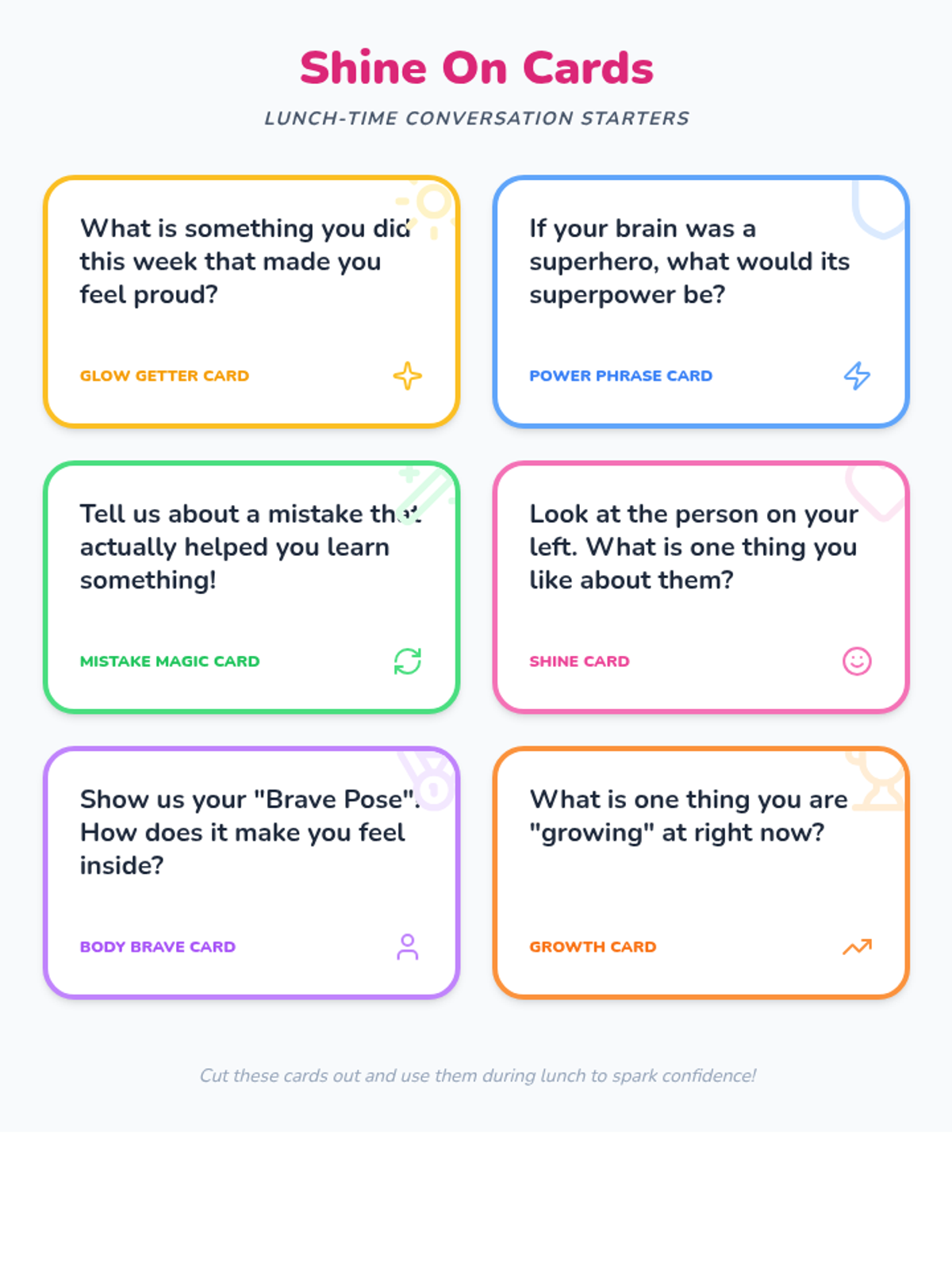 A 6-week small group curriculum designed for 2nd graders to build self-esteem and confidence through high-impact, 15-minute lunch sessions. This lesson focuses on establishing group norms and identifying personal 'sparks' or strengths.