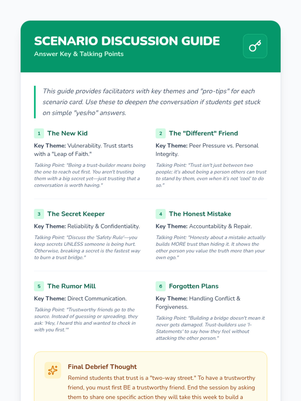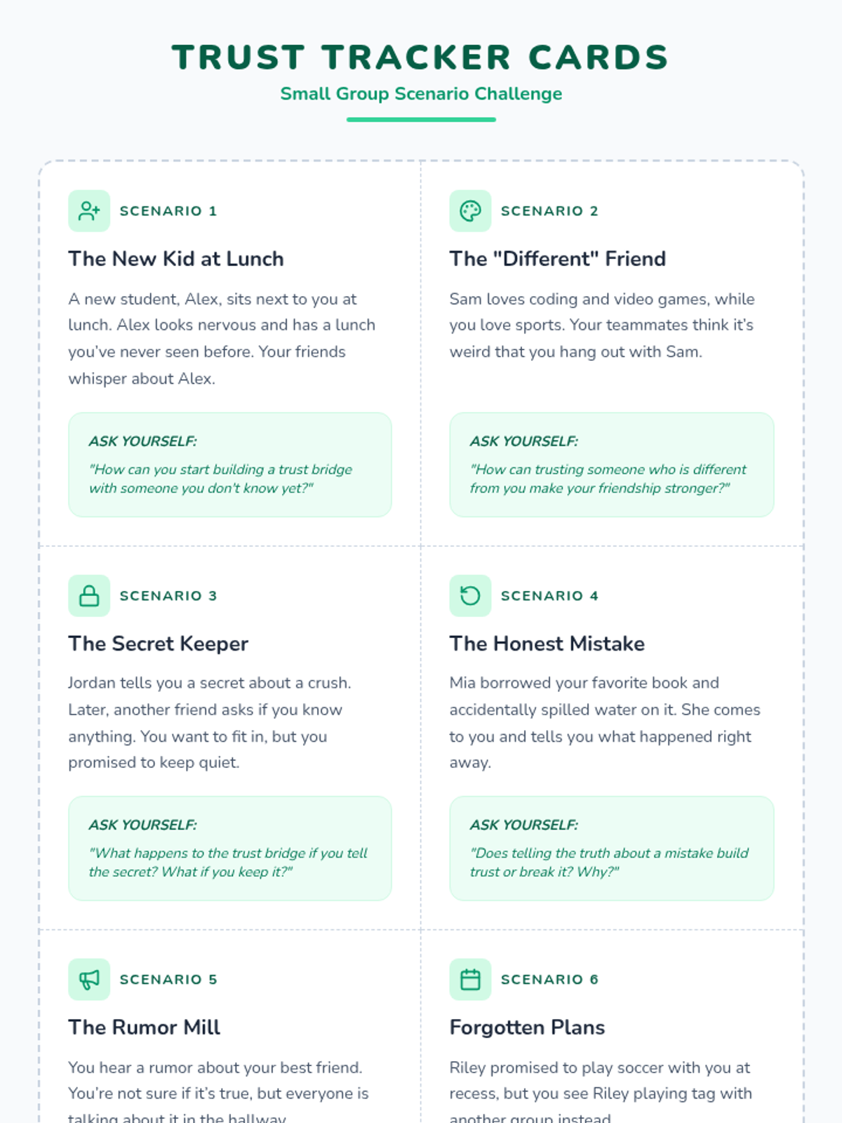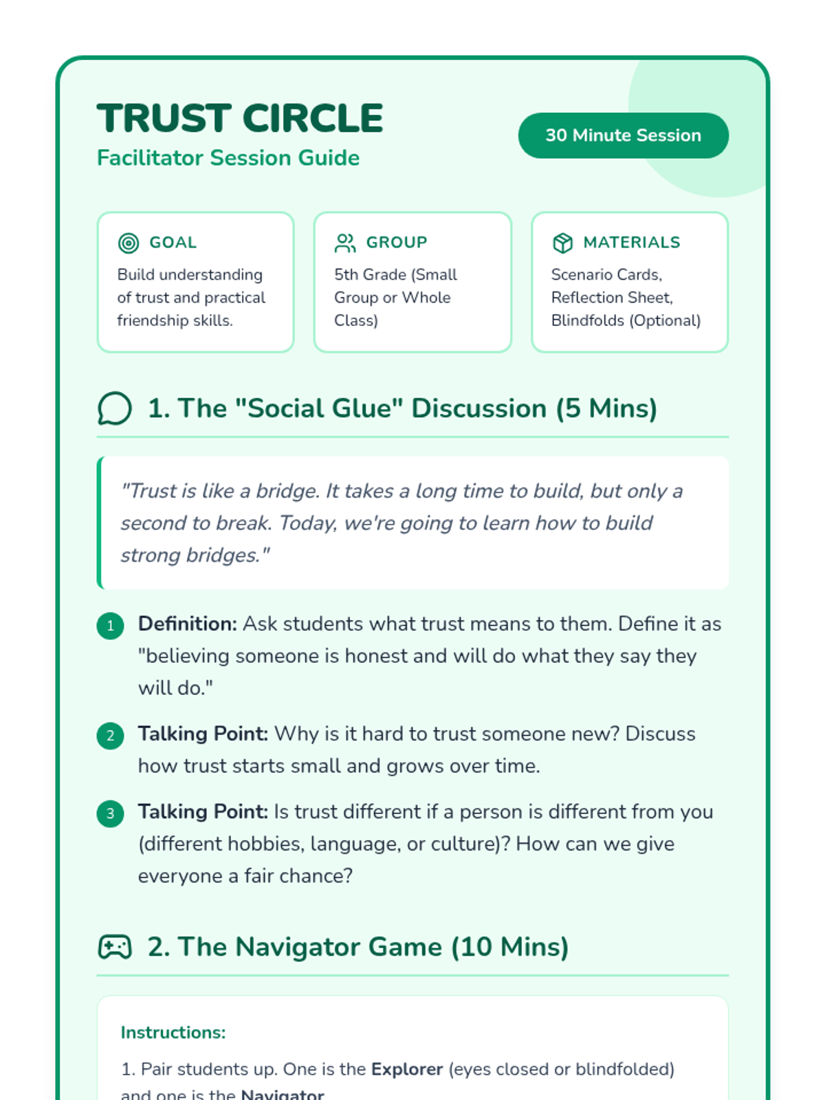 A 30-minute counseling session for 5th graders focused on defining, building, and maintaining trust in friendships through games, discussion, and scenarios.