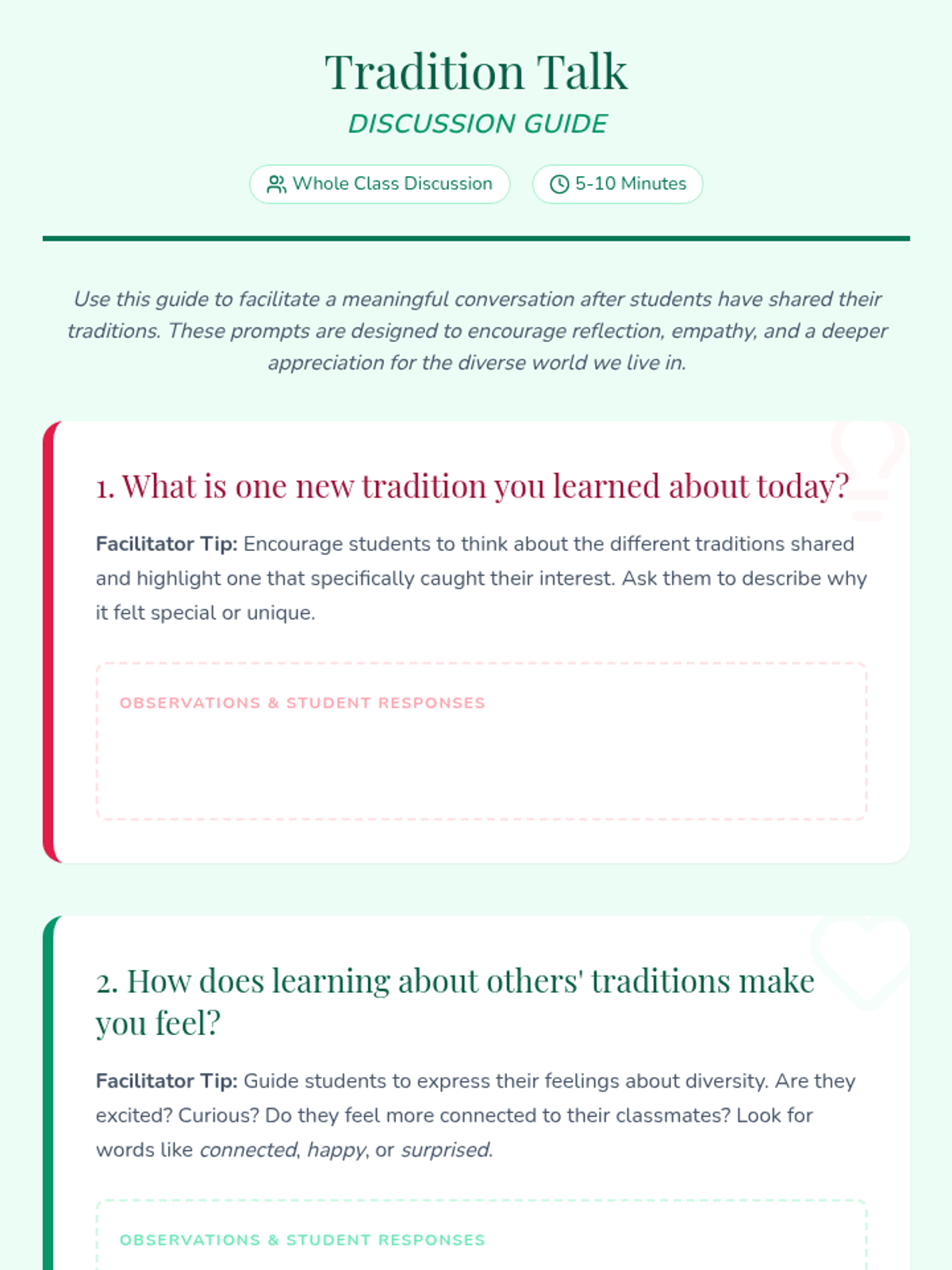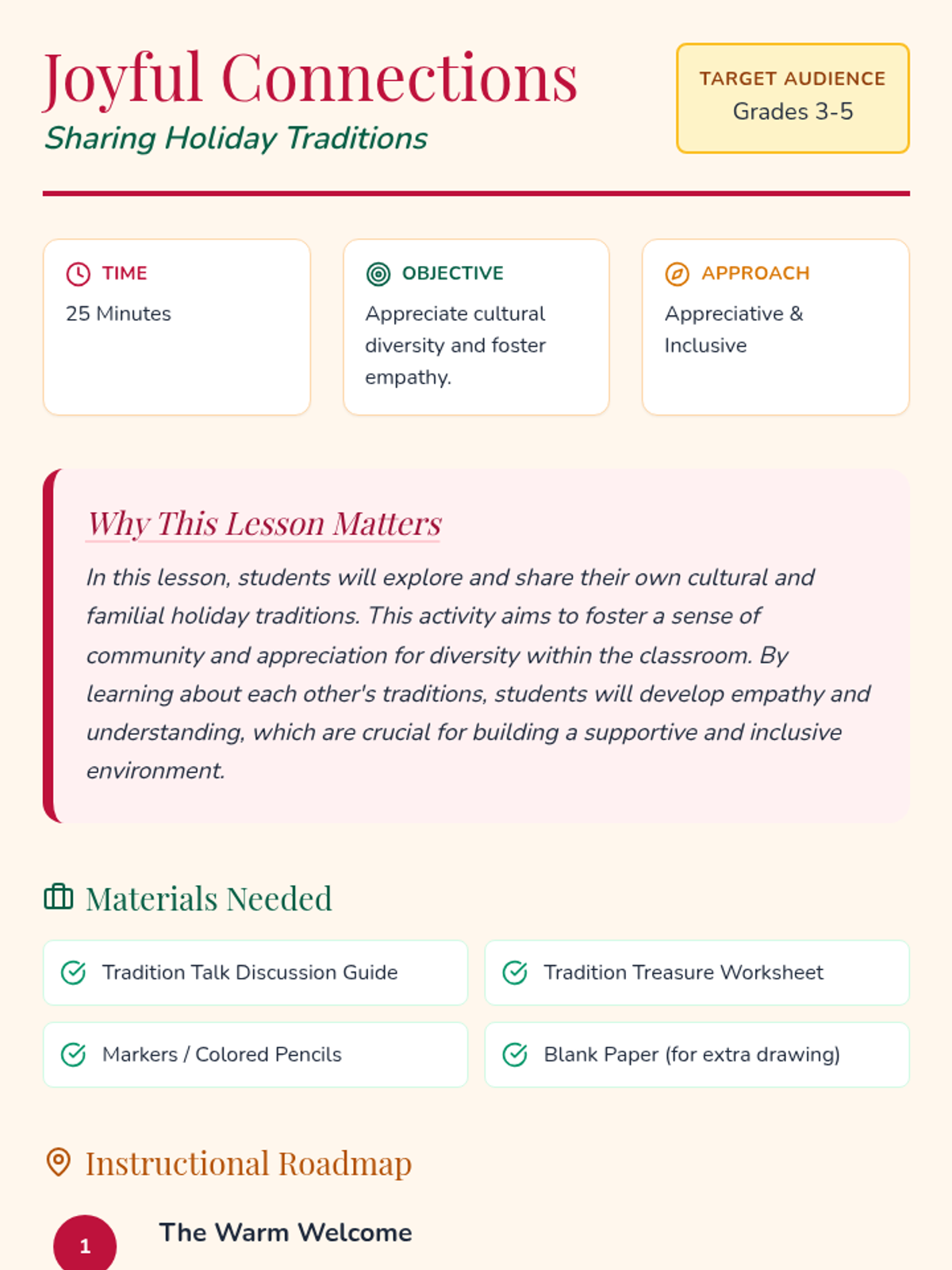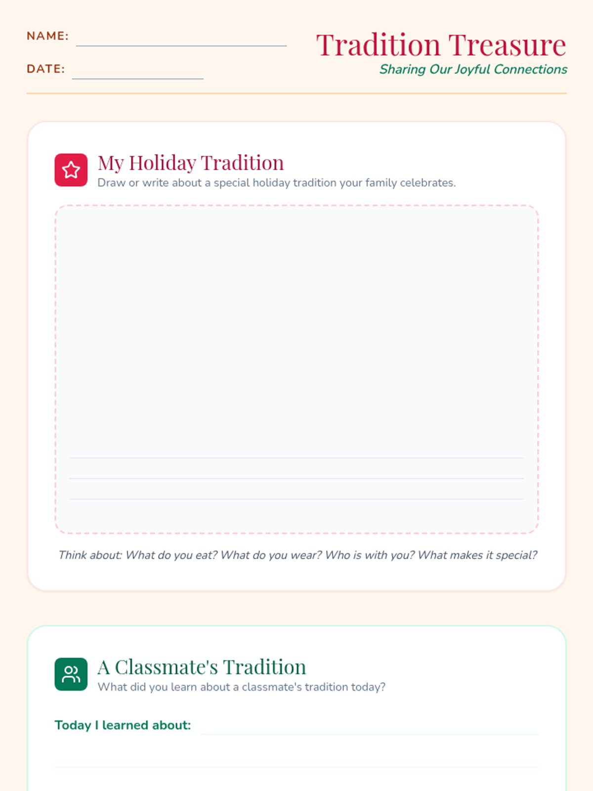 A lesson designed to foster community and cultural appreciation by having students share and explore familial holiday traditions. Students will develop empathy and understanding through guided sharing, drawing, and reflection.
