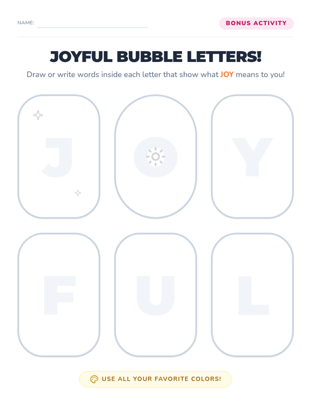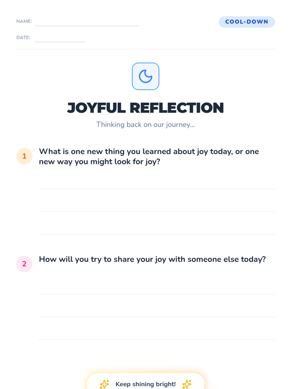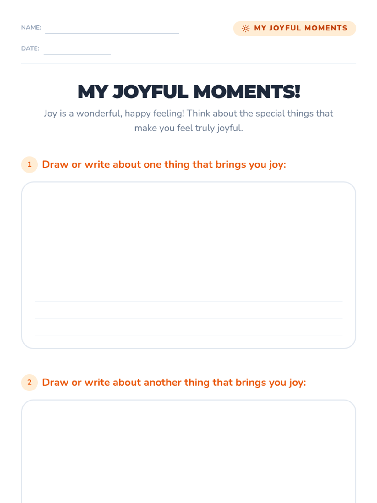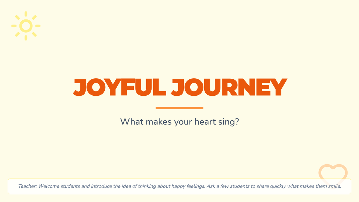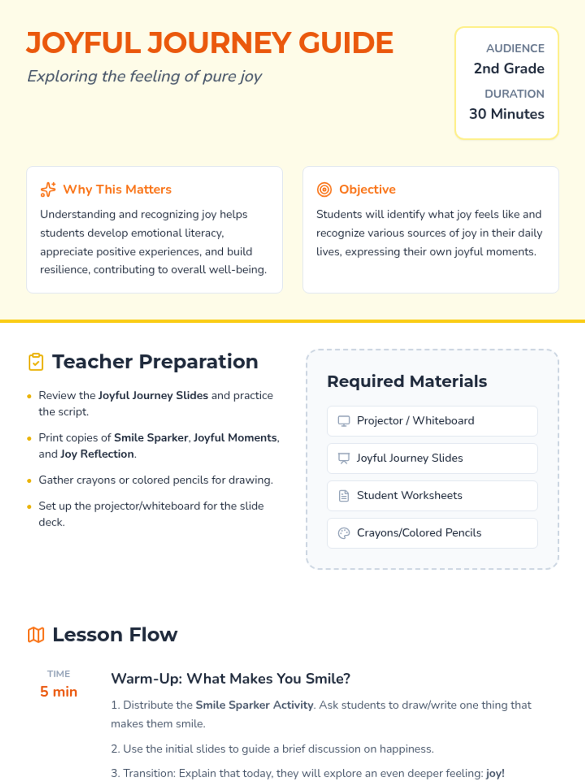 This lesson explores the feeling of joy, helping 2nd-grade students identify personal sources of happiness and physical sensations associated with joy through discussion and creative expression.