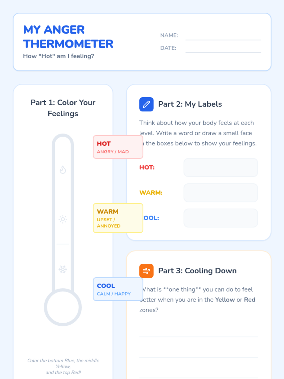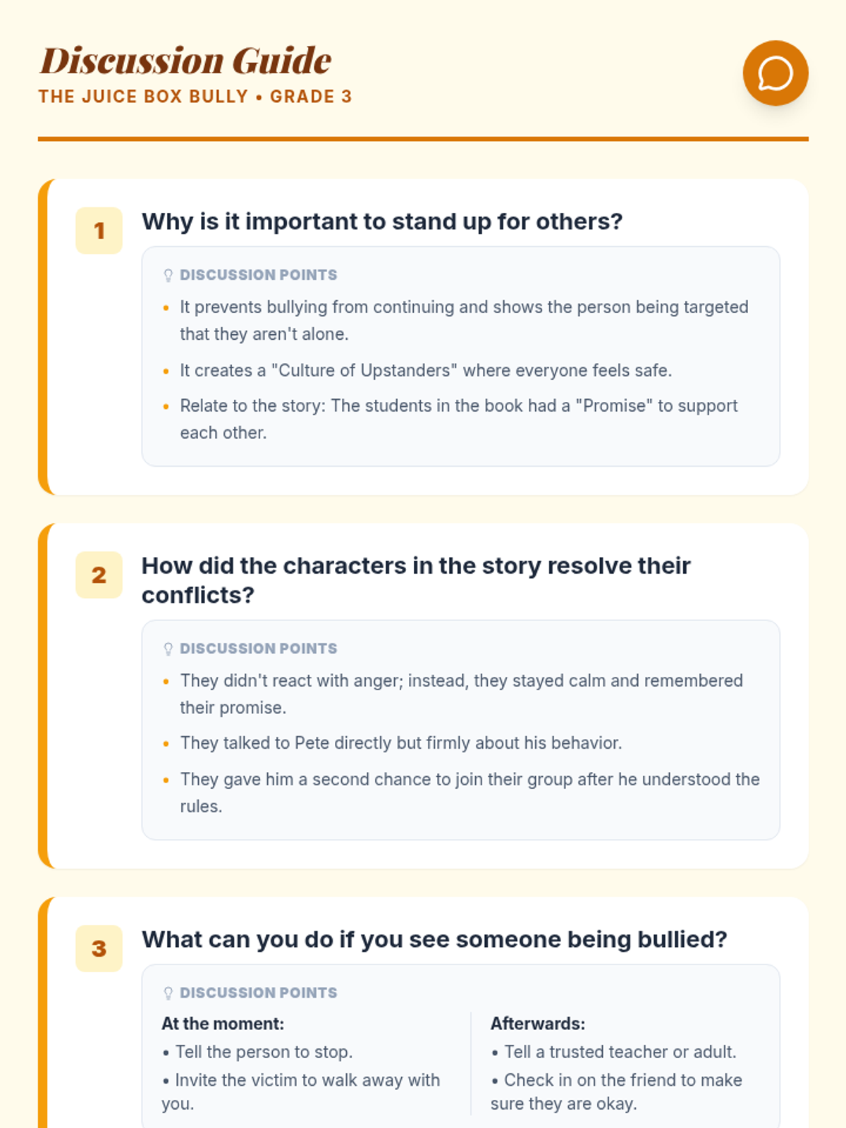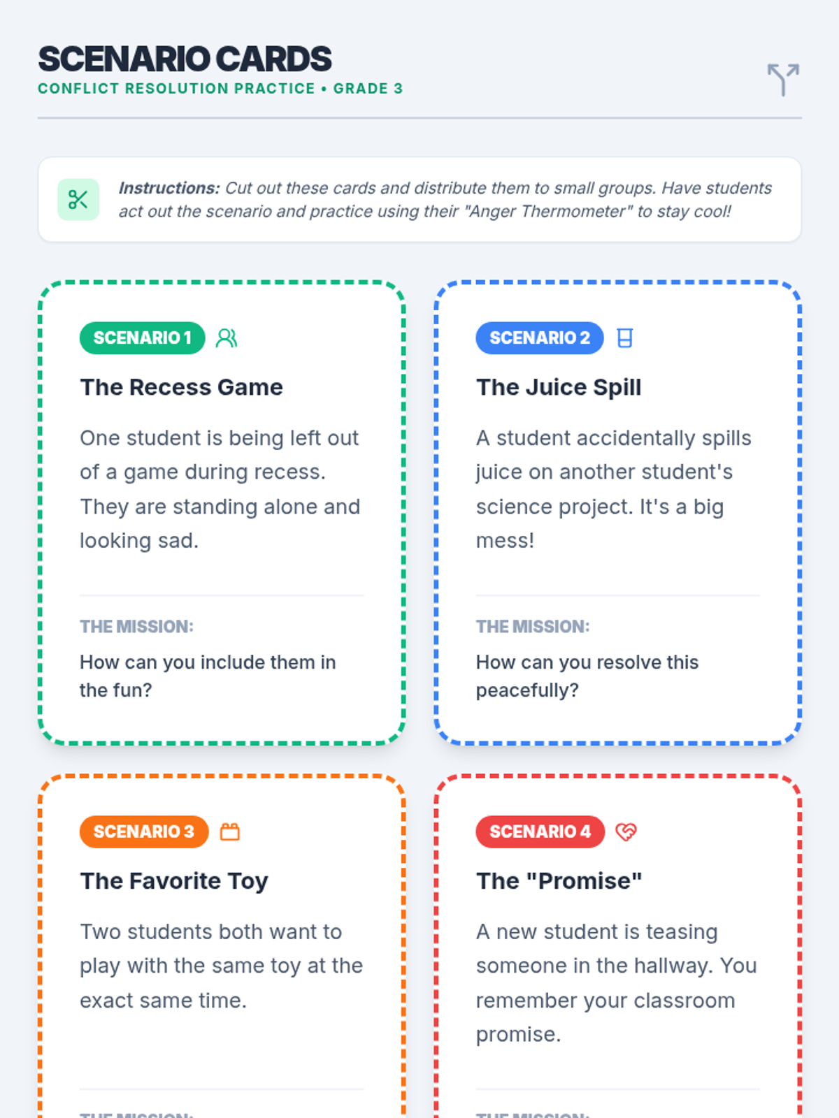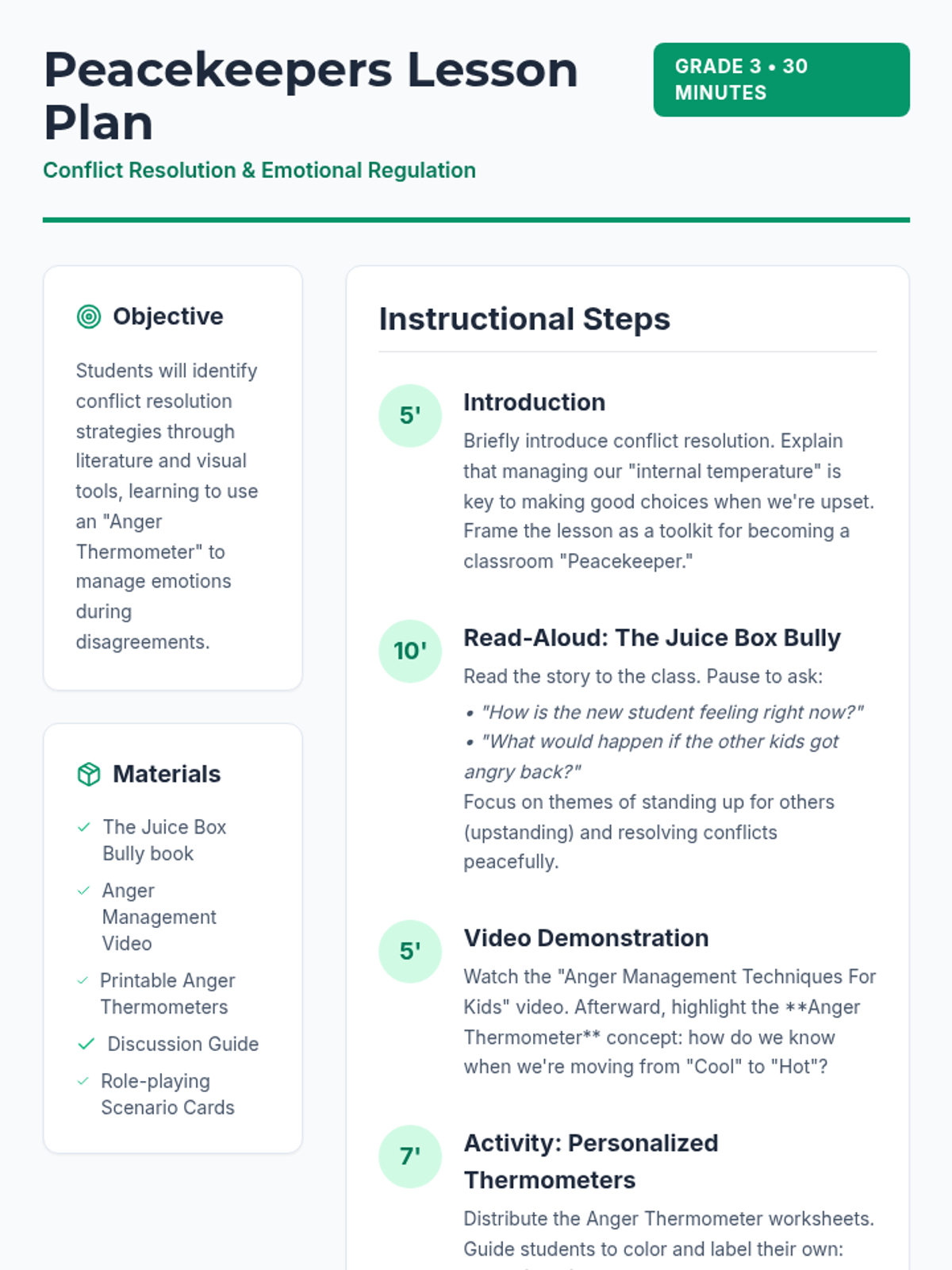 A comprehensive lesson for 3rd graders focused on conflict resolution and emotional regulation using 'The Juice Box Bully' and the Anger Thermometer technique. Students will learn to identify their emotional states and practice specific strategies to de-escalate conflicts peacefully.