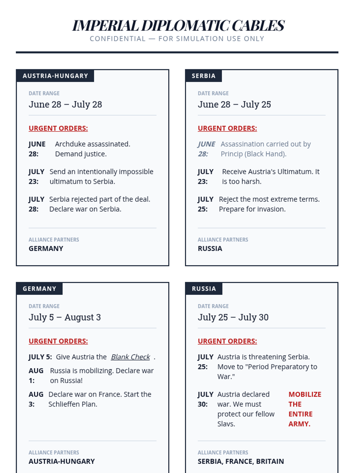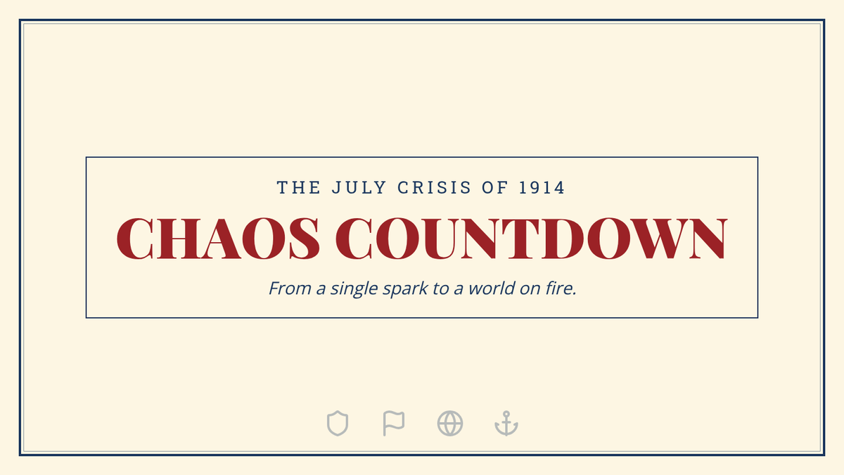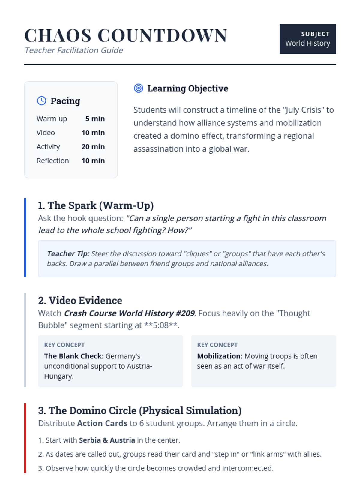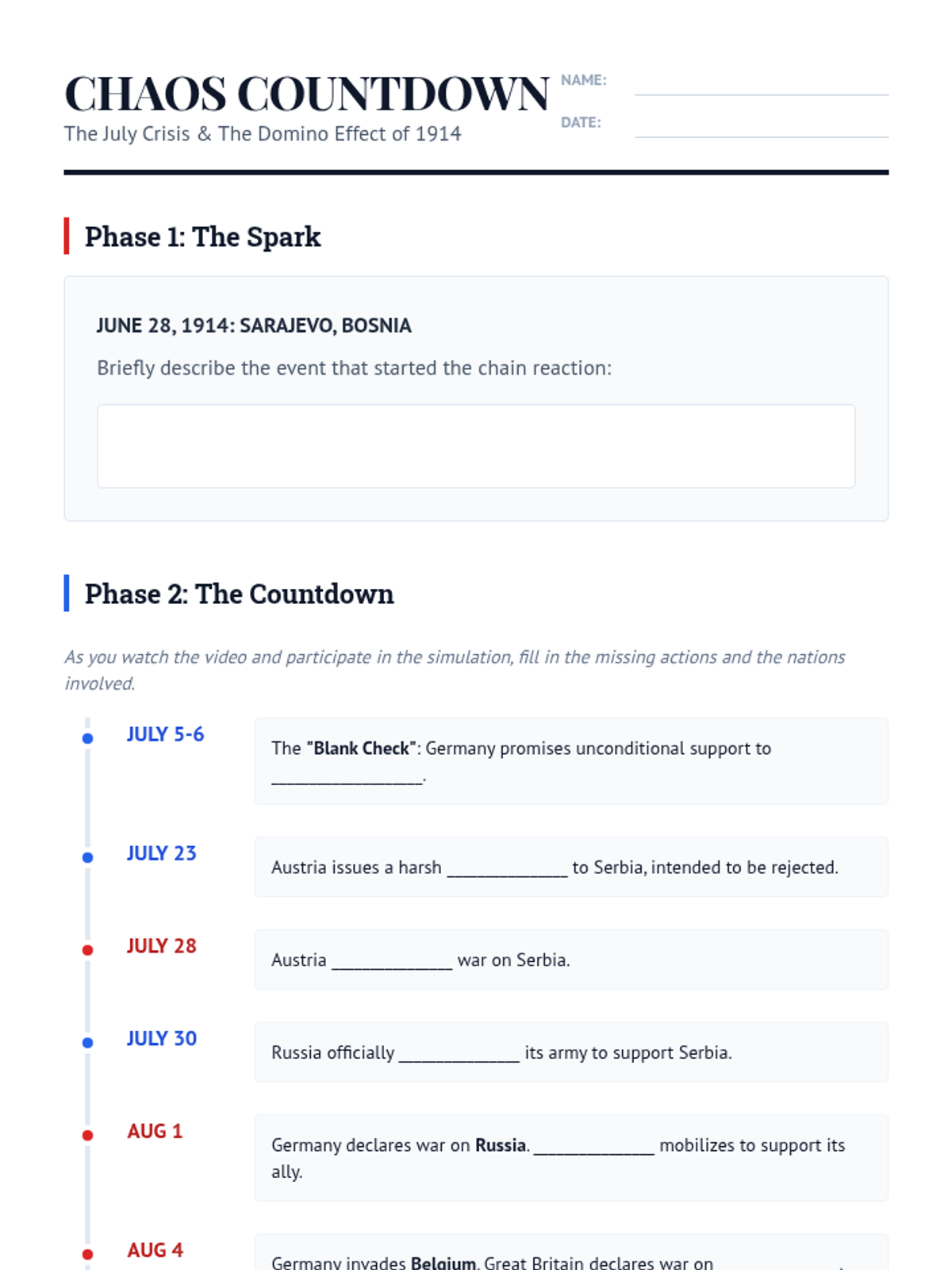 A high school history lesson exploring the 'July Crisis' of 1914. Students use a timeline and physical simulation to analyze how a localized assassination spiraled into a global conflict through alliance systems and mobilization.