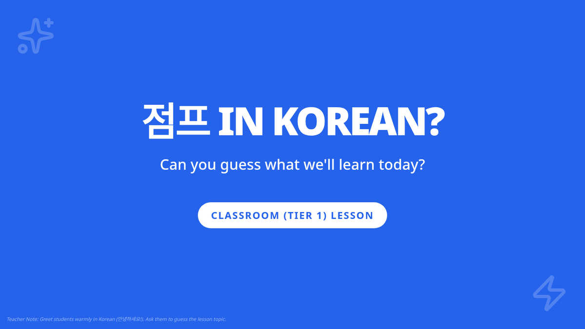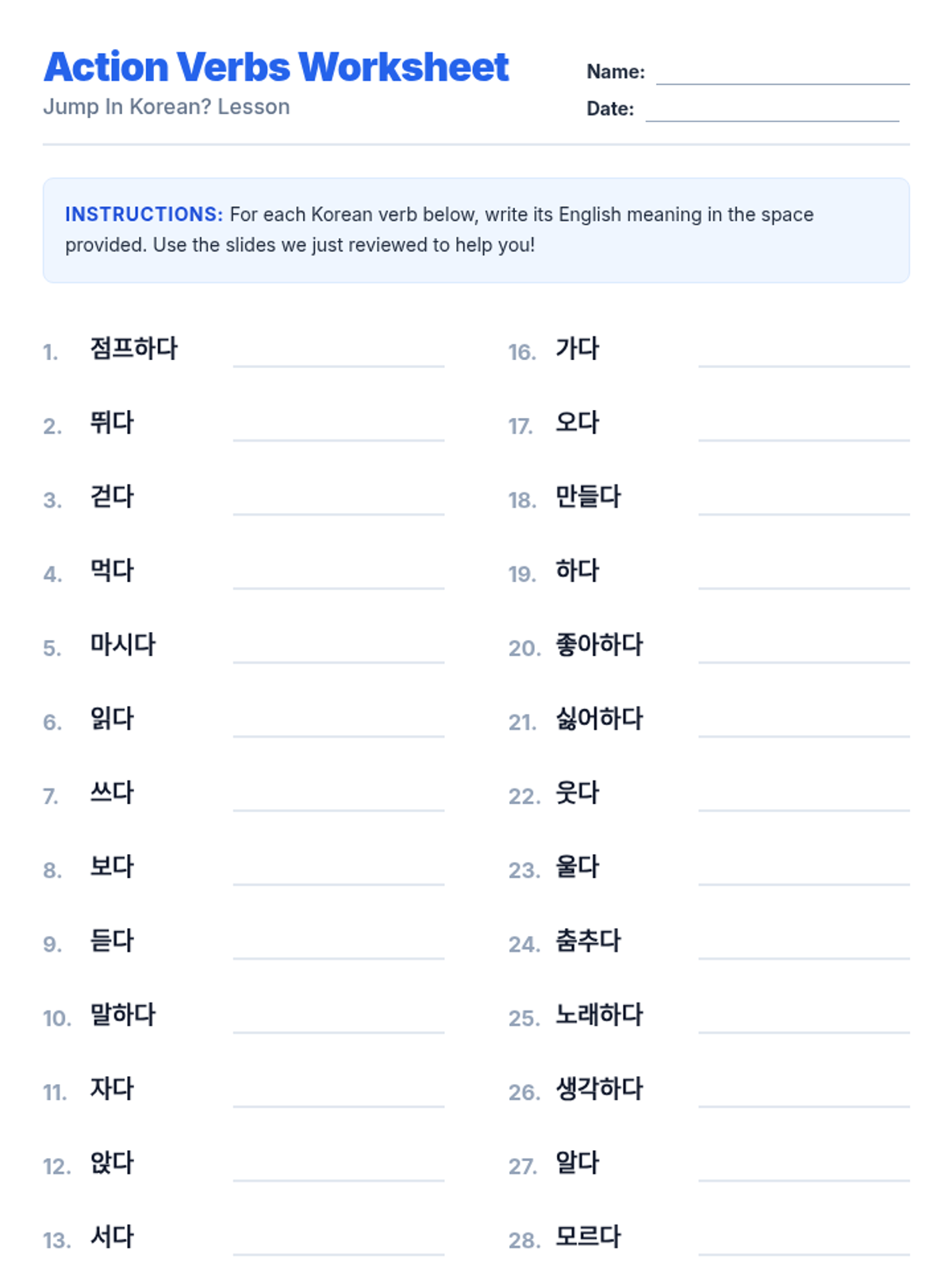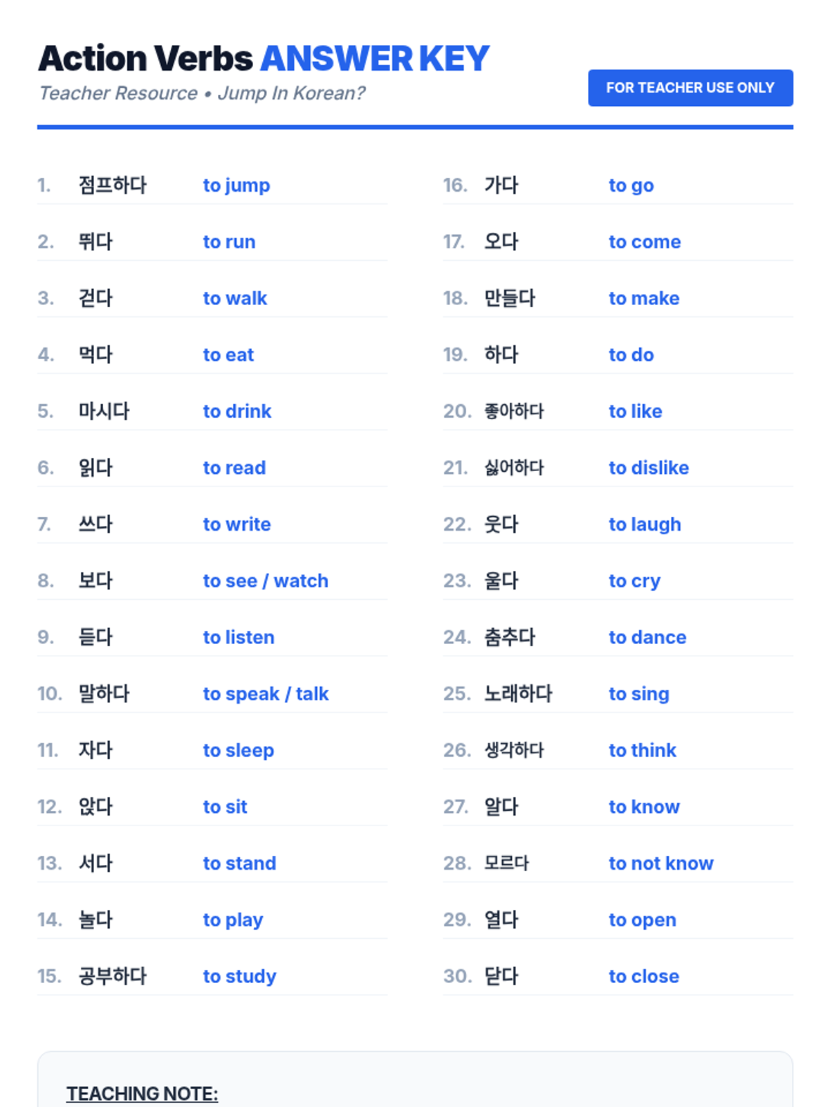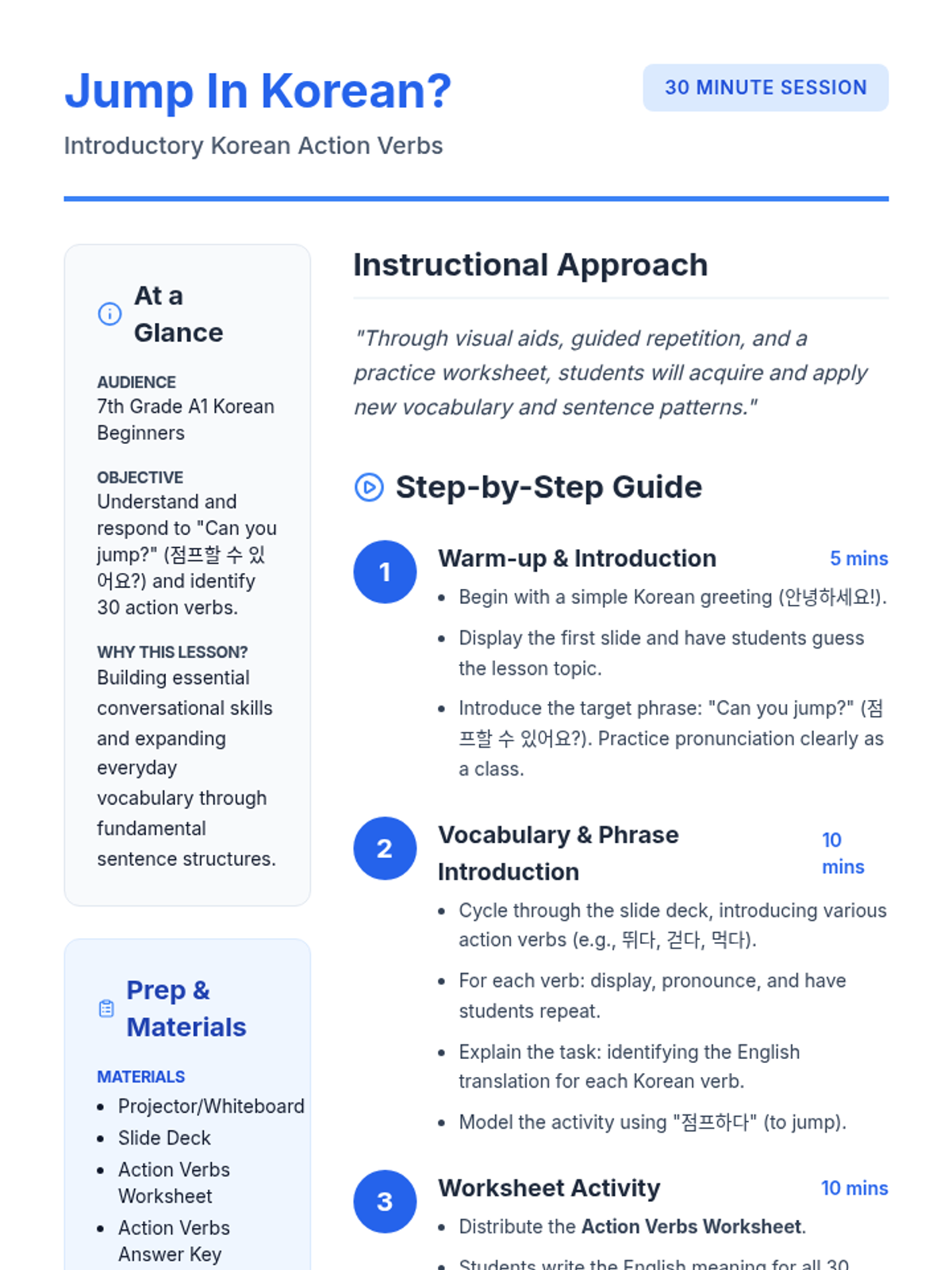 A fun, high-energy 30-minute introductory Korean lesson for 7th graders focusing on basic action verbs and the 'can you...?' sentence structure. Students will practice pronunciation and learn 30 essential verbs.
