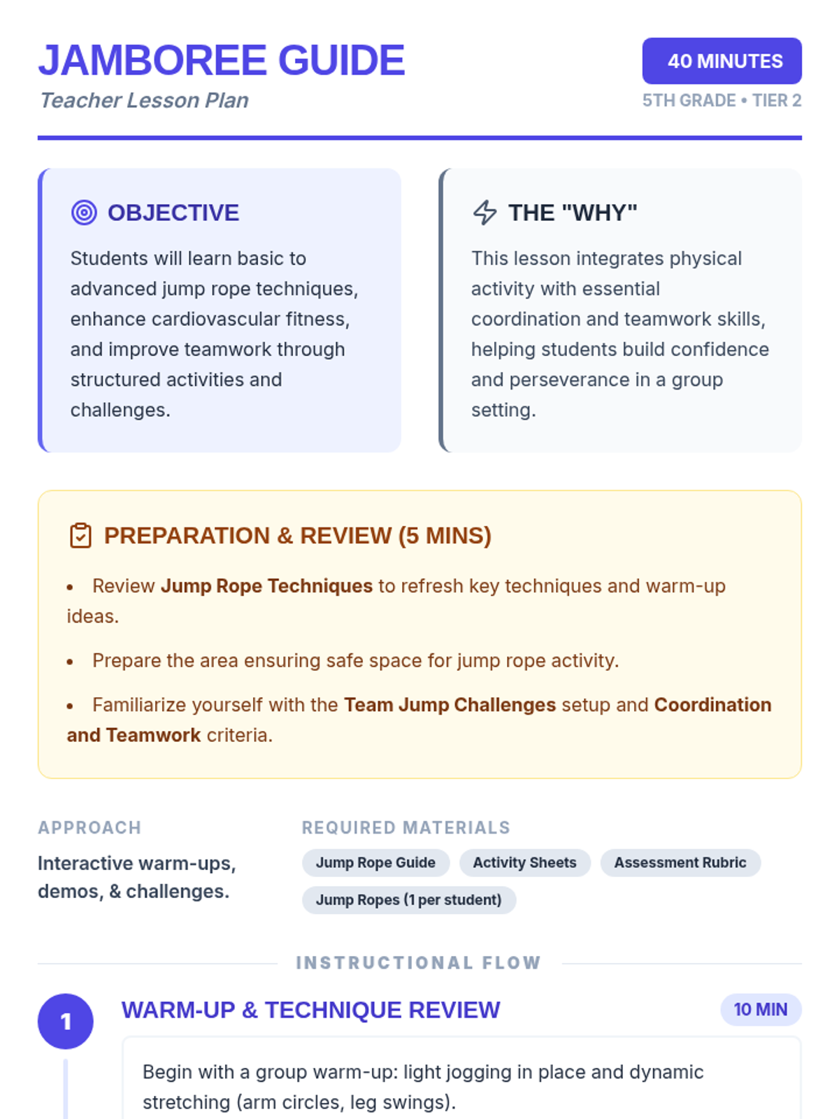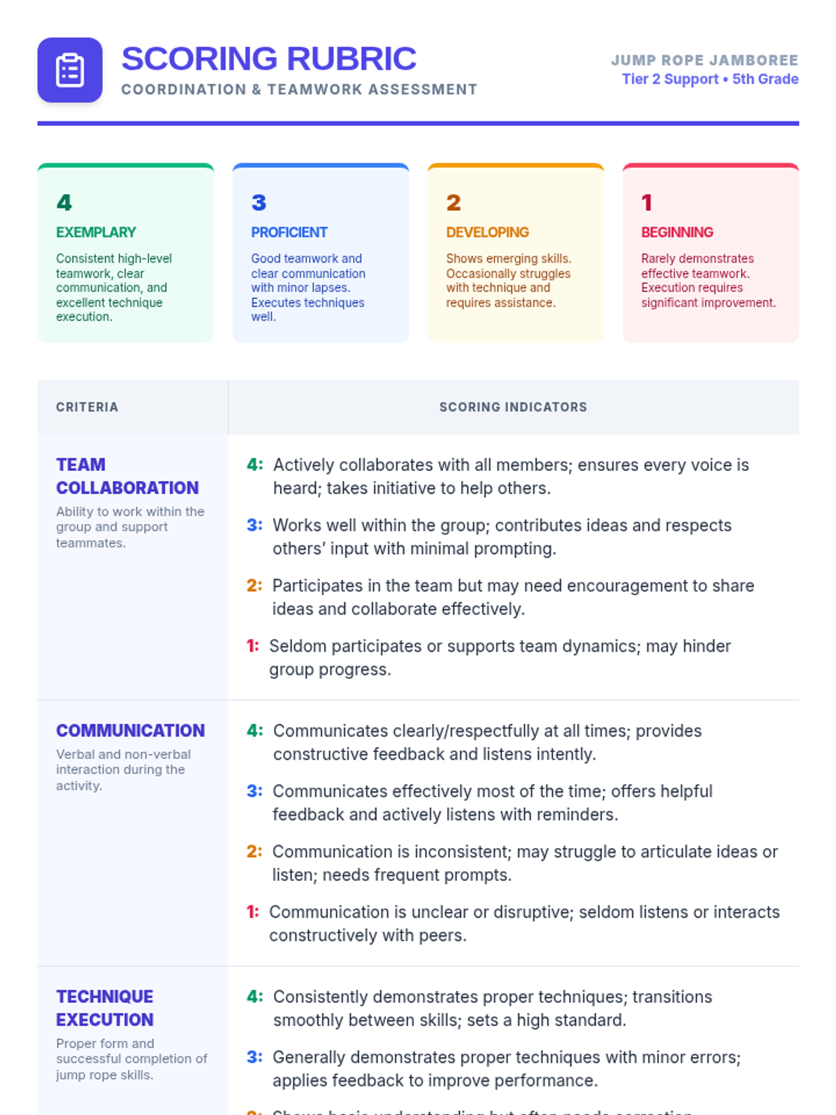 A high-energy Tier 2 PE session for 5th graders focused on building physical coordination and group collaboration through jump rope skills and relay challenges.