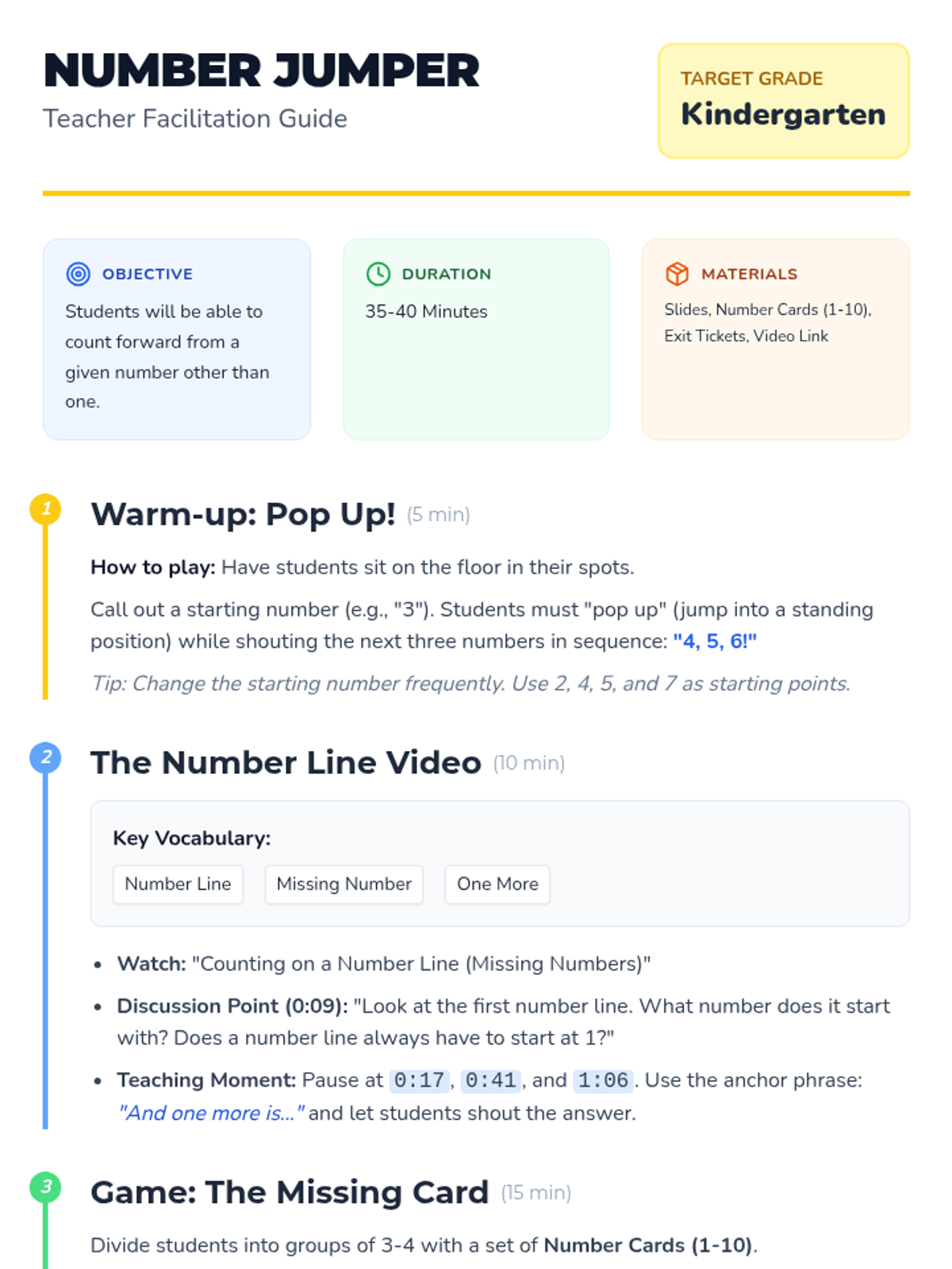 A Kindergarten math lesson where students learn to count forward from numbers other than one using a number line and interactive games.