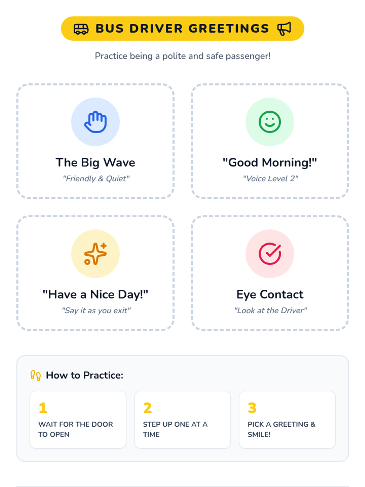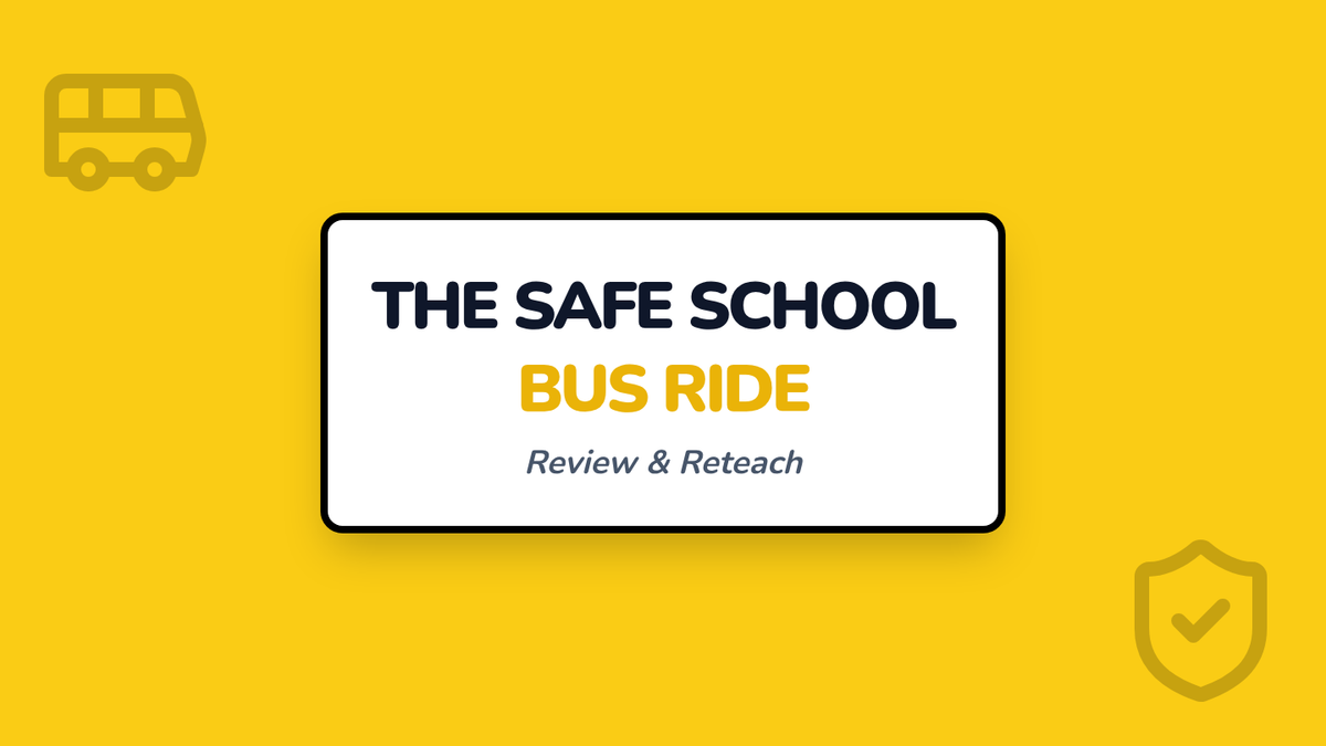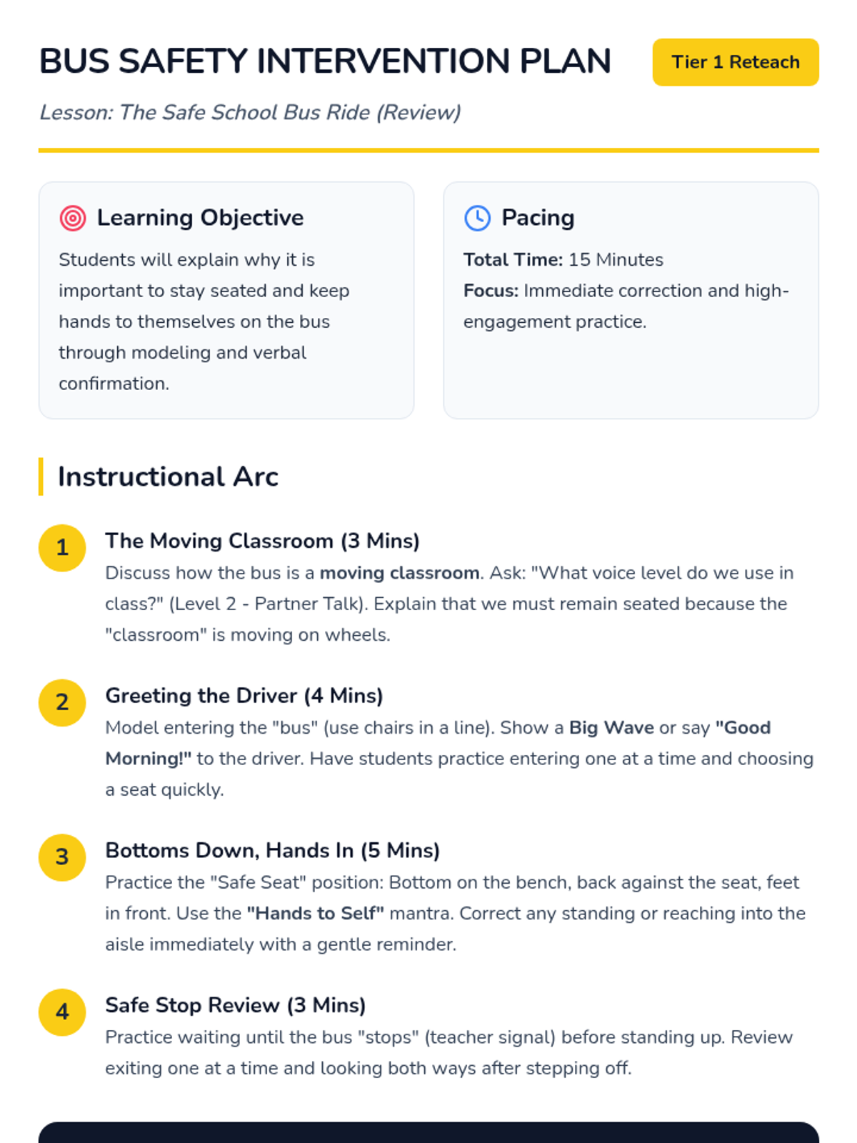 A 15-minute Tier 1 reteaching lesson for Kindergarten focusing on school bus safety, specifically staying seated, keeping hands to self, and greeting the driver.
