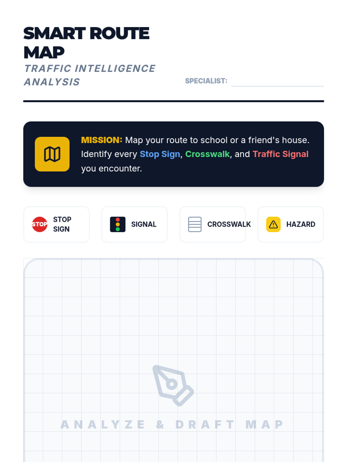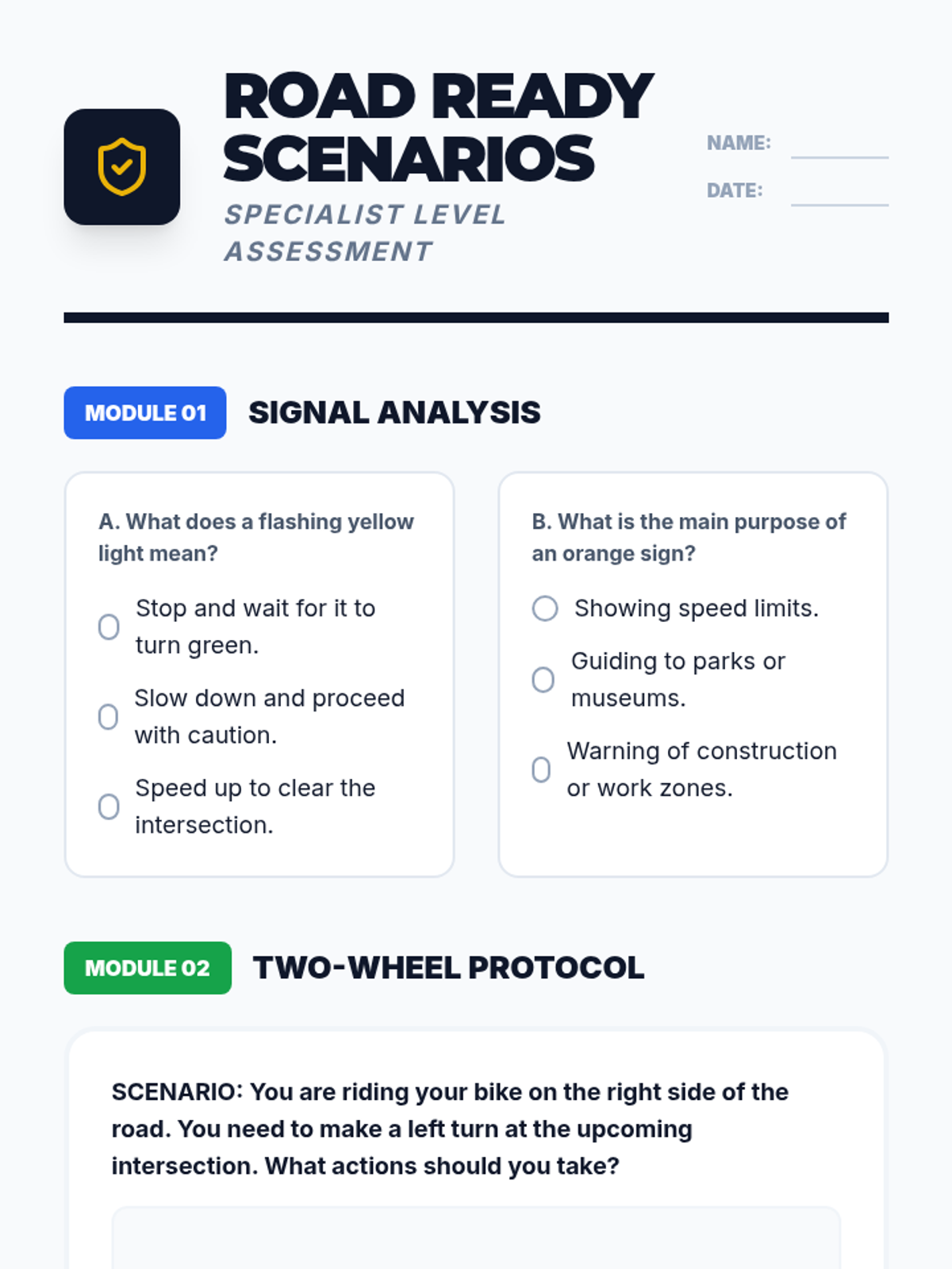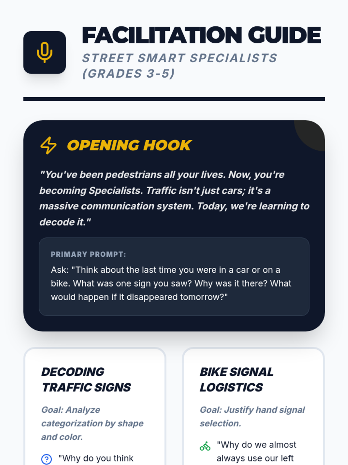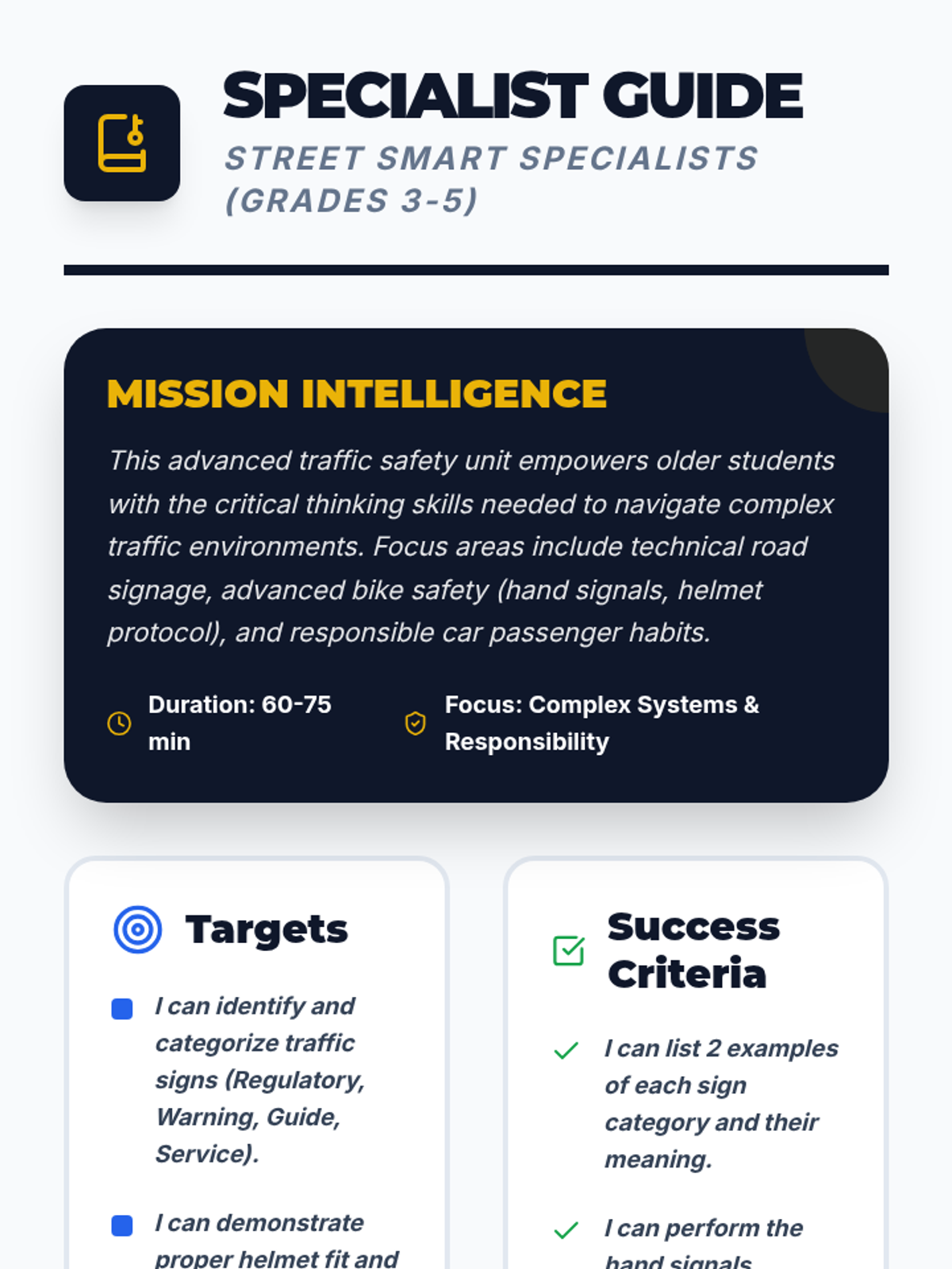 Advanced traffic safety for grades 3-5, covering traffic signs, bike safety protocols, and responsible car safety habits.