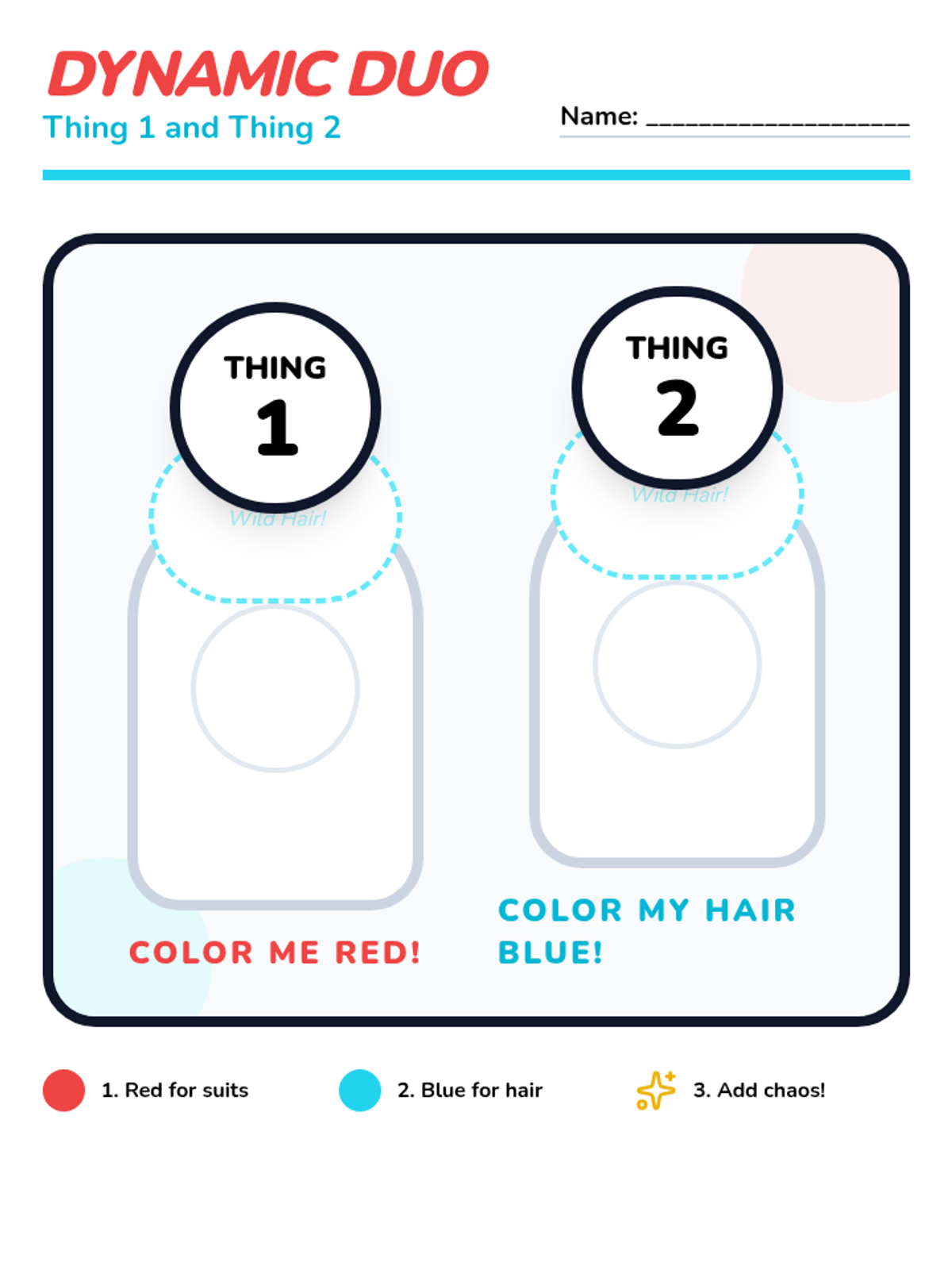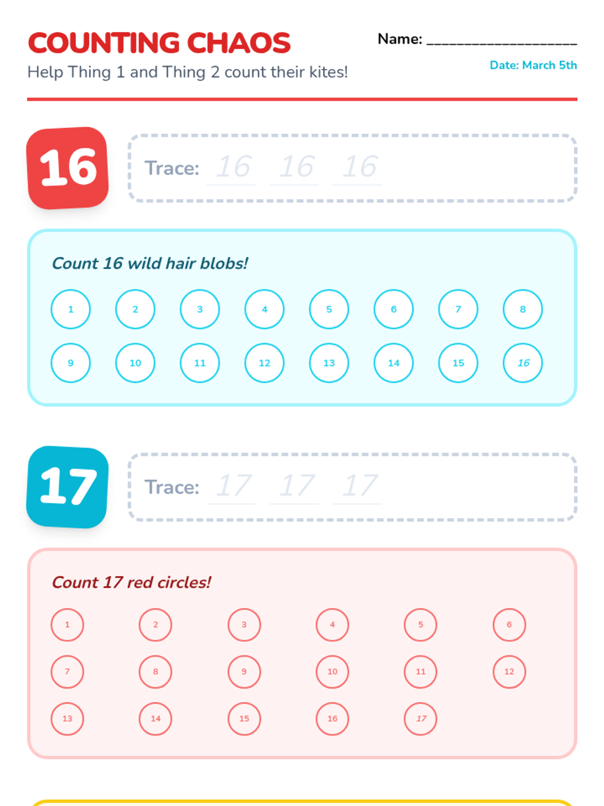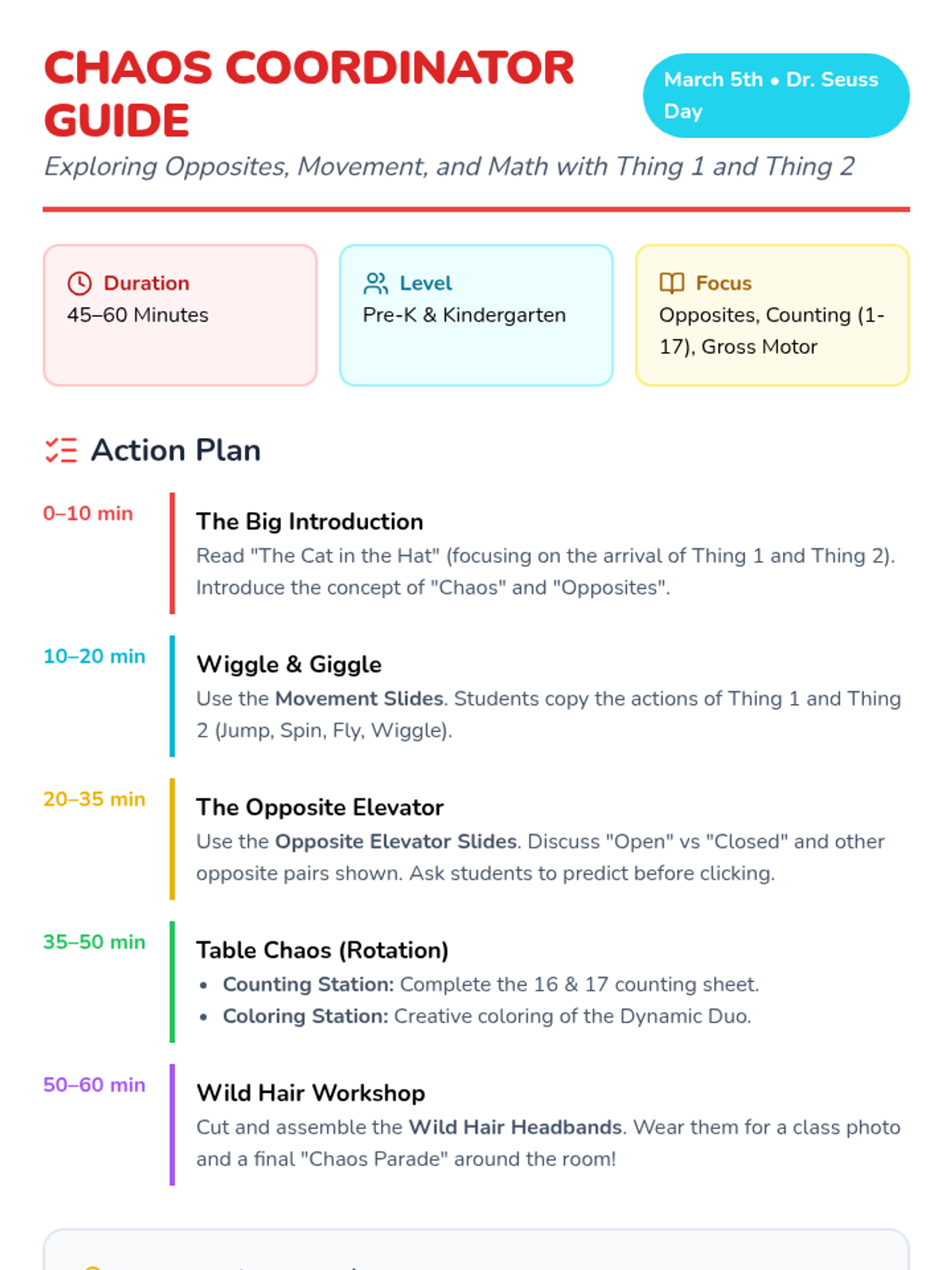 A whimsical Dr. Seuss-themed lesson for Pre-K and Kindergarten focusing on movement, opposites, counting to 17, and creative crafts inspired by Thing 1 and Thing 2.