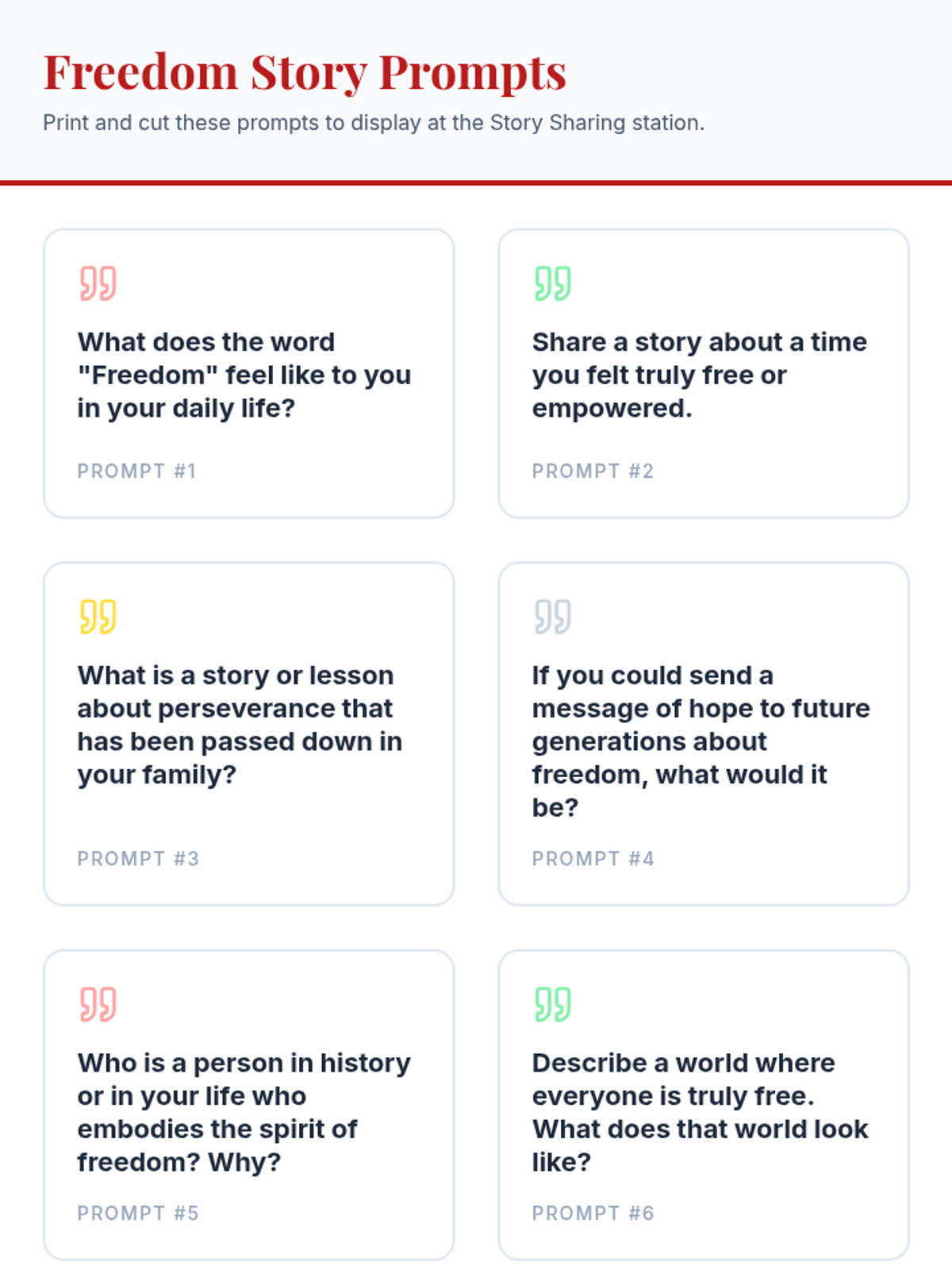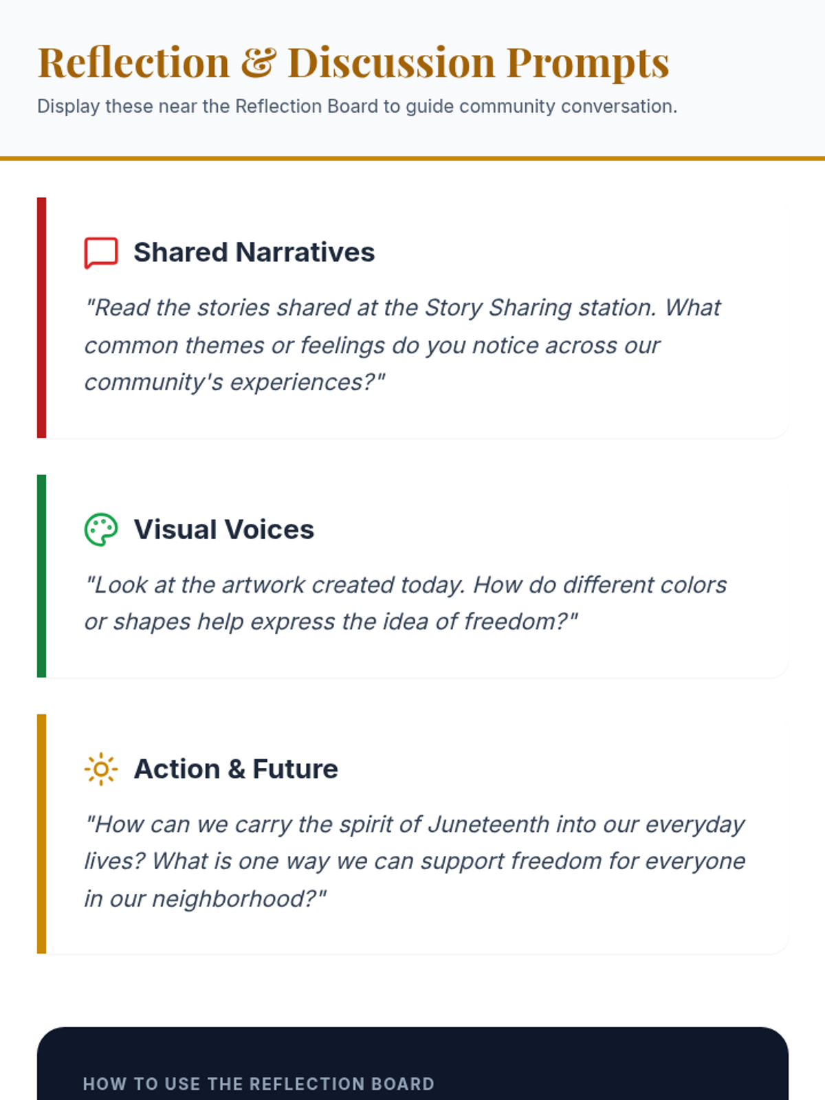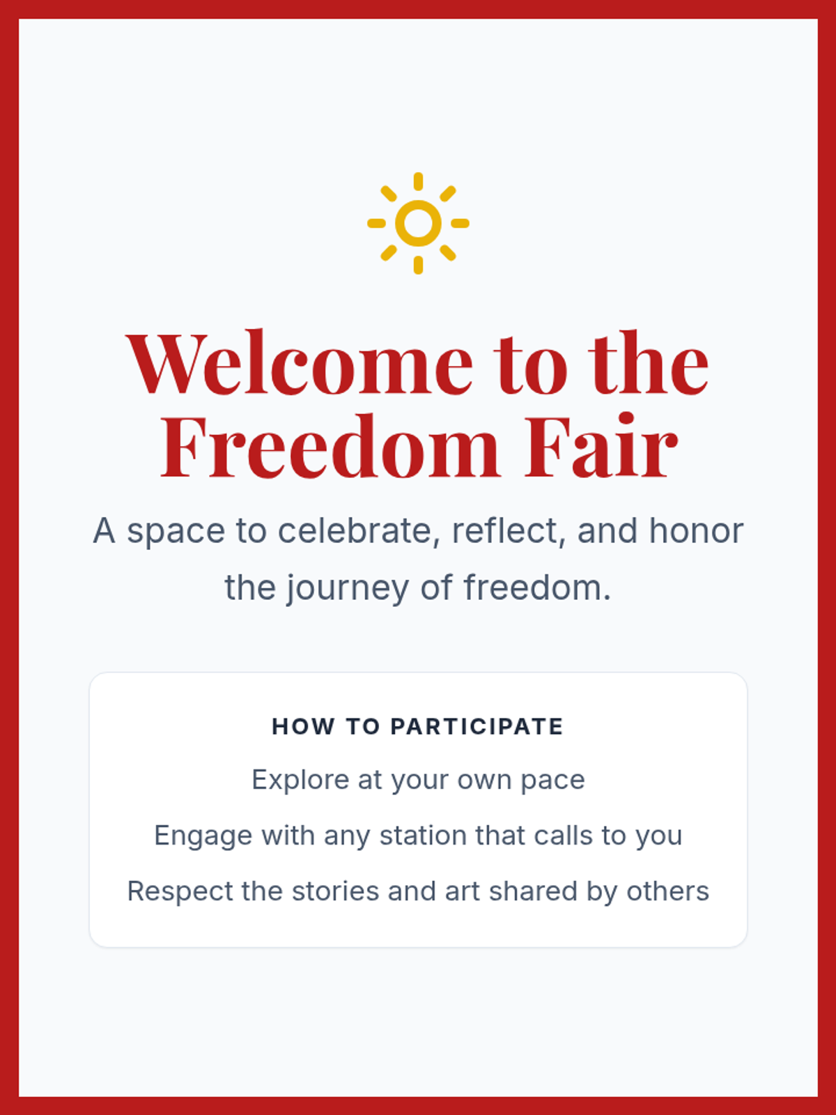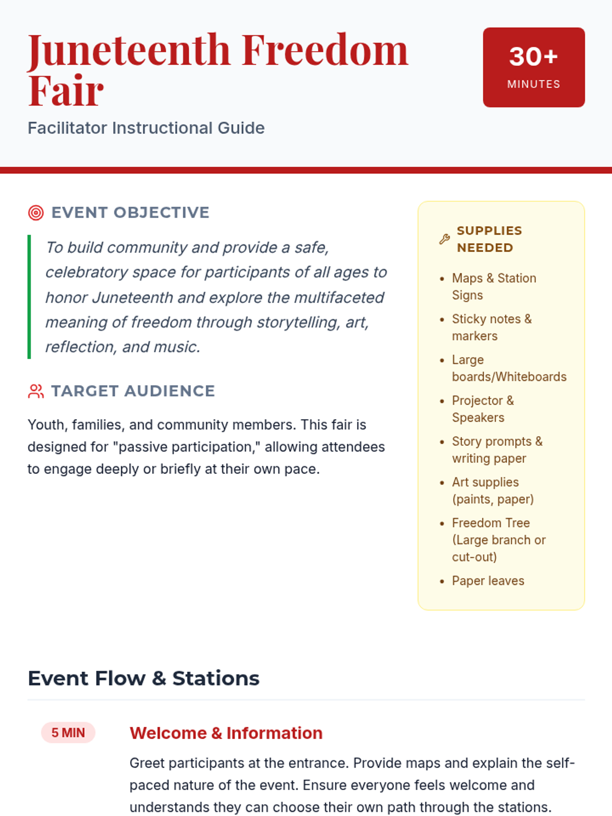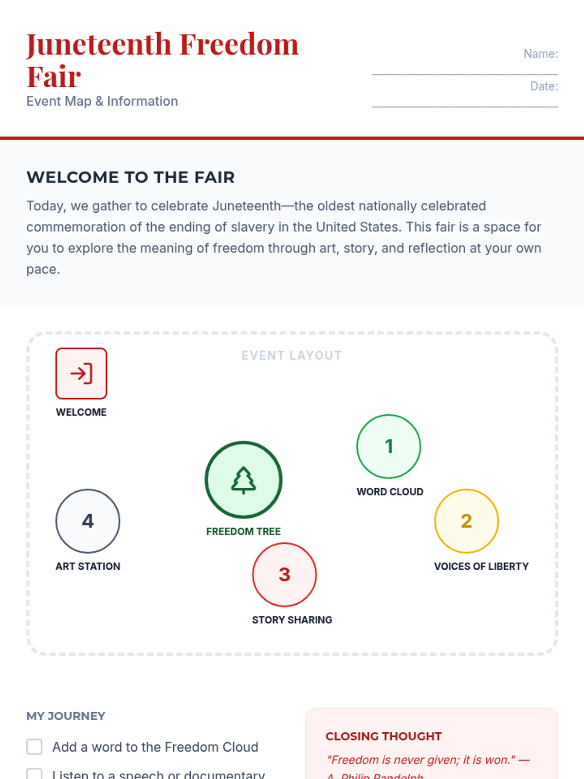 A community celebration event featuring various interactive stations focused on storytelling, art, and reflection to honor Juneteenth and the concept of freedom.