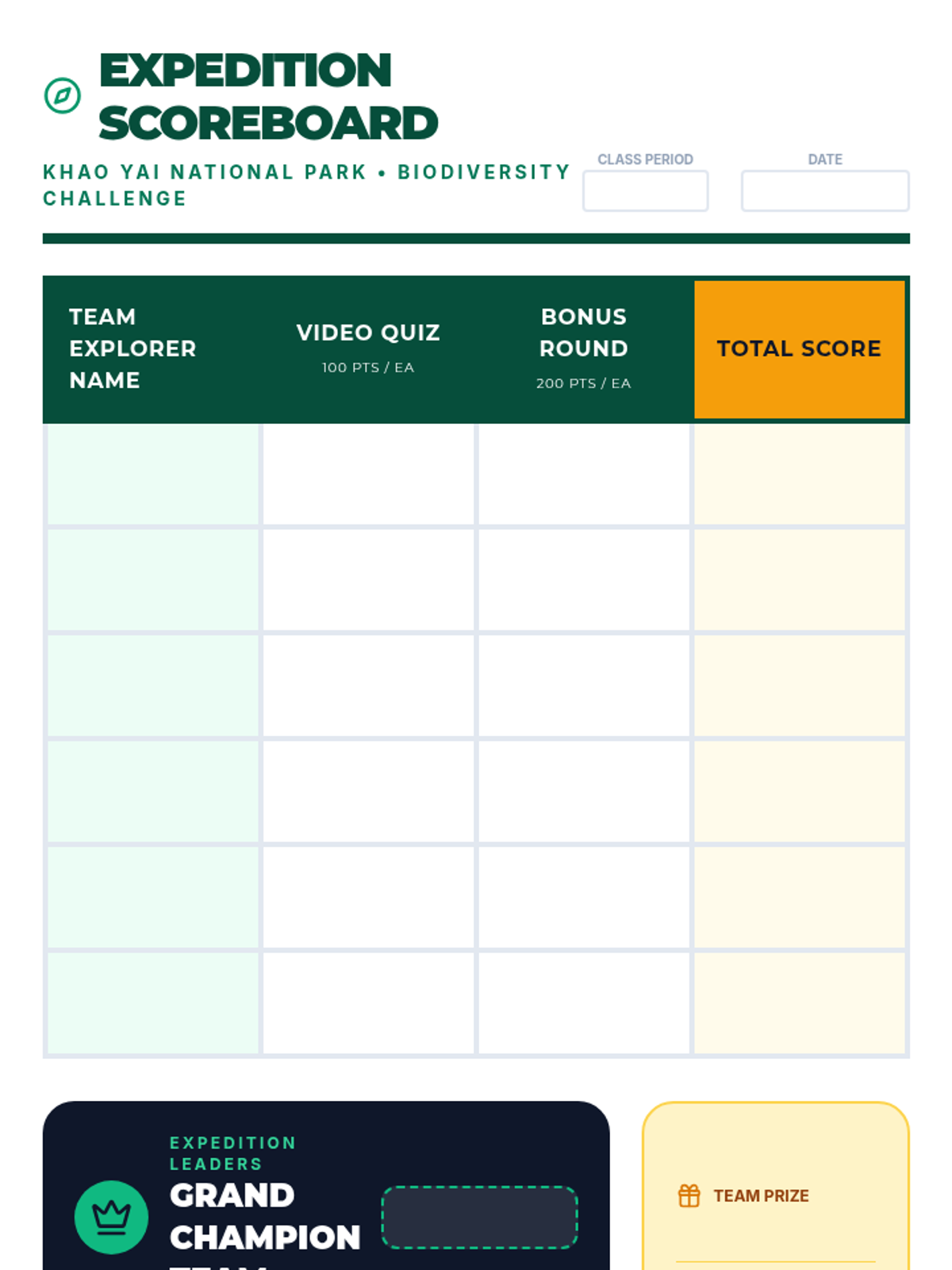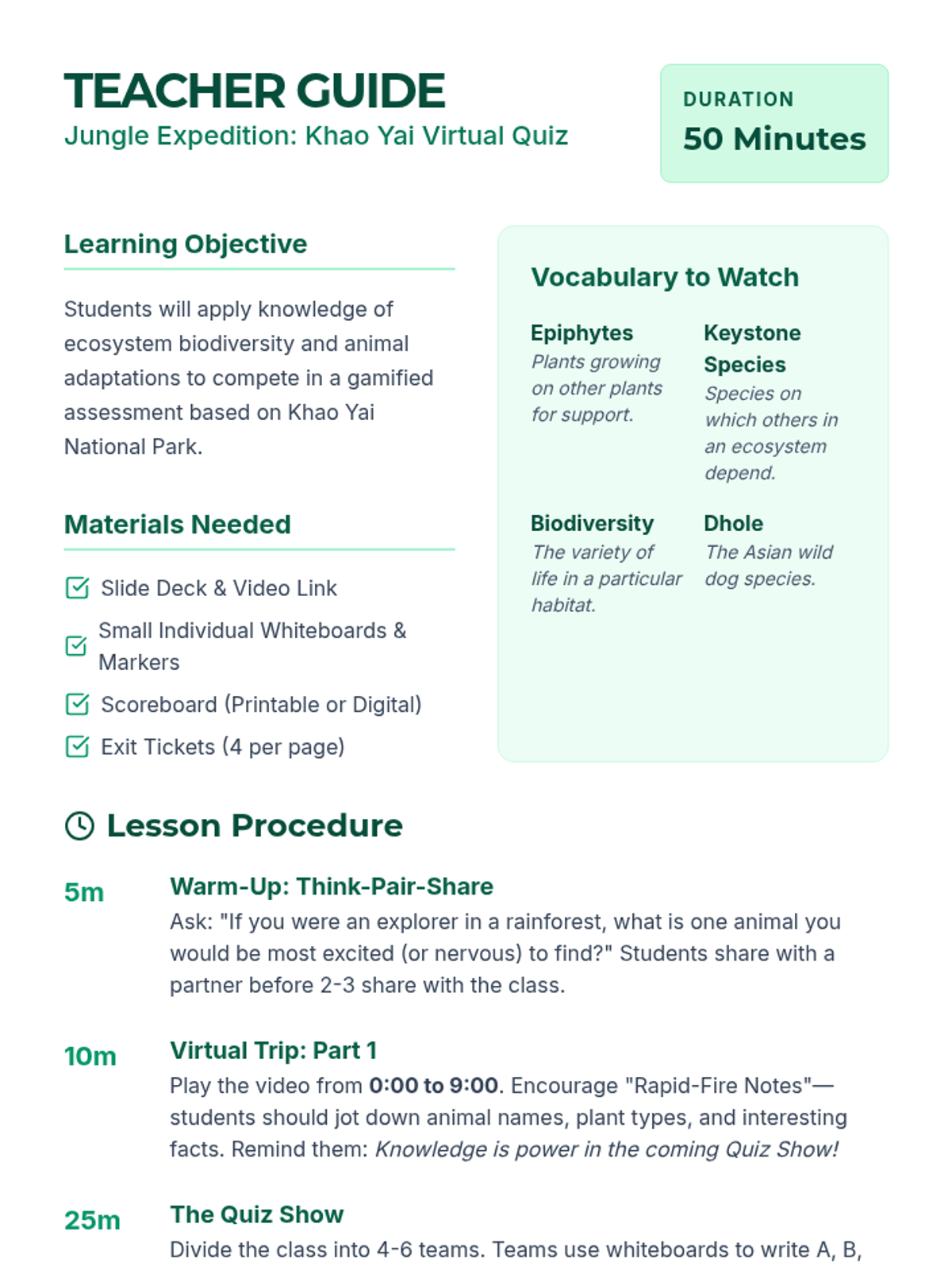 An immersive lesson where students explore the biodiversity of Khao Yai National Park through a virtual field trip and compete in a high-energy 'Quiz Show' to test their ecosystem knowledge.