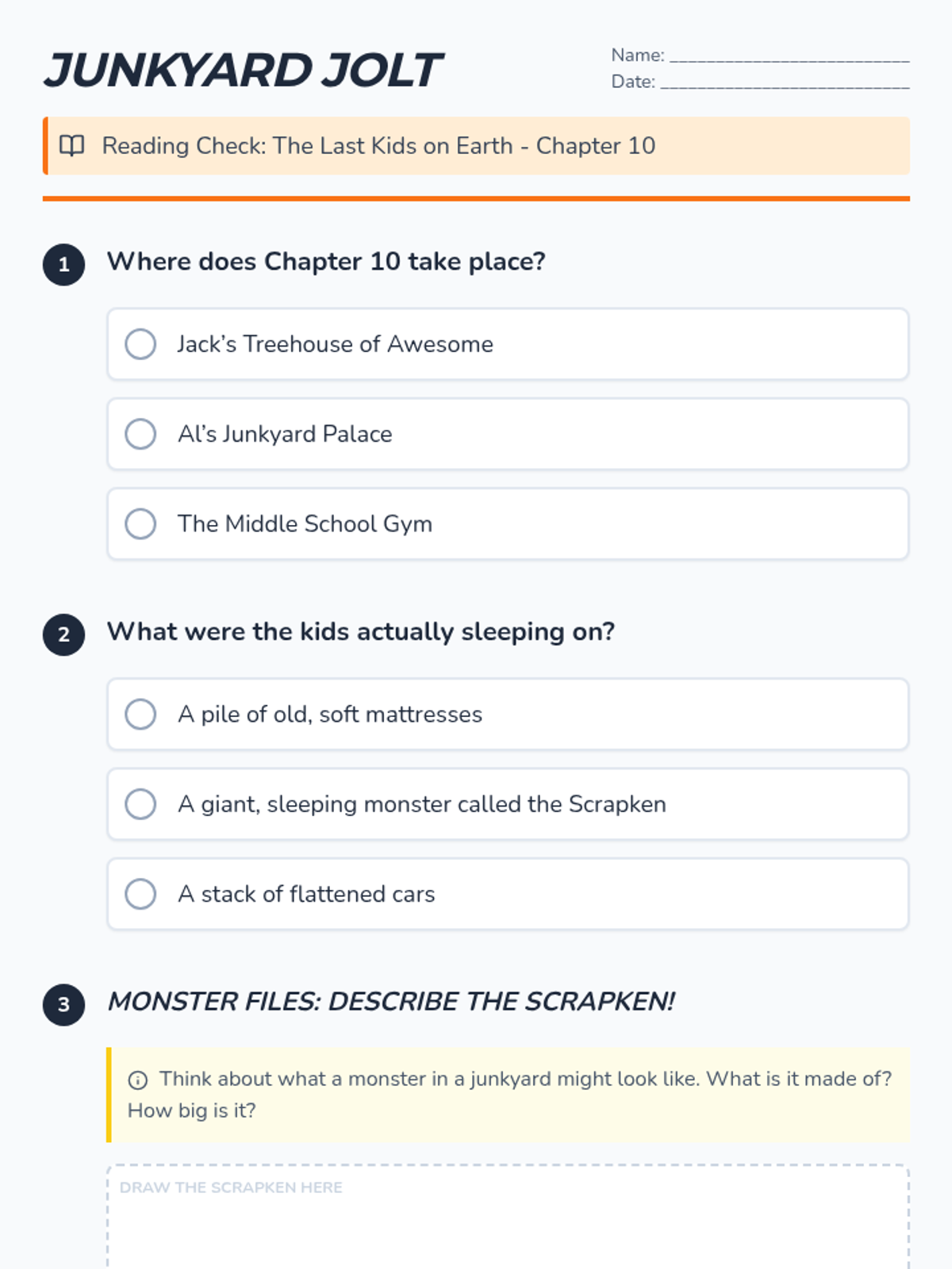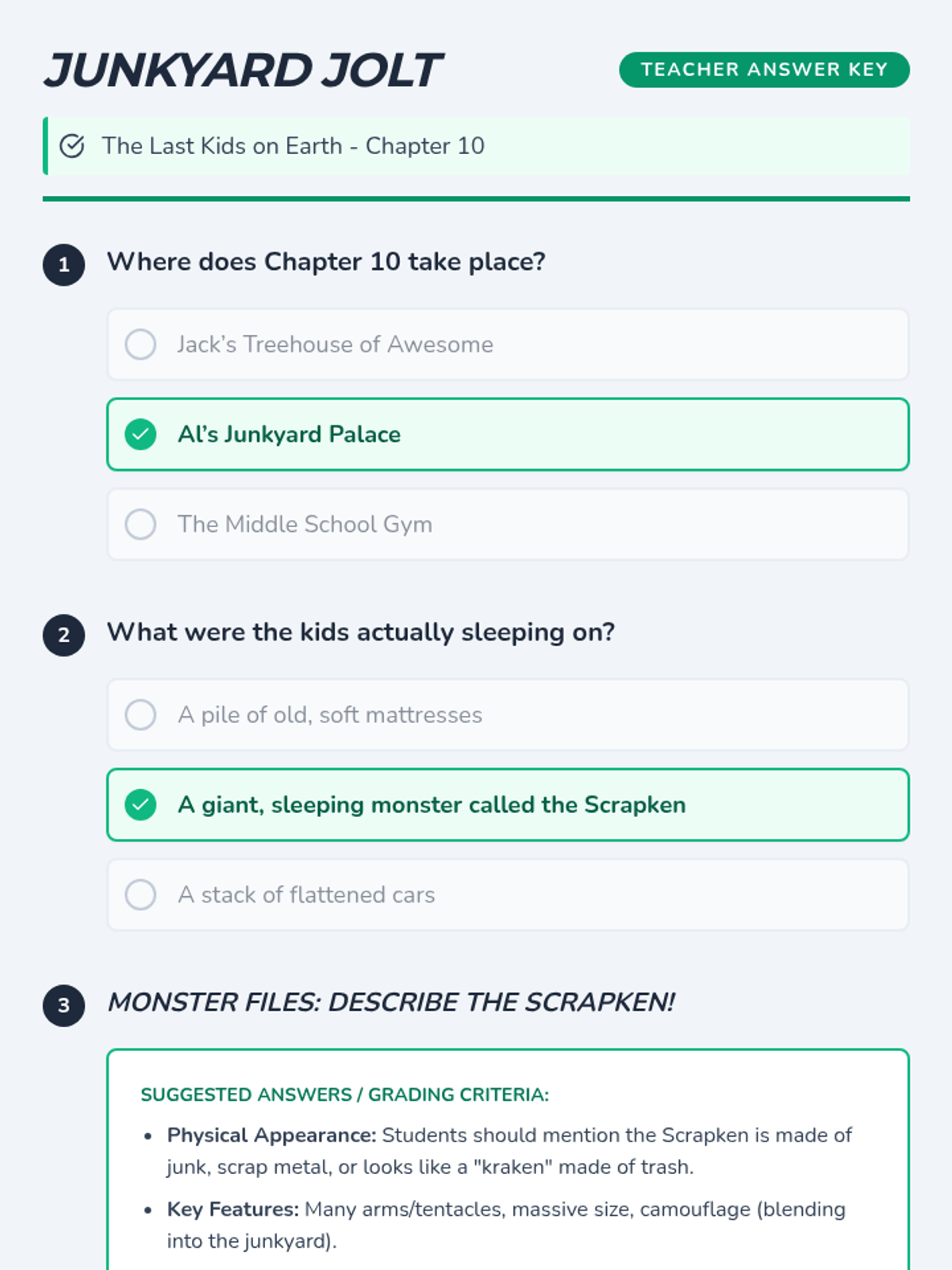 A comprehension-focused lesson on Chapter 10 of 'The Last Kids on Earth', focusing on the setting of Al's Junkyard Palace and the discovery of the Scrapken.