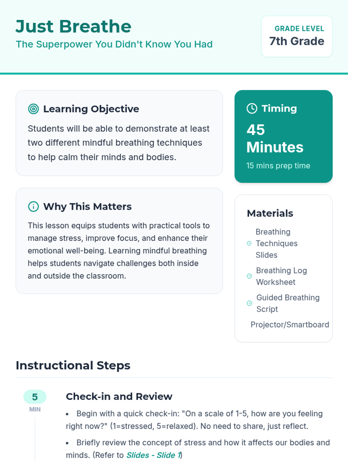 An introductory mindfulness lesson for 7th graders that teaches the science and practice of belly breathing and square breathing as tools for emotional regulation.