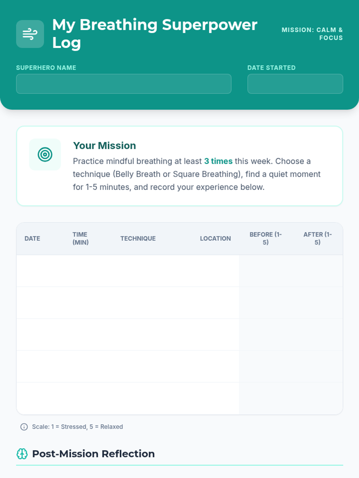 Teaches emotional regulation through the Notice-Name-Breathe method and building a resilience toolkit.