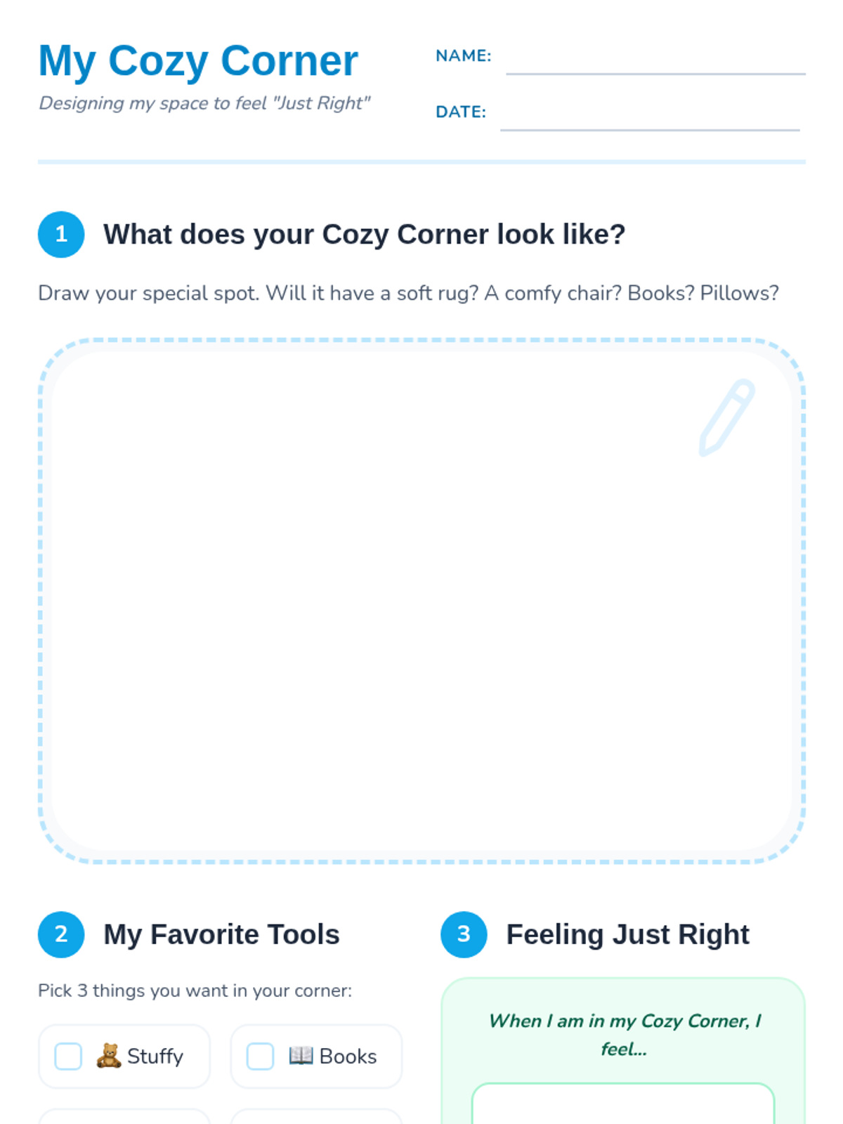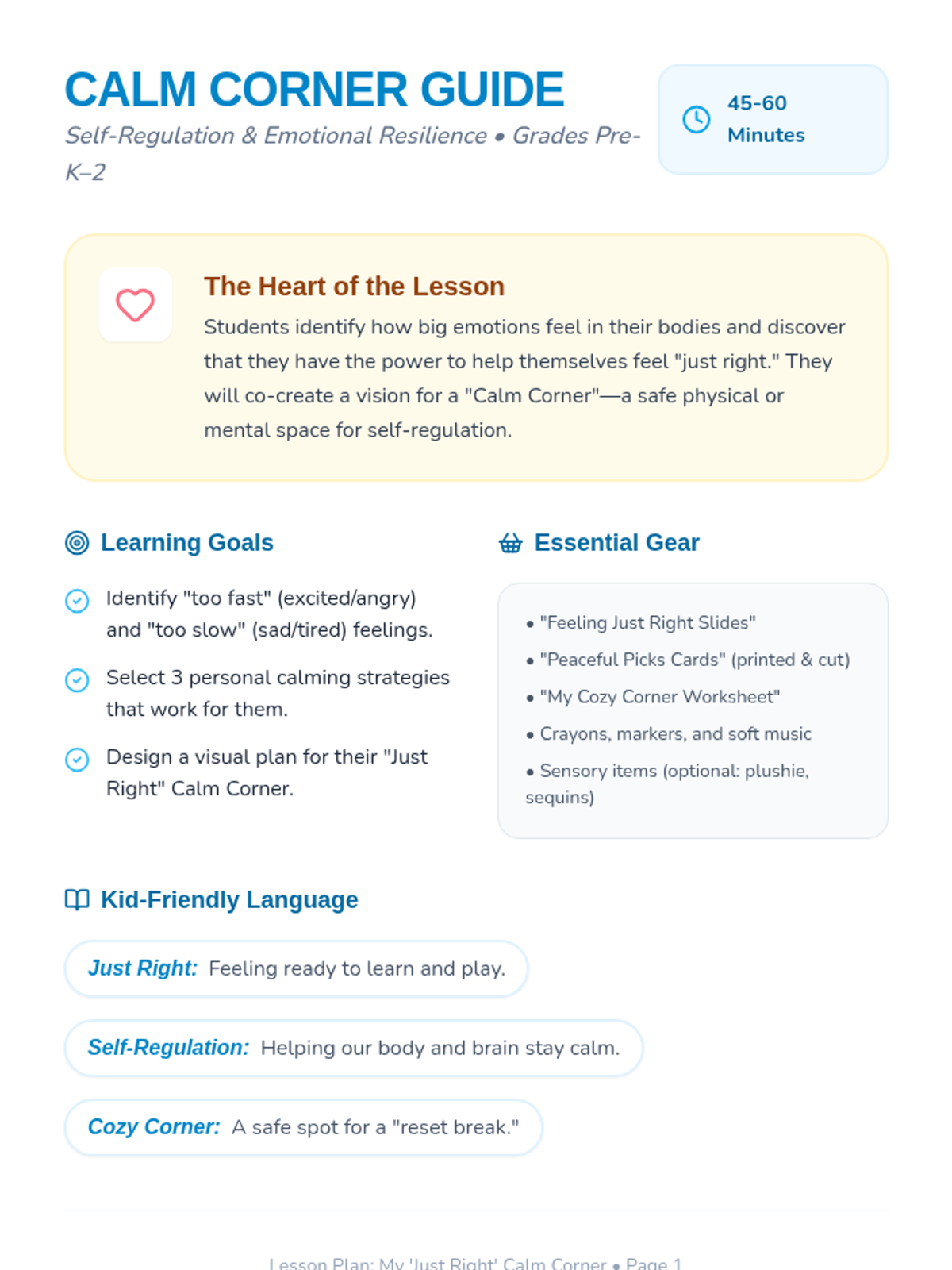 Students explore self-regulation by identifying personal calming strategies and designing a 'just right' space for managing big emotions. This lesson uses interactive discussion and creative planning to build emotional resilience in early learners.