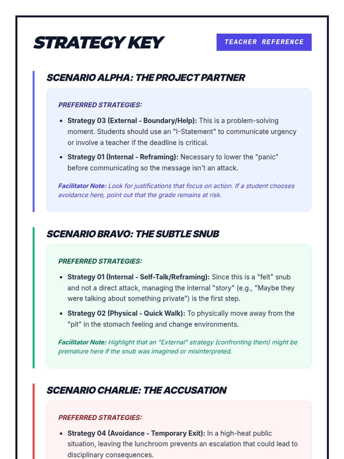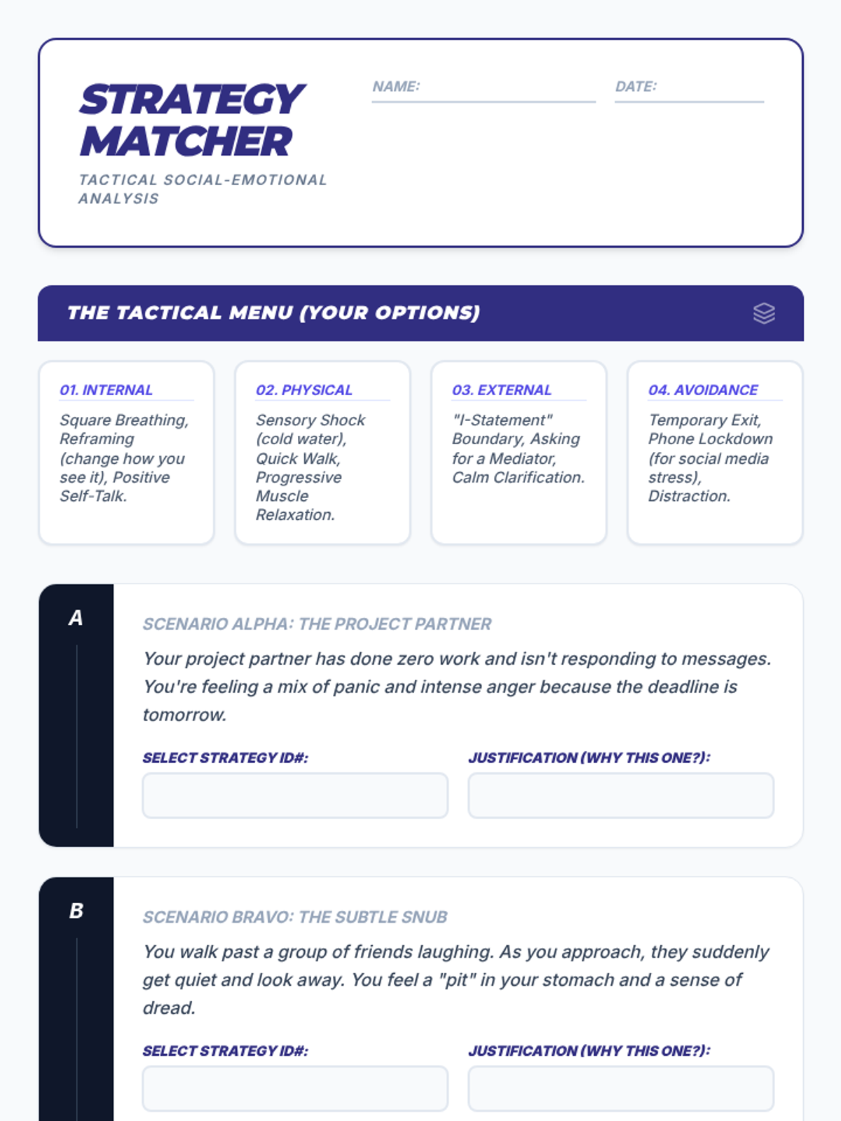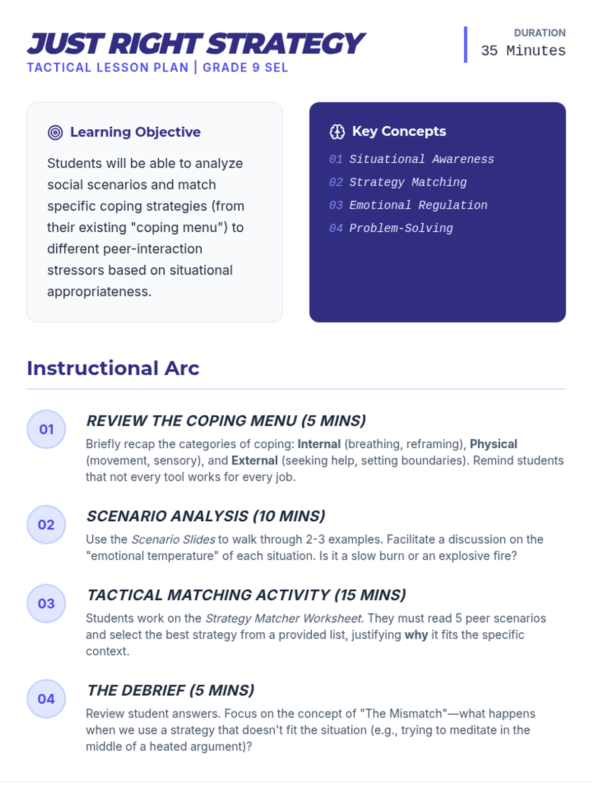 A 9th-grade SEL lesson focused on situational awareness and matching specific coping strategies to peer-related stress and conflict scenarios. students will analyze social 'triggers' and select the most effective tool from their personal coping menu.