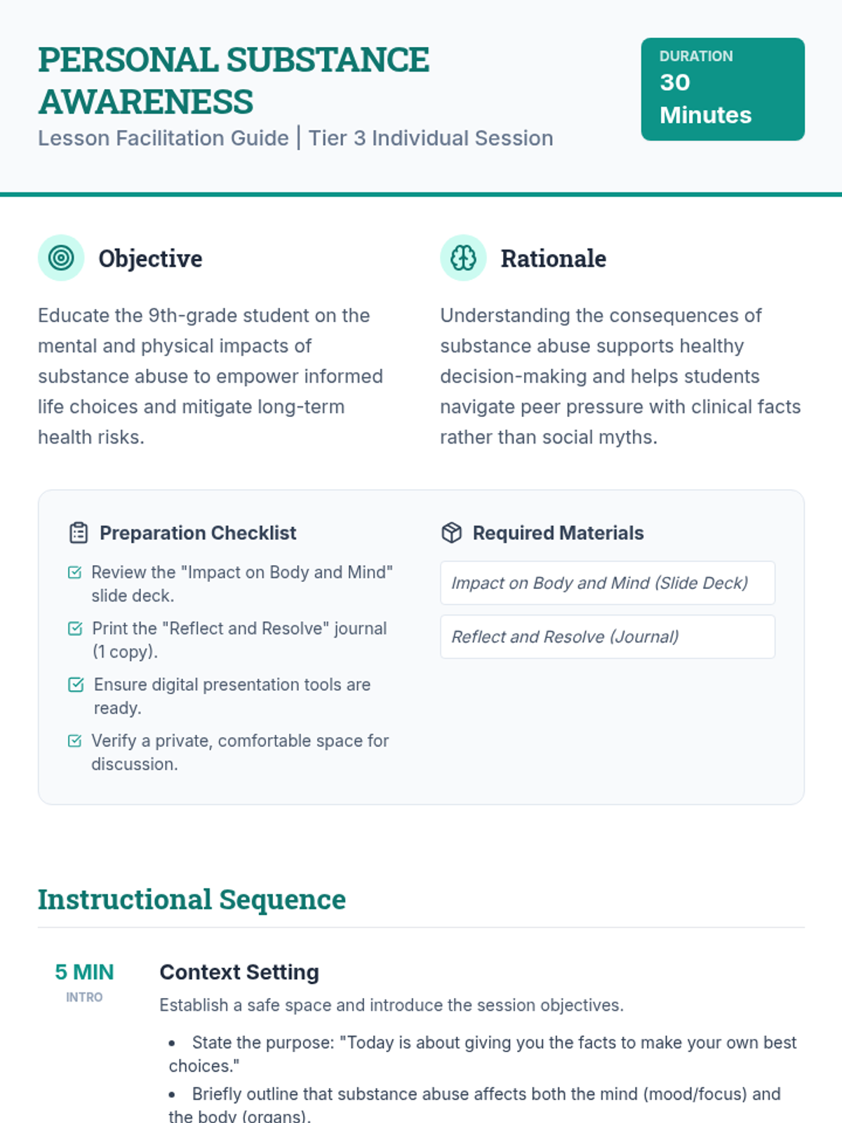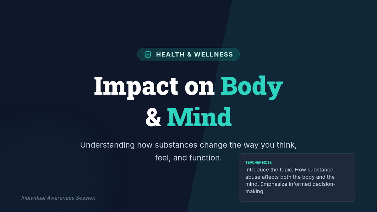 An individualized session for 9th-grade students focusing on the mental and physical effects of substance abuse to empower informed decision-making.