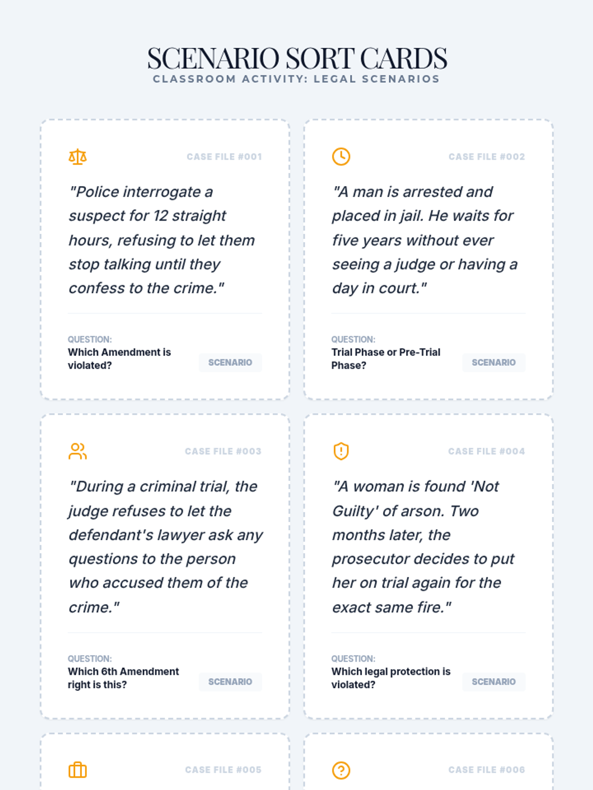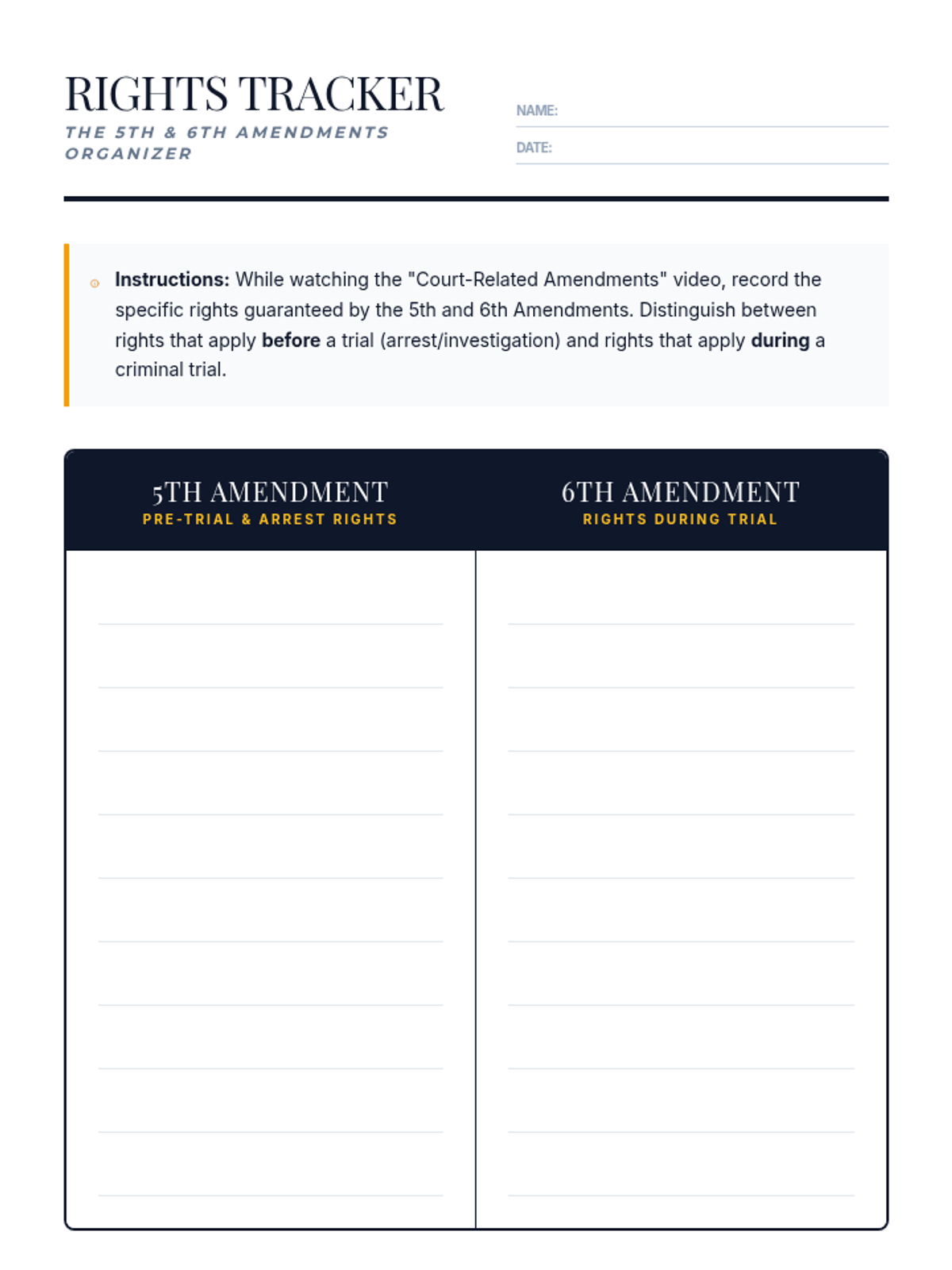 Students will investigate the 5th and 6th Amendments to the U.S. Constitution, distinguishing between legal rights during the arrest/pre-trial phase and those guaranteed during a criminal trial.