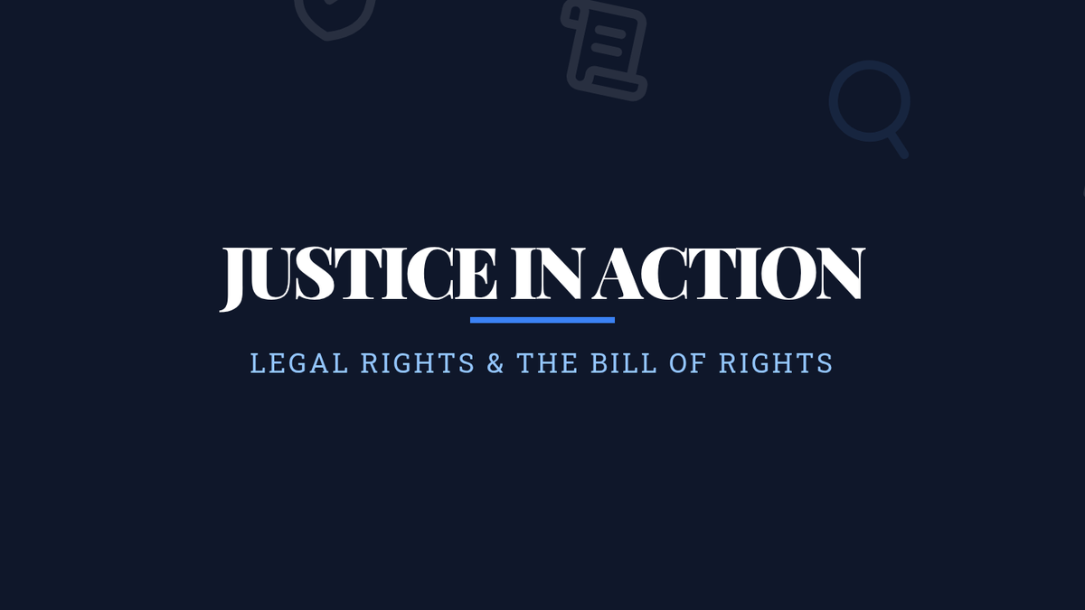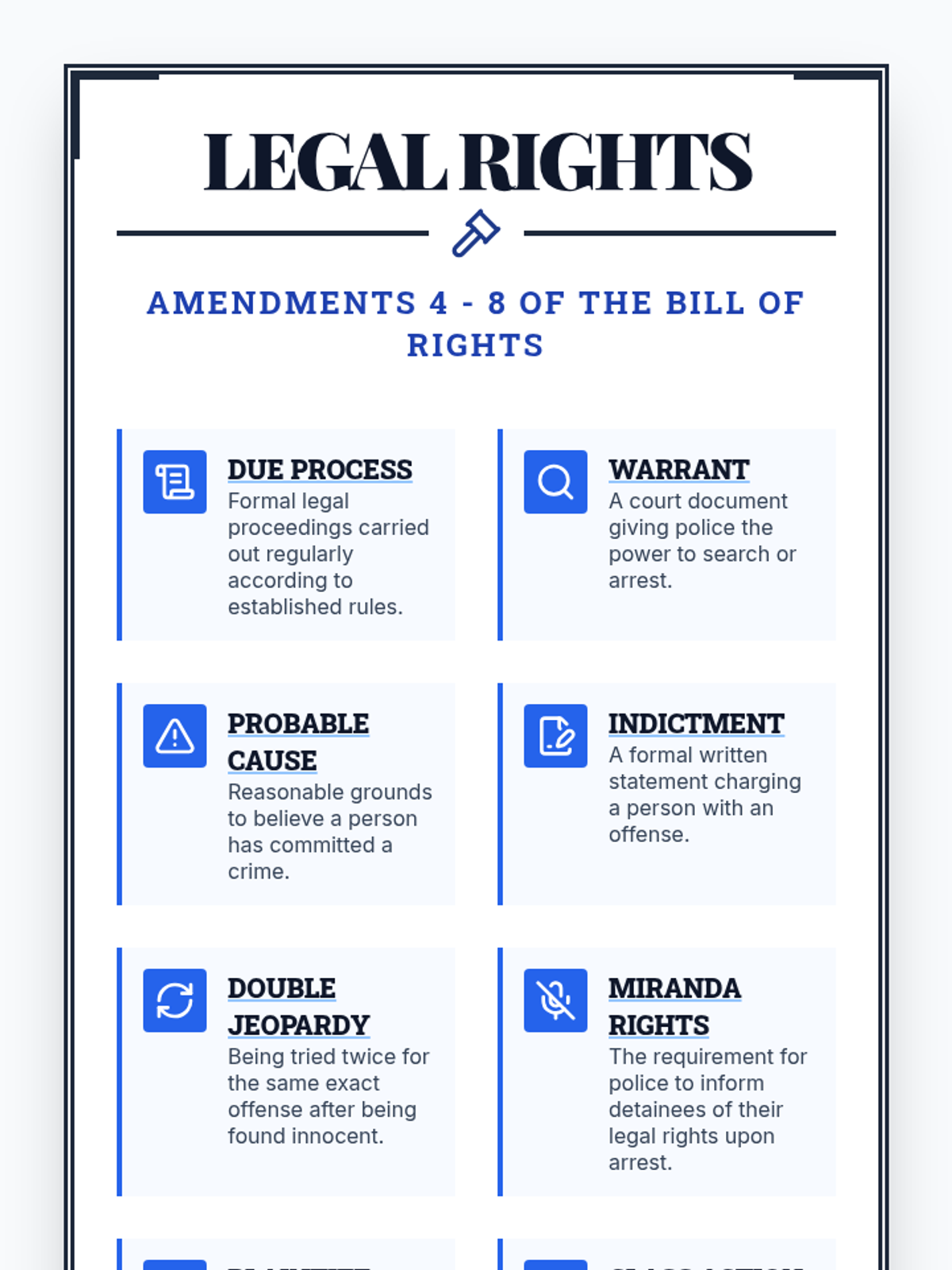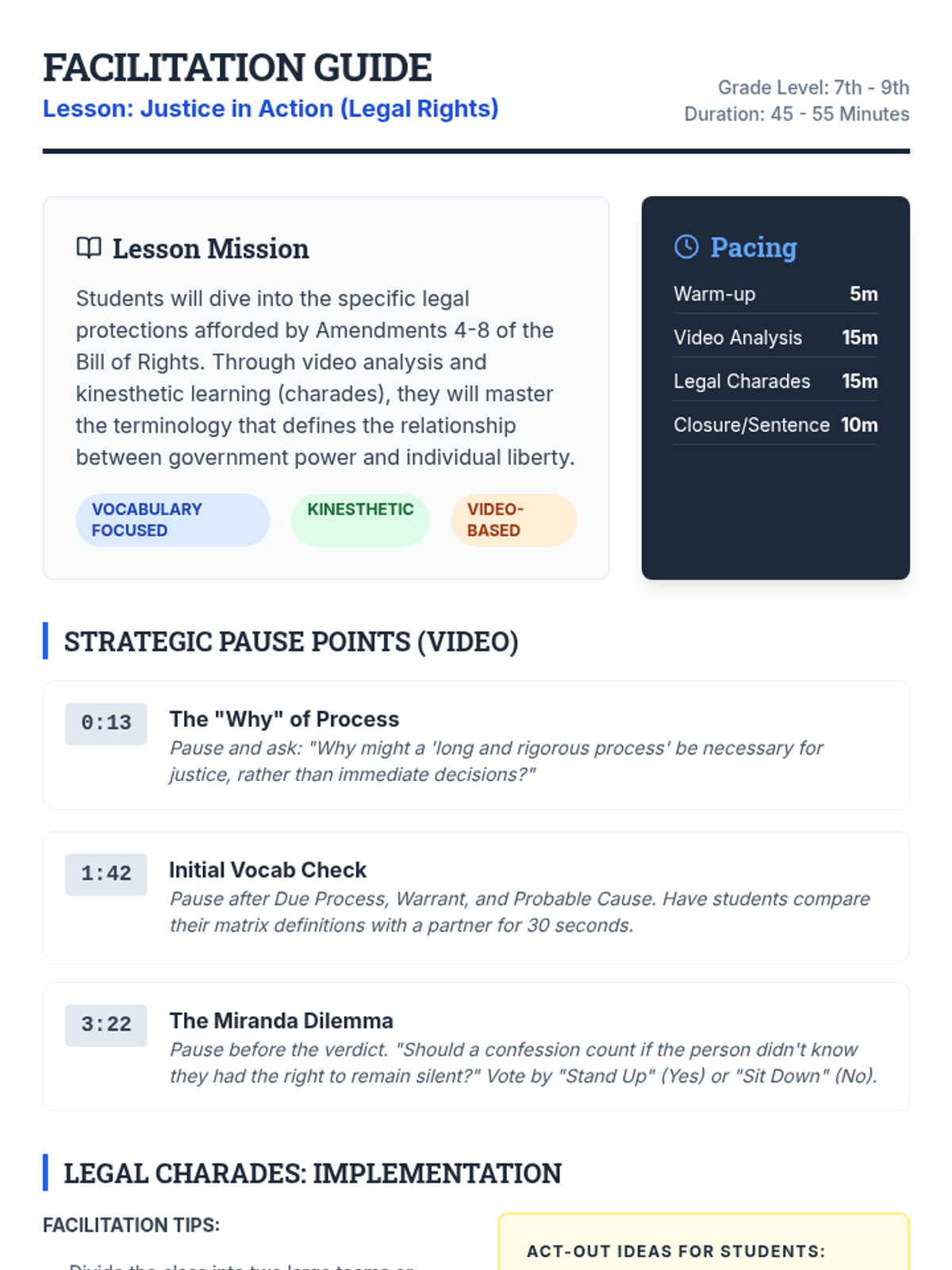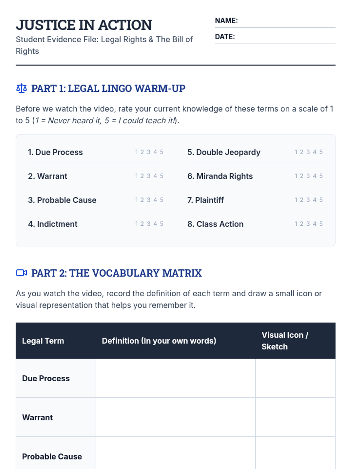 A comprehensive lesson on legal rights (Amendments 4-8) in the Bill of Rights, featuring a vocabulary matrix, video analysis of Miranda v. Arizona, and a 'Legal Charades' activity.