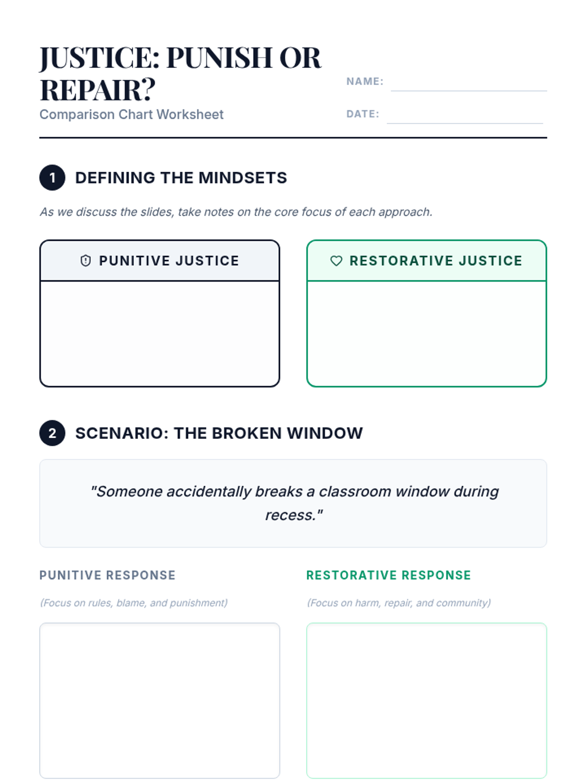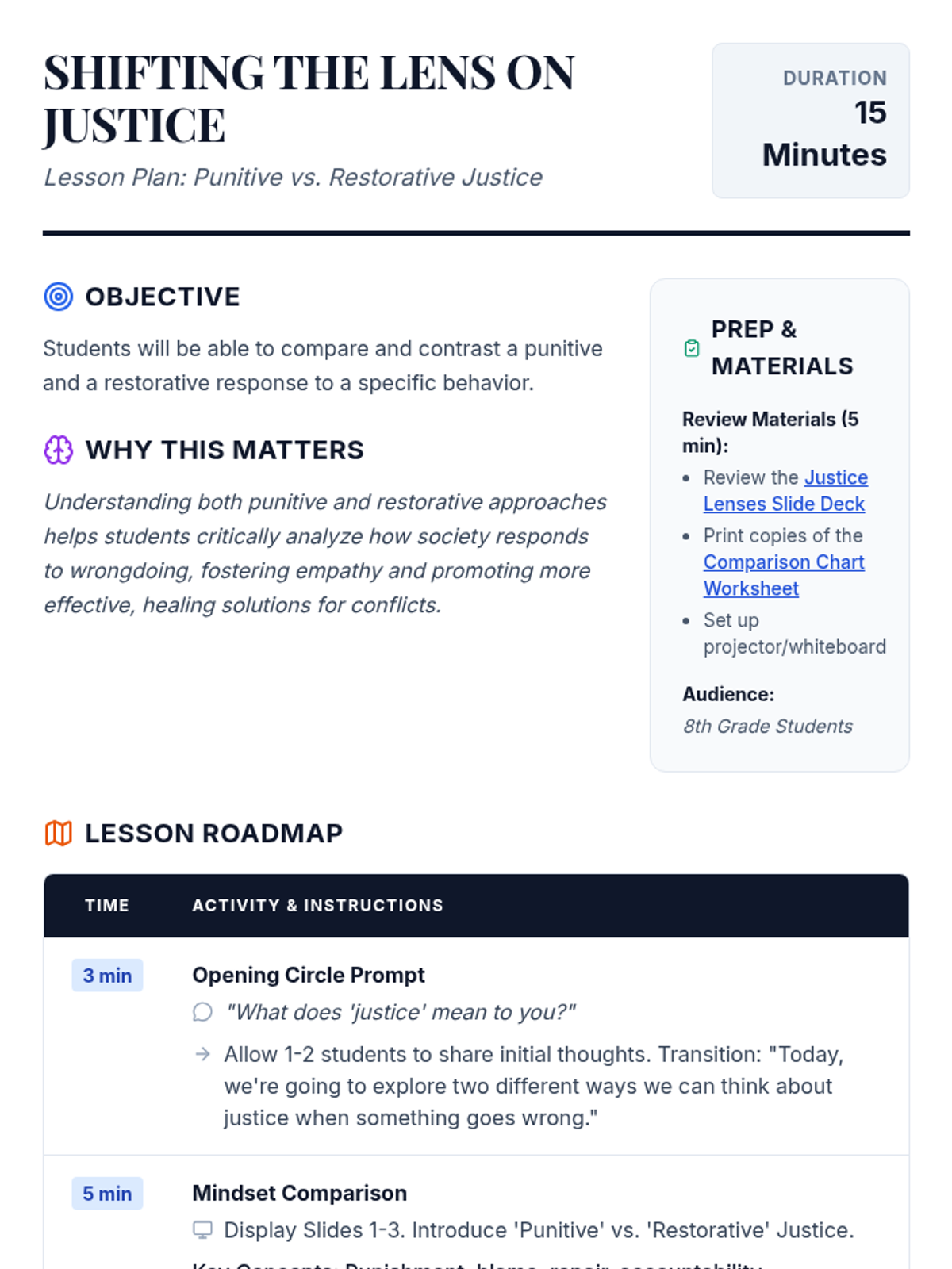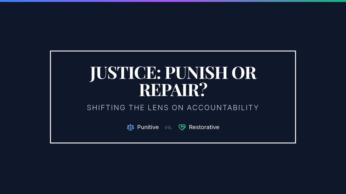 A 15-minute introductory lesson for 8th graders exploring the differences between punitive and restorative justice, focusing on shifting mindsets from blame to repair.
