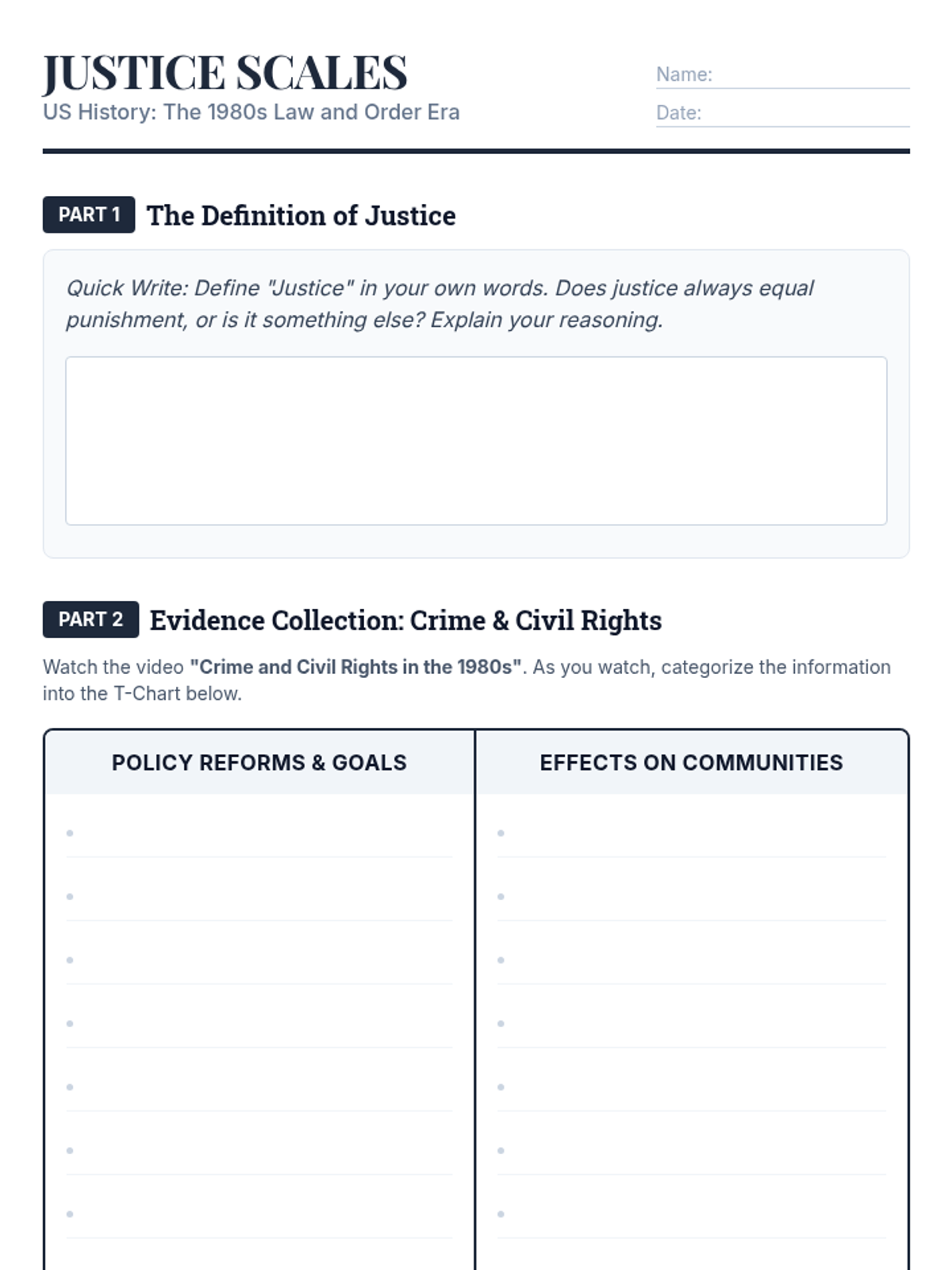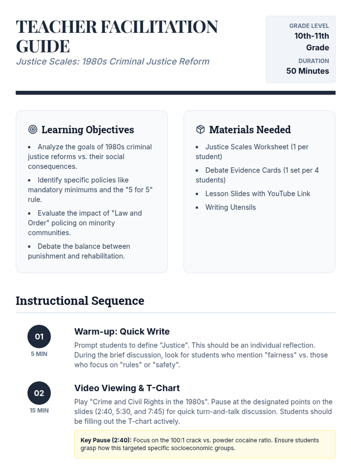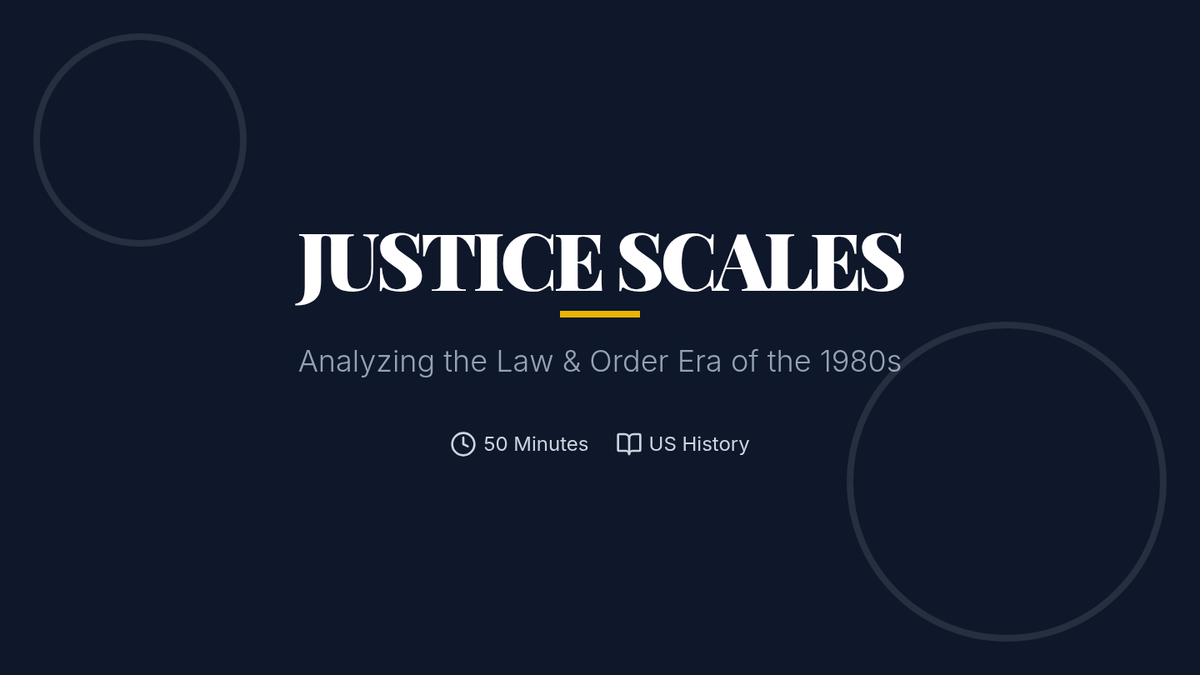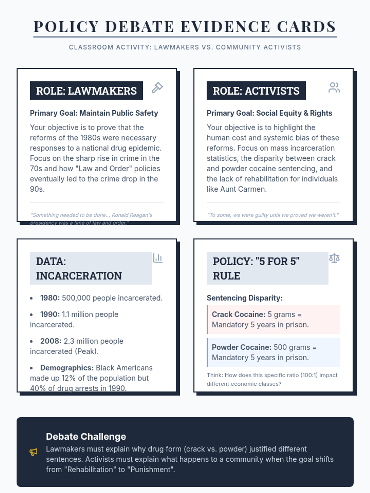A high school history lesson exploring the 1980s 'Law and Order' era, focusing on the tension between crime reduction goals and the unintended social consequences of mandatory sentencing and mass incarceration.