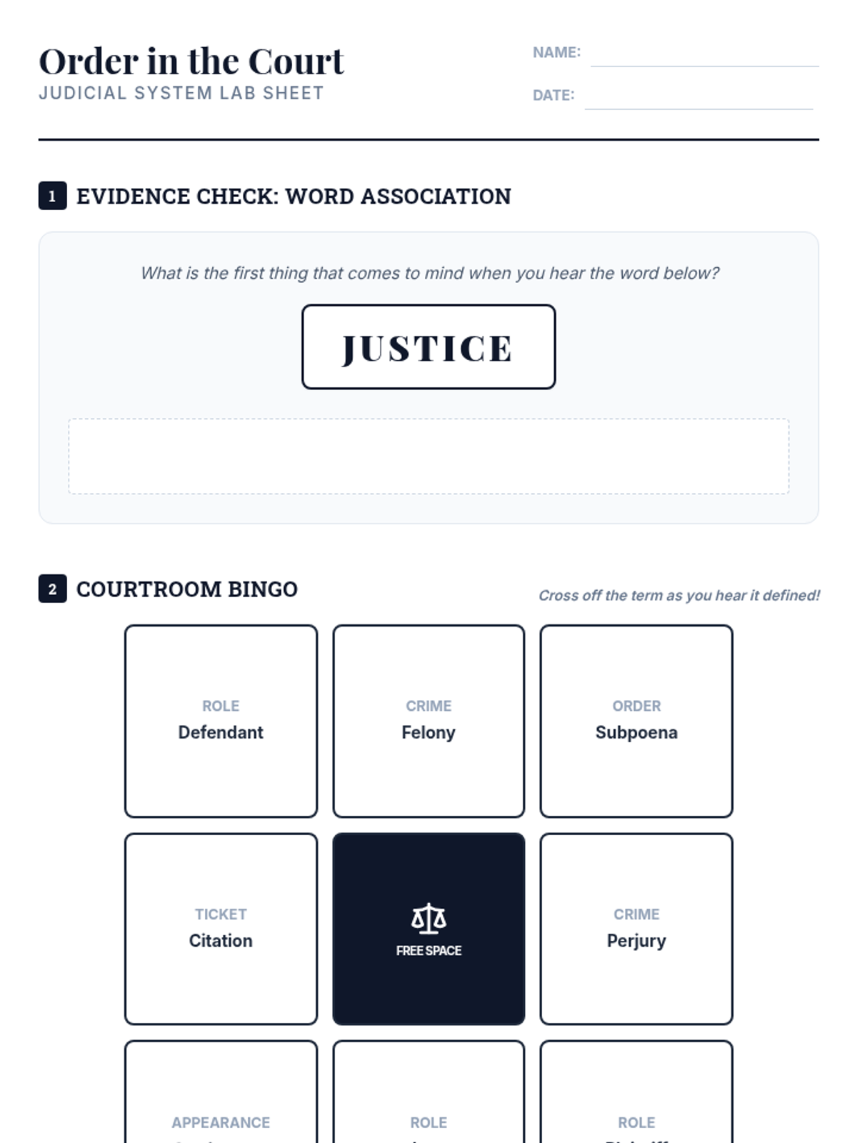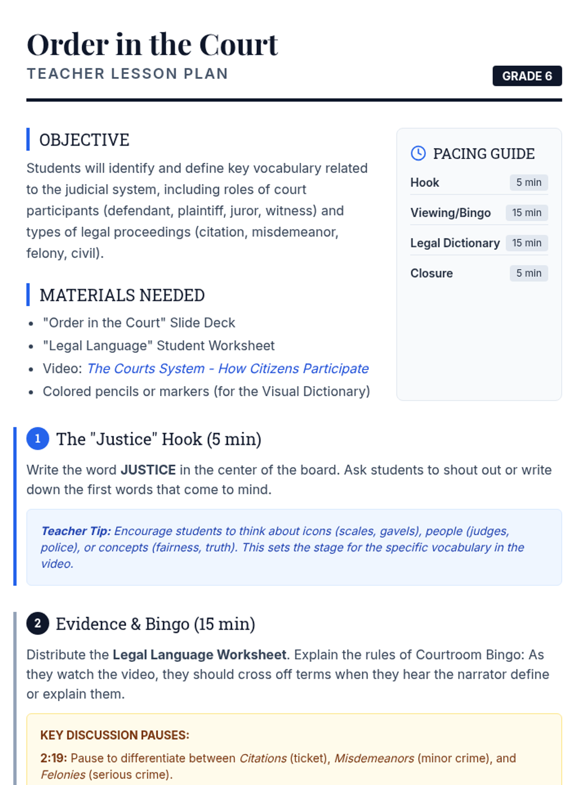A comprehensive 6th-grade lesson exploring the judicial system's vocabulary and the roles citizens play as defendants, plaintiffs, jurors, and witnesses. Students engage with a video-based bingo game and create a visual 'Legal Dictionary' to solidify their understanding of complex legal terms.