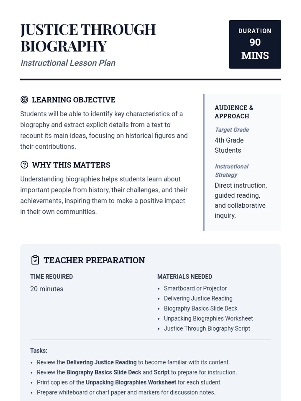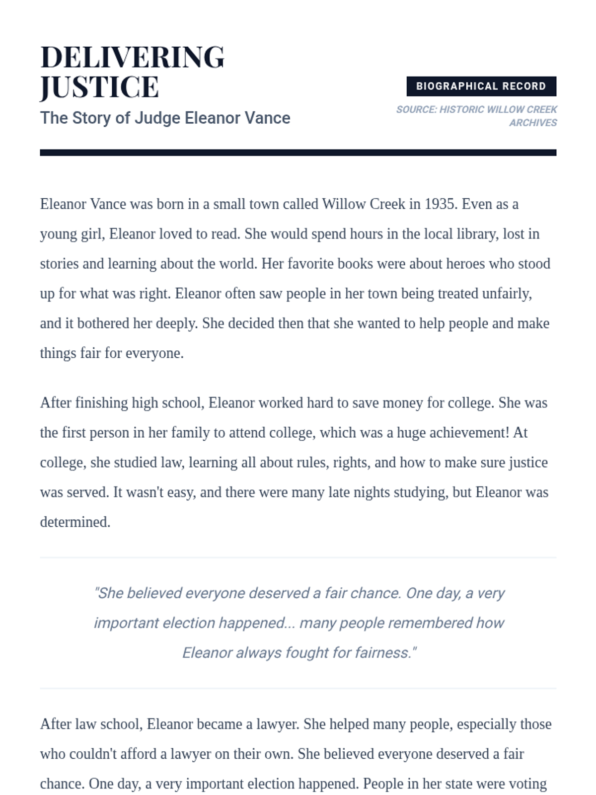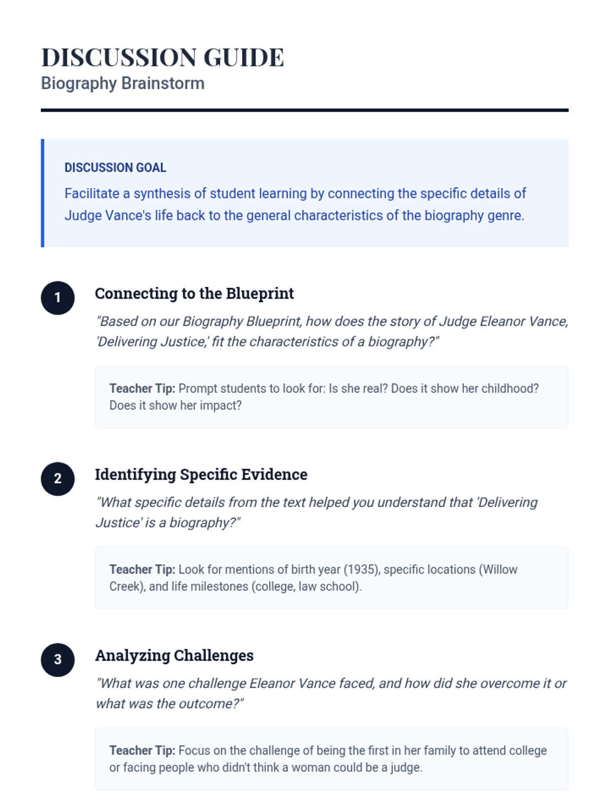 This lesson introduces 4th-grade students to biographies, focusing on identifying key characteristics and explicit details from a text about Judge Eleanor Vance. Students learn to extract information and recount details to understand historical figures and their impact through guided instruction and analysis.