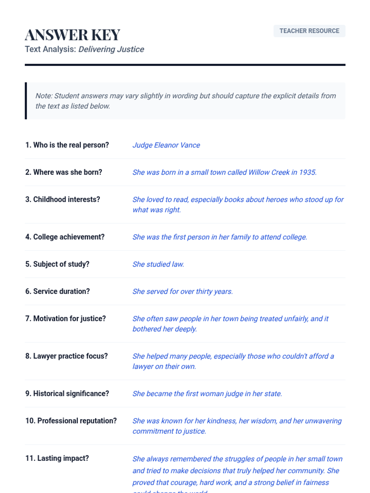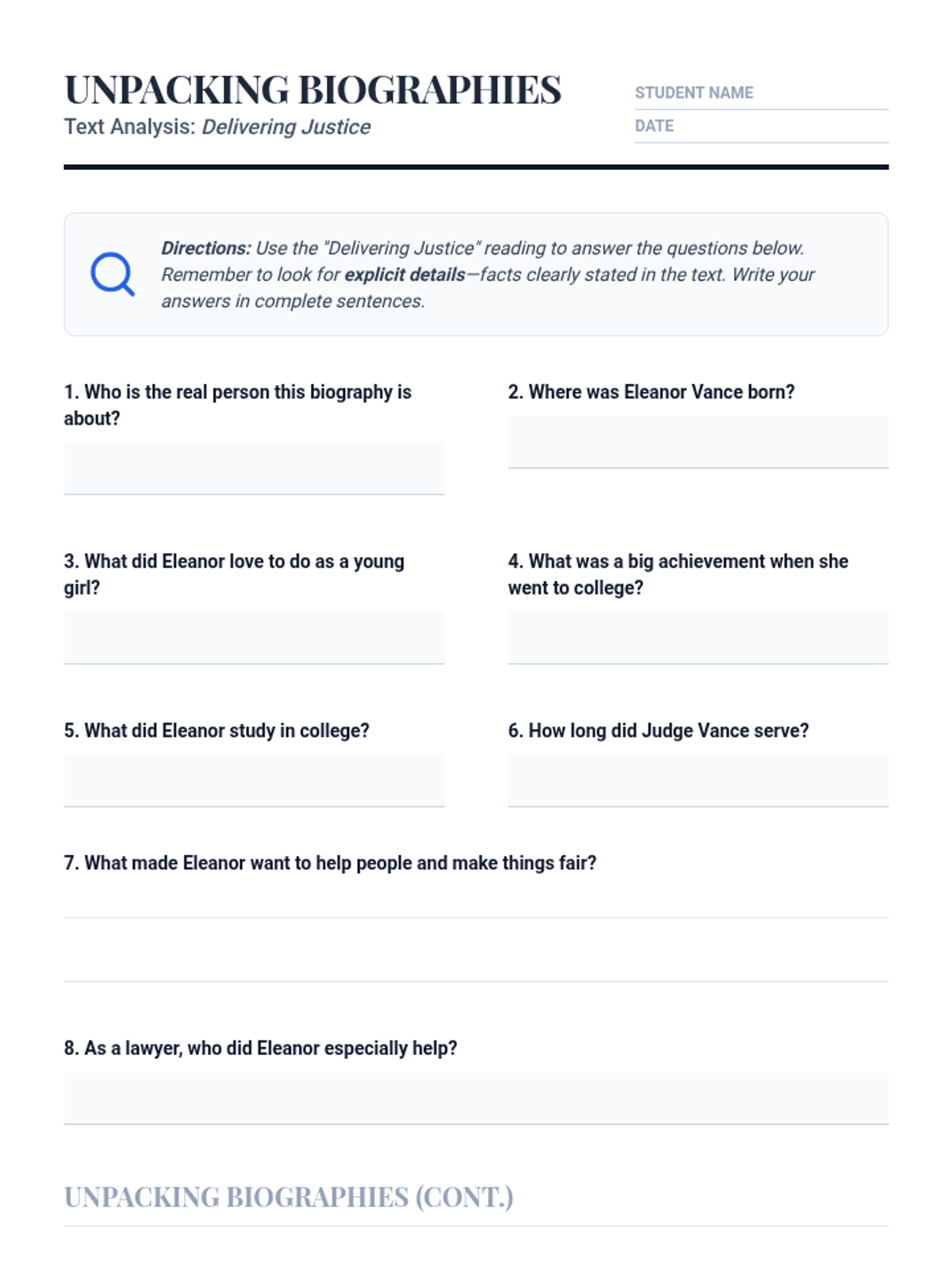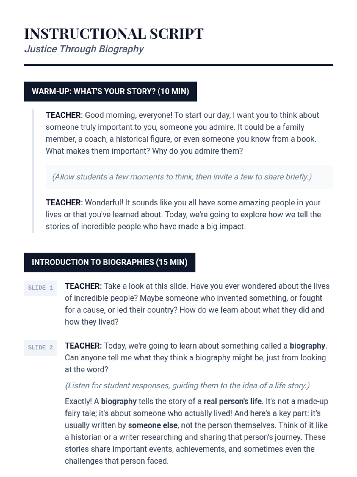 This lesson introduces 4th-grade students to biographies, focusing on identifying key characteristics and explicit details from a text about Judge Eleanor Vance. Students learn to extract information and recount details to understand historical figures and their impact through guided instruction and analysis.