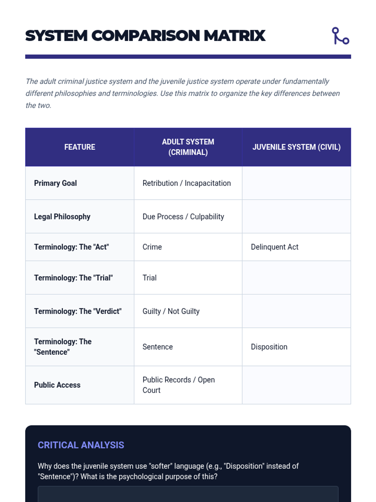 This lesson contrasts the adult and juvenile systems, focusing on the doctrine of parens patriae and the neurological science regarding adolescent brain development.