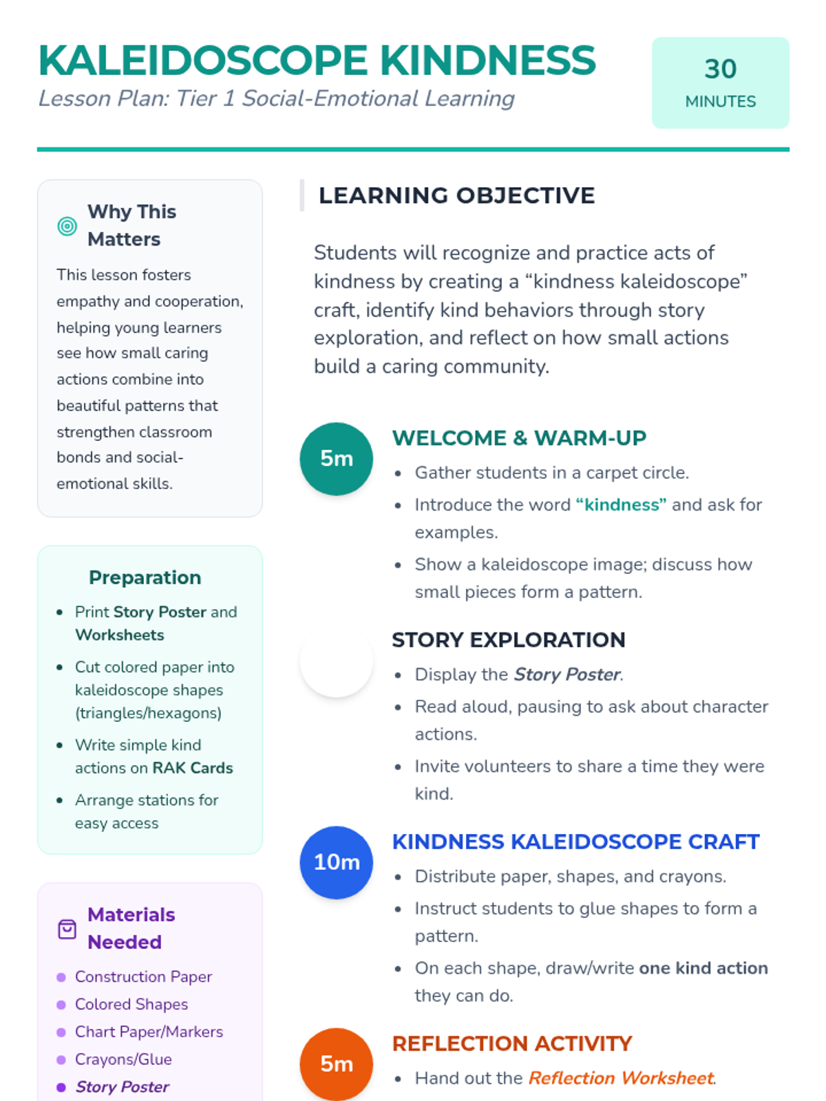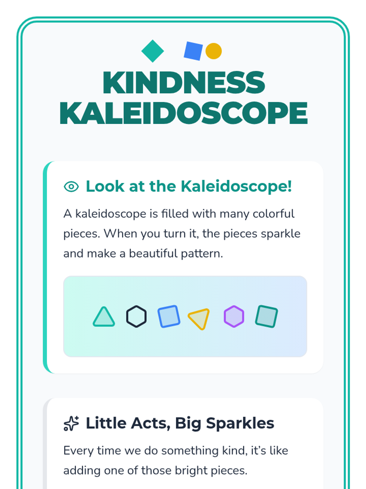 In this 30-minute kindergarten lesson, students explore kindness as a colorful kaleidoscope—seeing how small caring actions create beautiful patterns in their community. This Tier 1 activity builds social-emotional skills, empathy, and cooperation through interactive stories, group activities, and reflection.