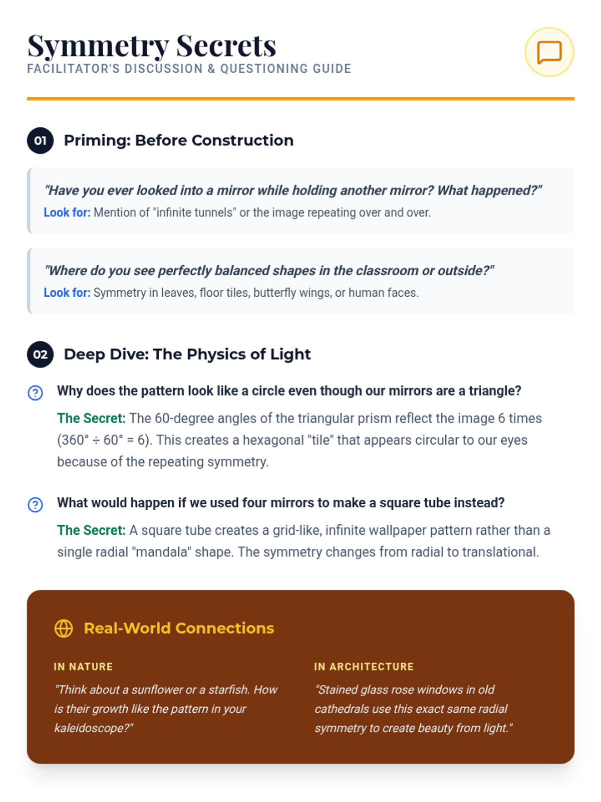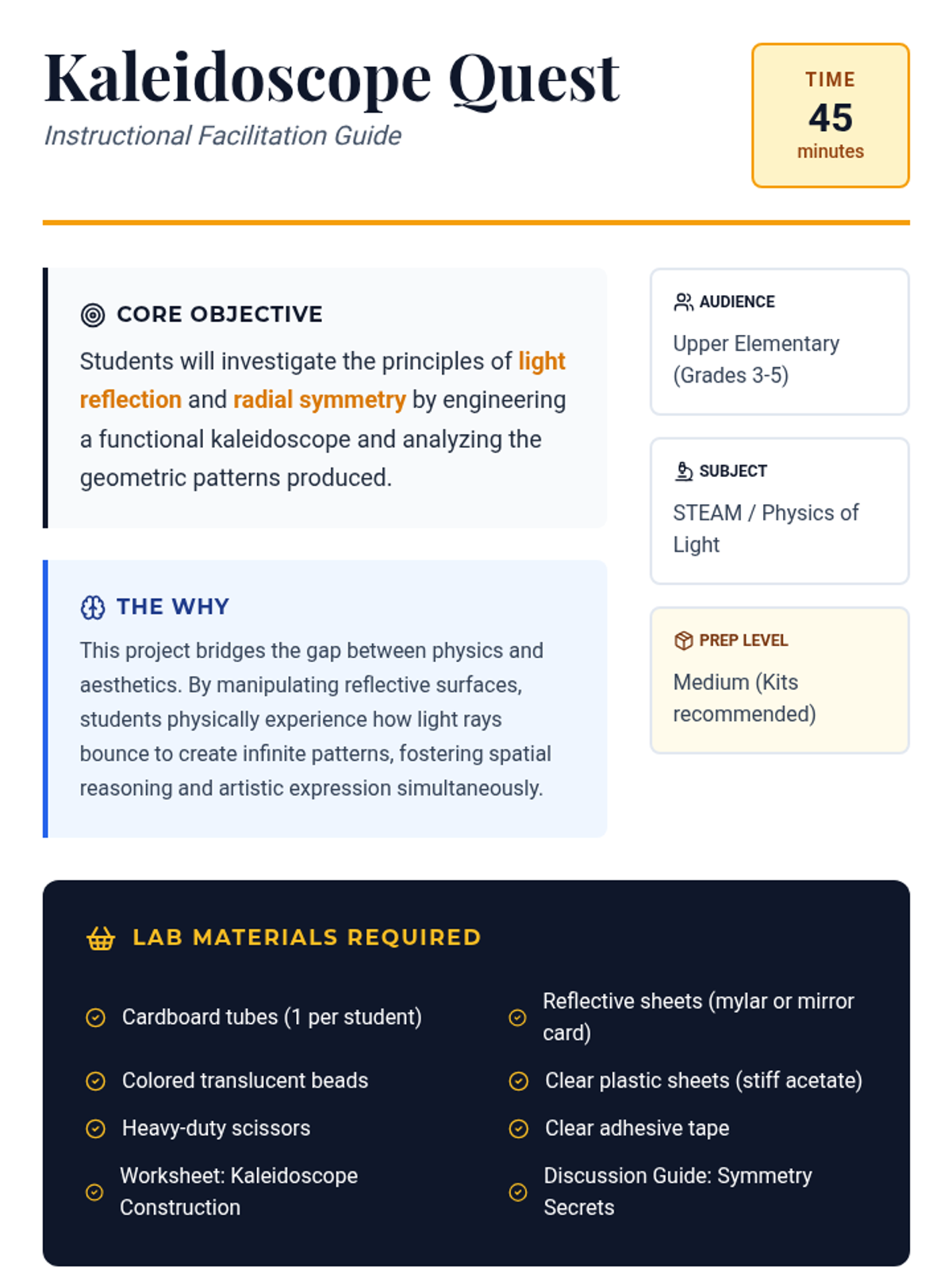A hands-on STEAM lesson where students build kaleidoscopes to explore the physics of light reflection and the beauty of radial symmetry.