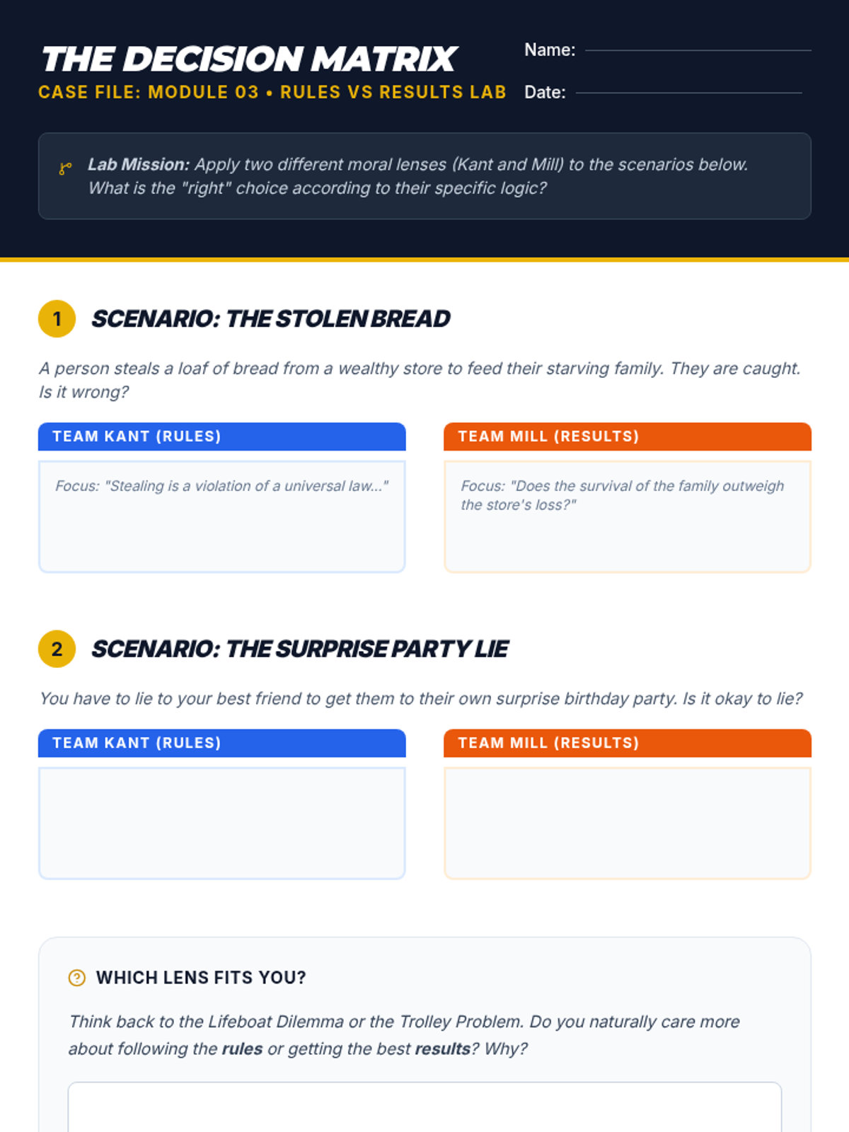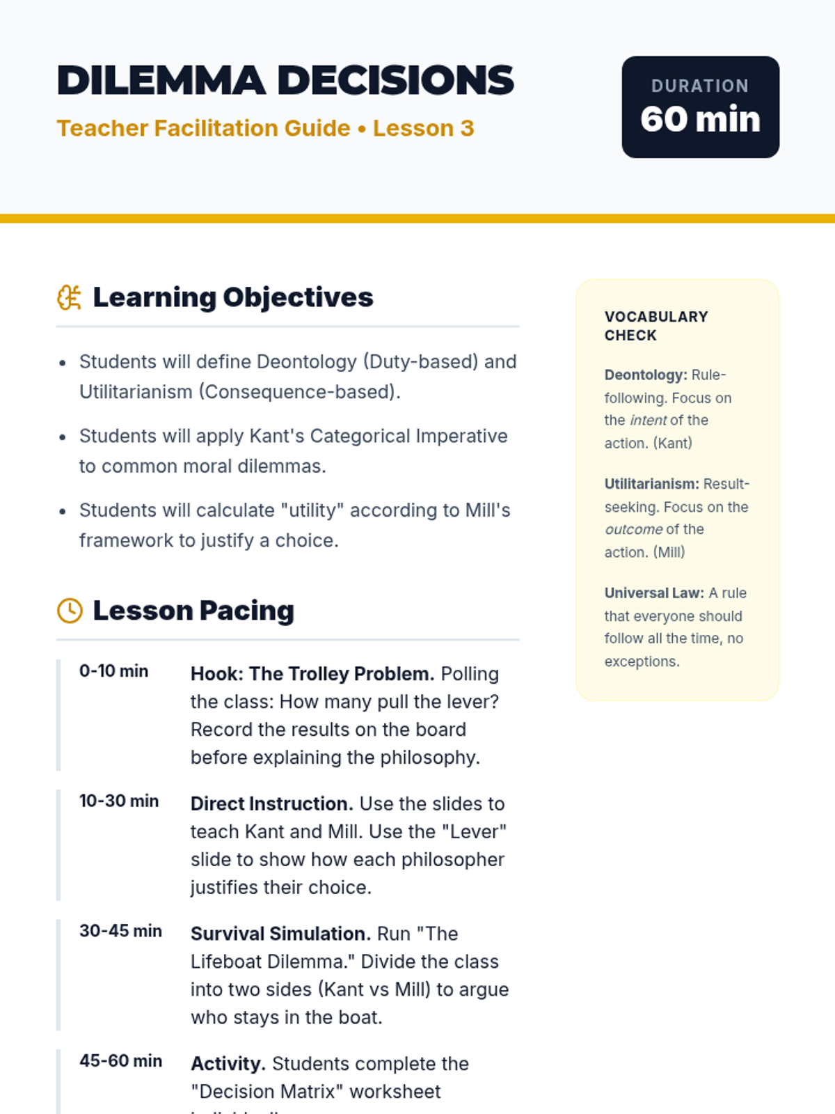 Contrasts Deontology and Utilitarianism using the Trolley Problem and other moral dilemmas.