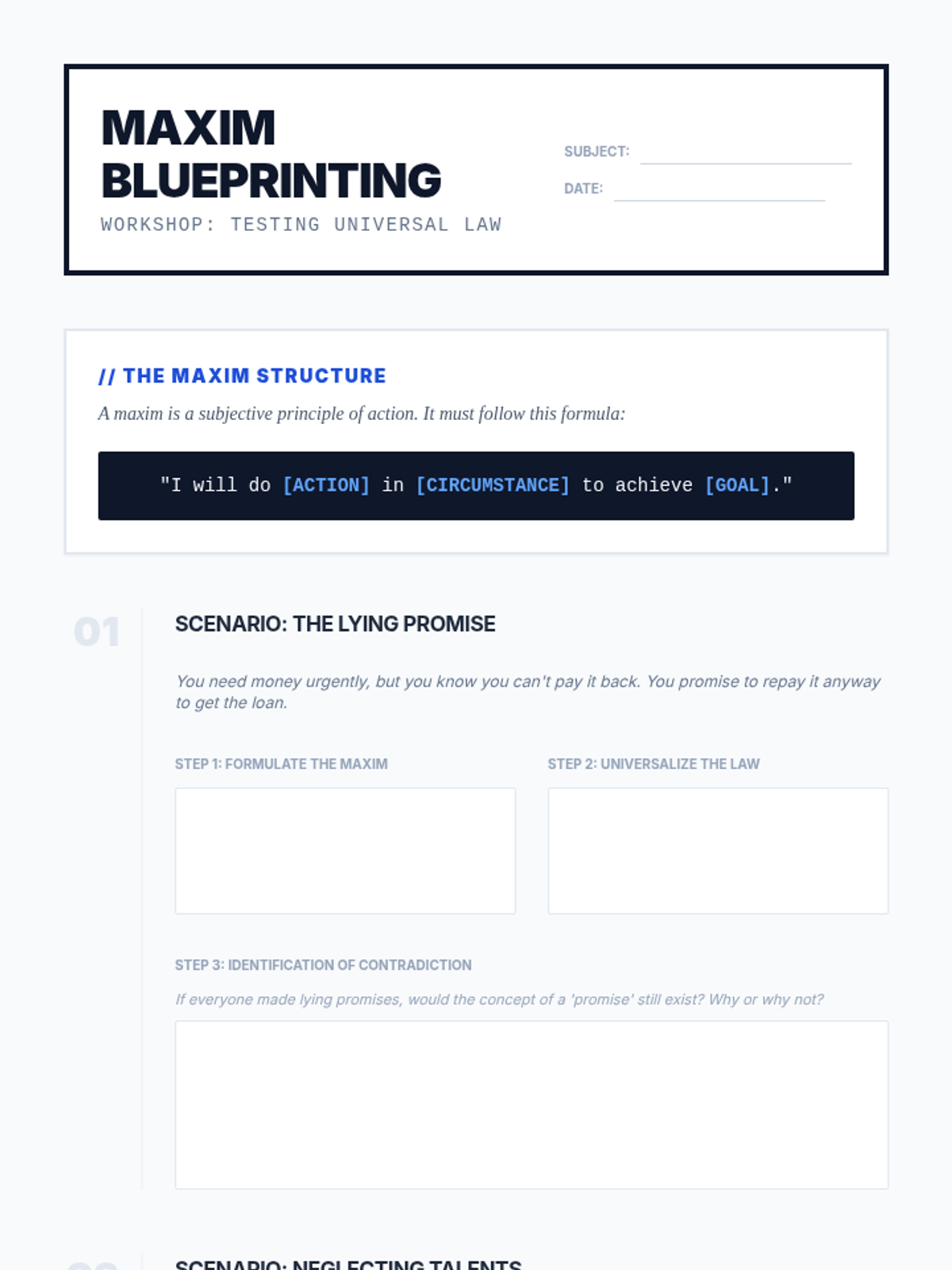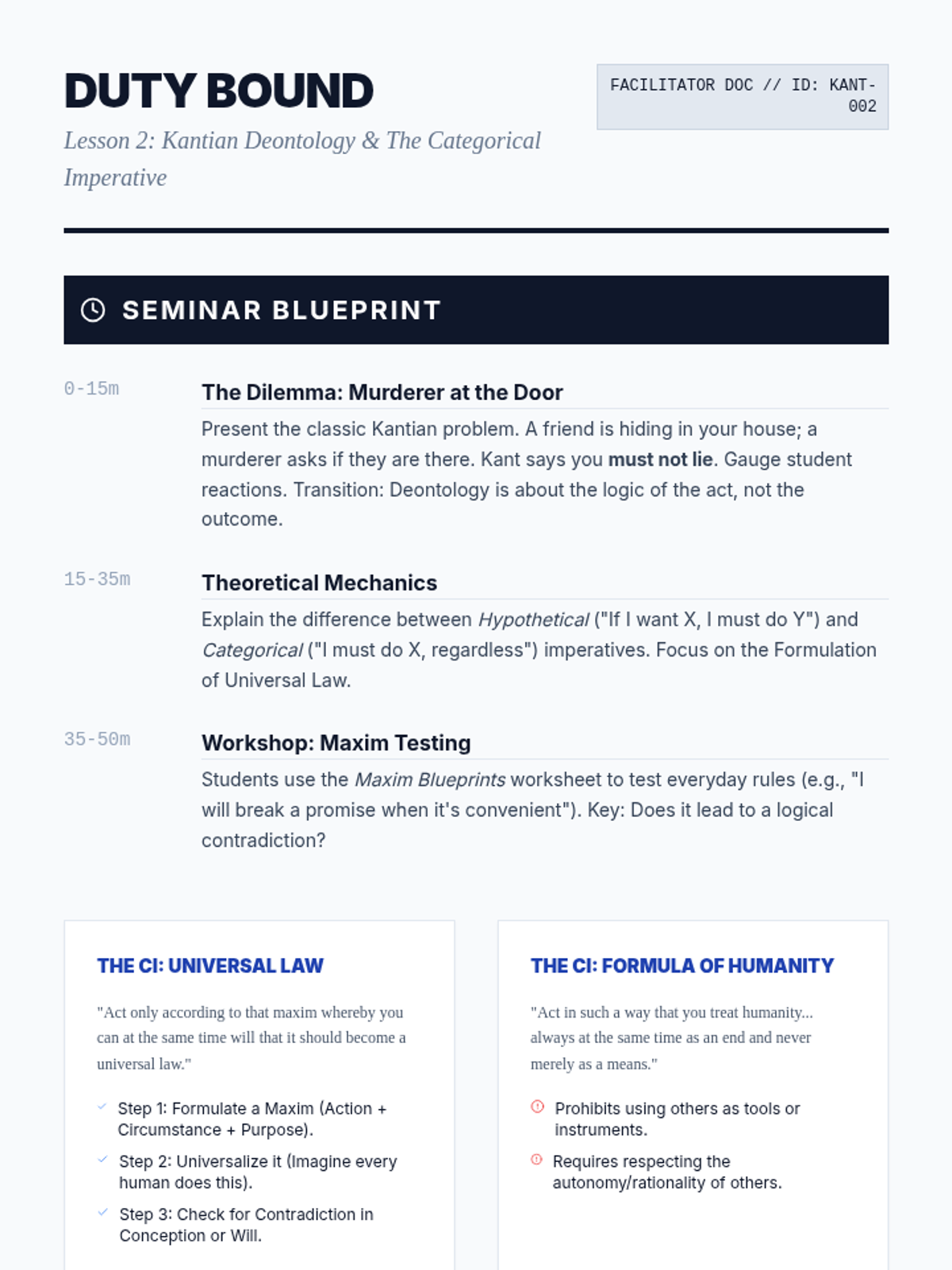 Introduce Immanuel Kant's duty-based ethics, exploring the Categorical Imperative and the logical testing of moral maxims.