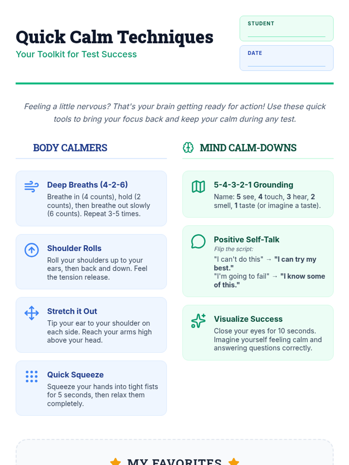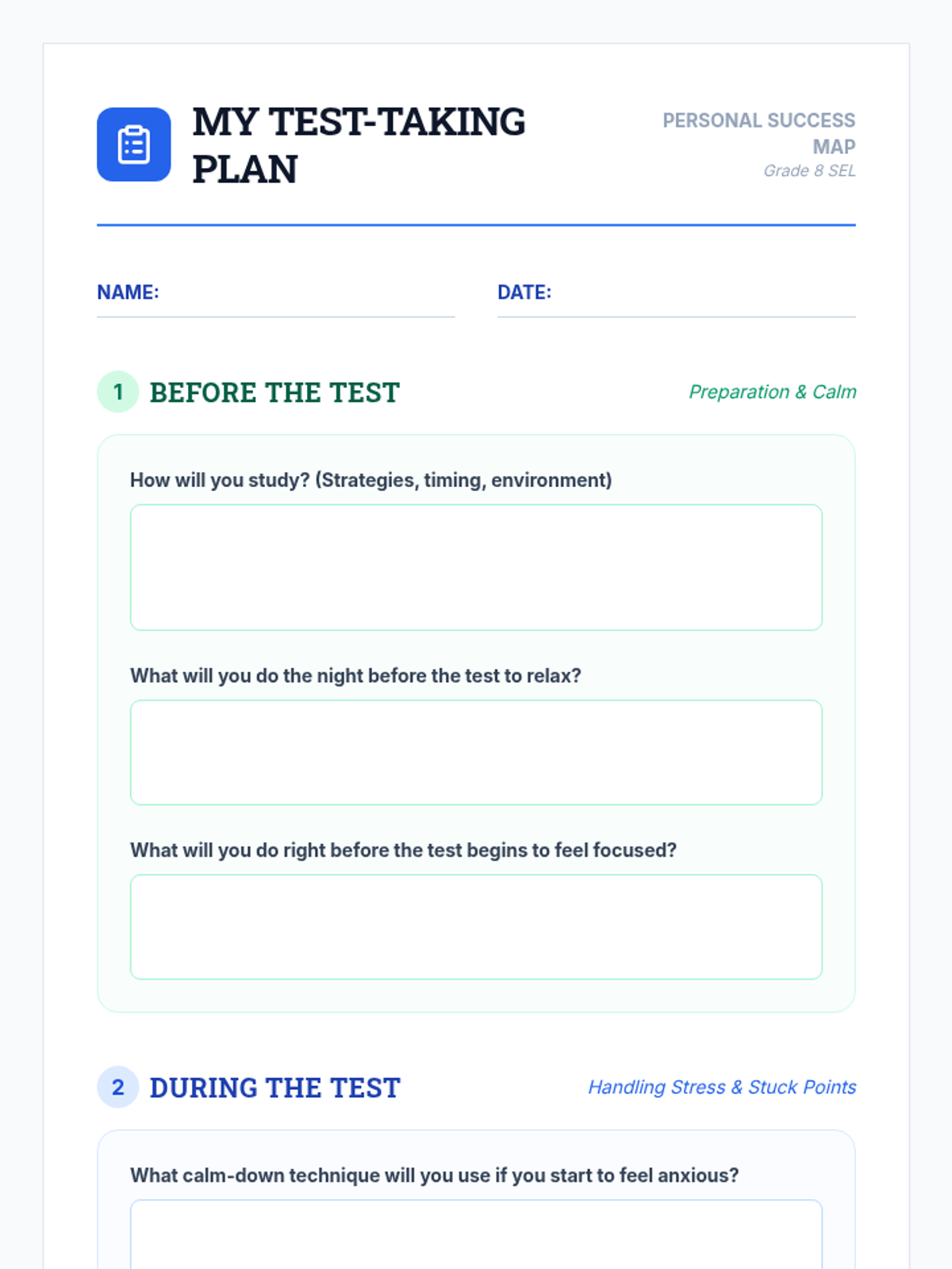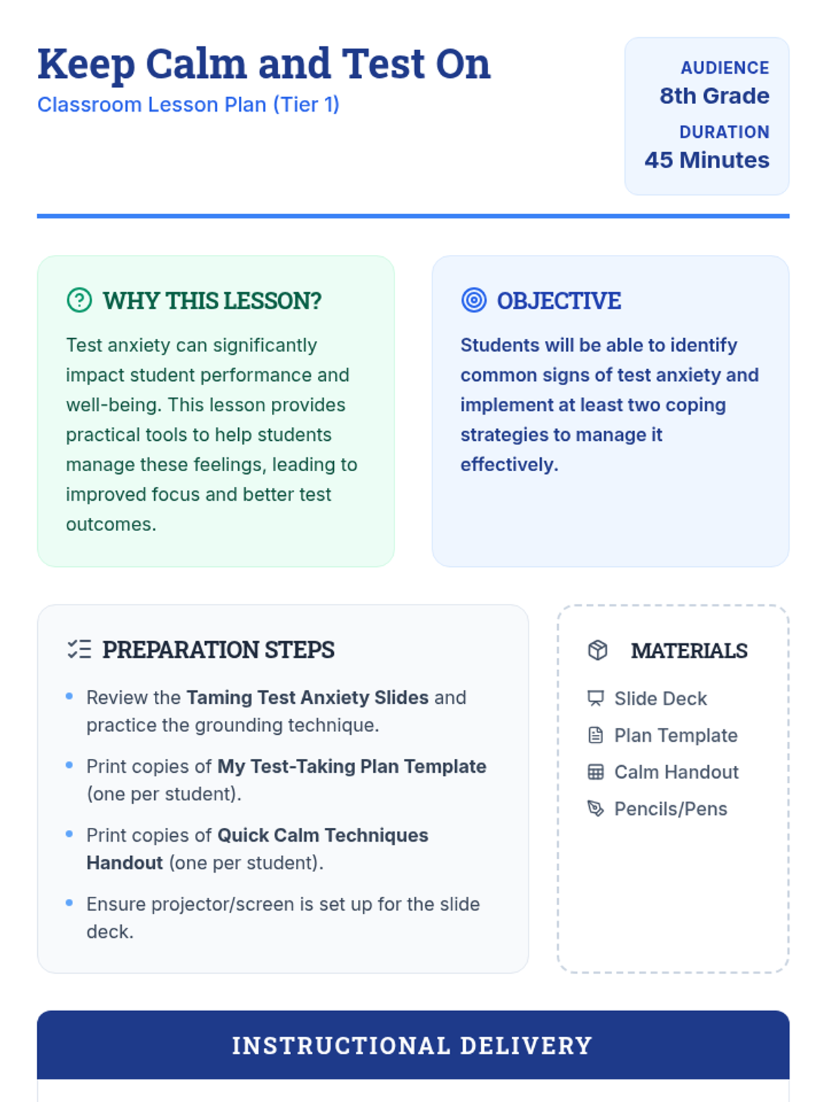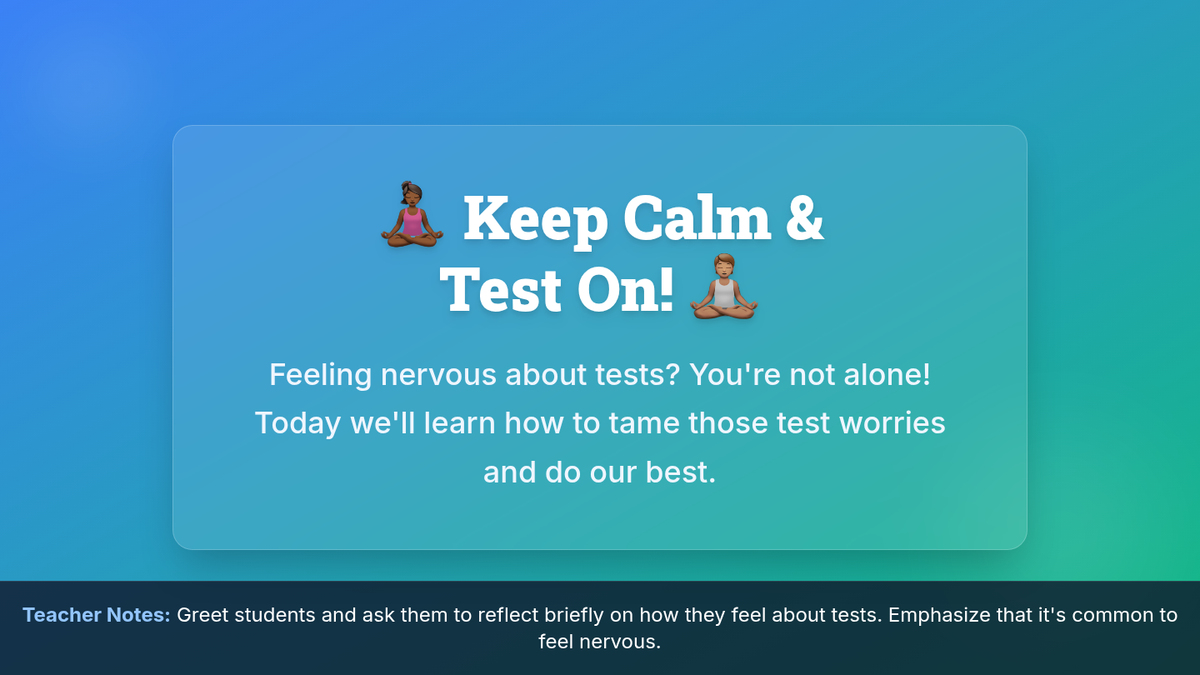 A 45-minute lesson for 8th graders to identify test anxiety signs and practice grounding and self-talk strategies to improve focus and well-being.