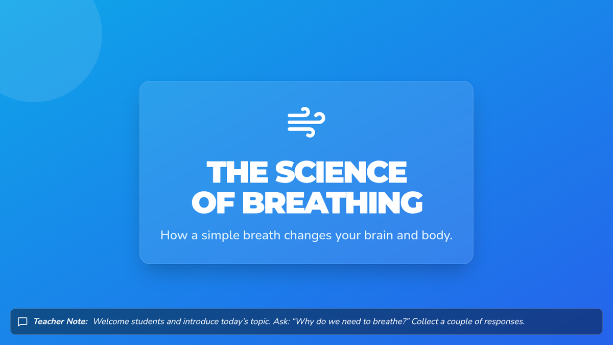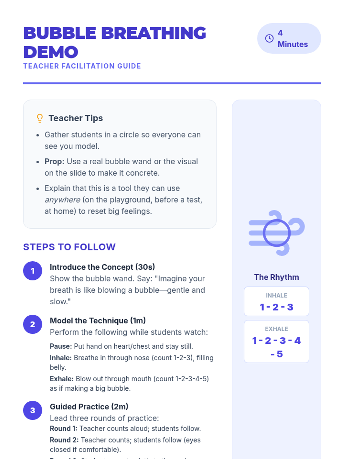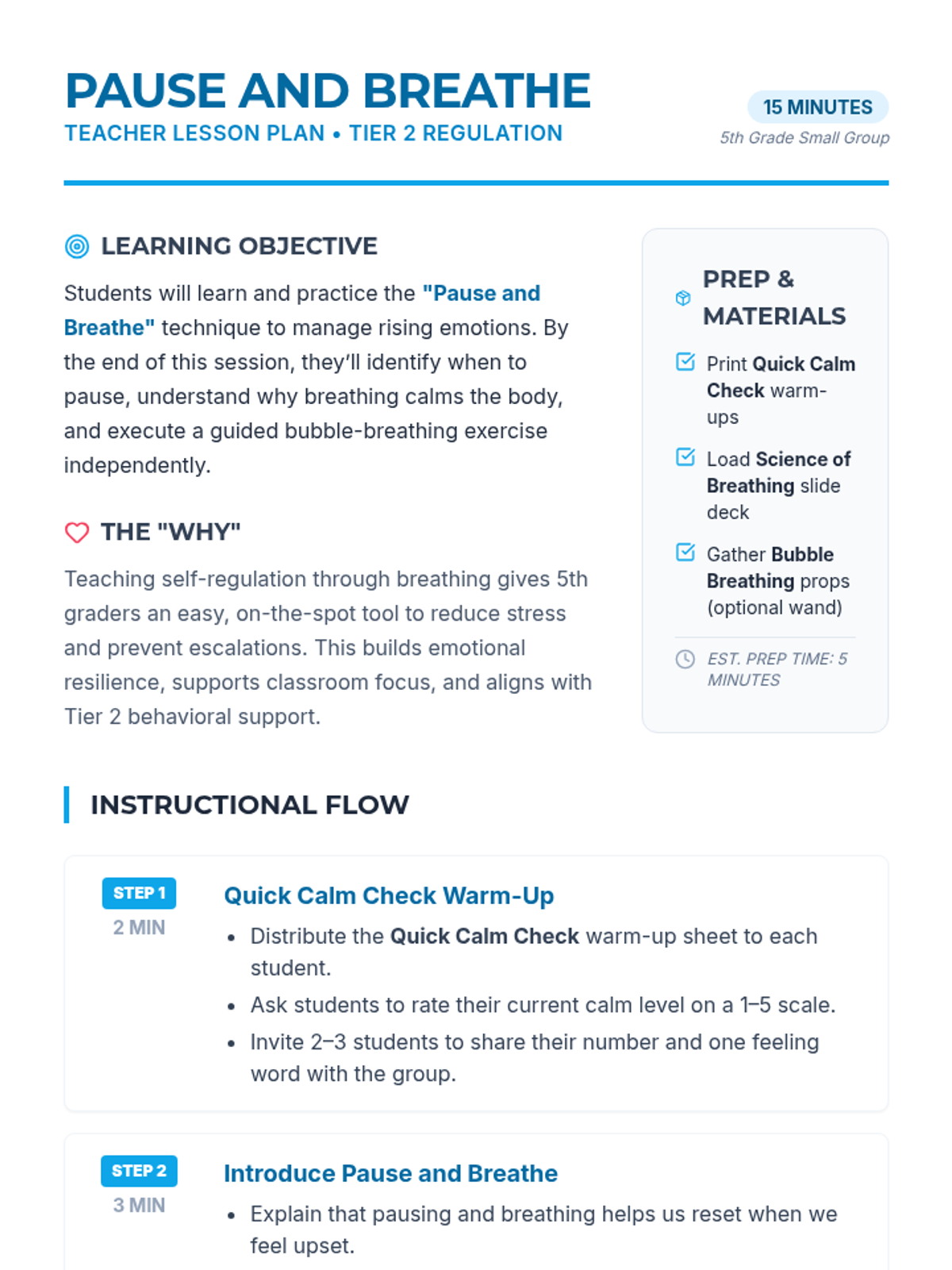 A Tier 2 small group lesson for 5th graders focused on the 'Pause and Breathe' technique for emotional regulation. Students explore the physiological benefits of deep breathing and practice bubble breathing for self-de-escalation.