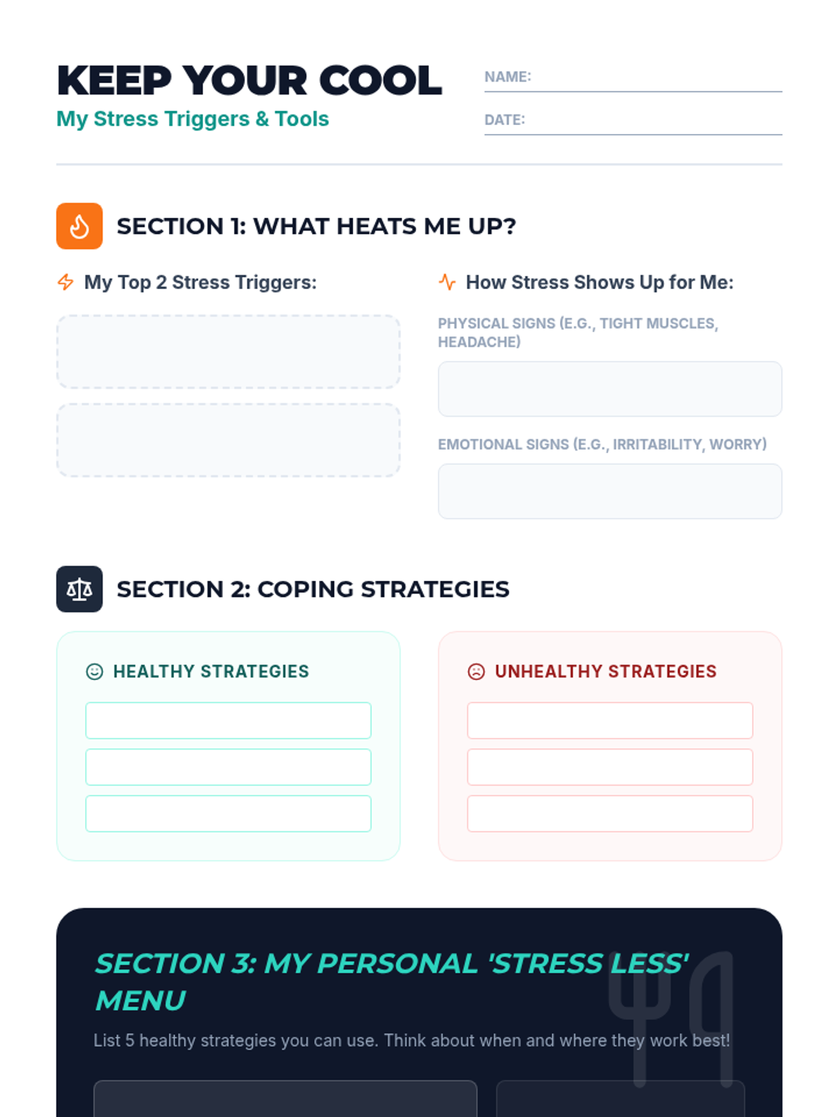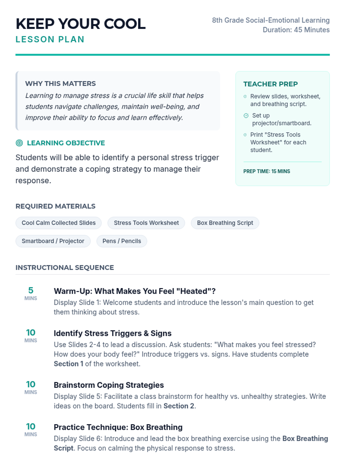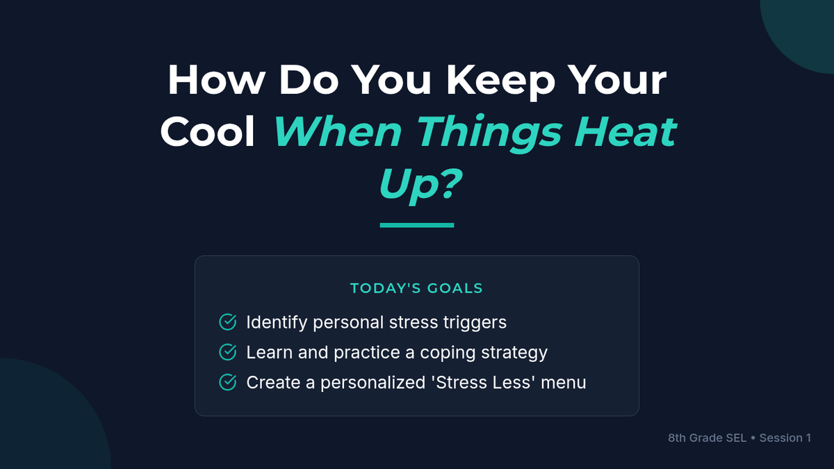 This lesson empowers 8th-grade students to understand and manage their stress responses. Students will learn to identify personal stress triggers and practice effective coping strategies through discussion and guided practice.
