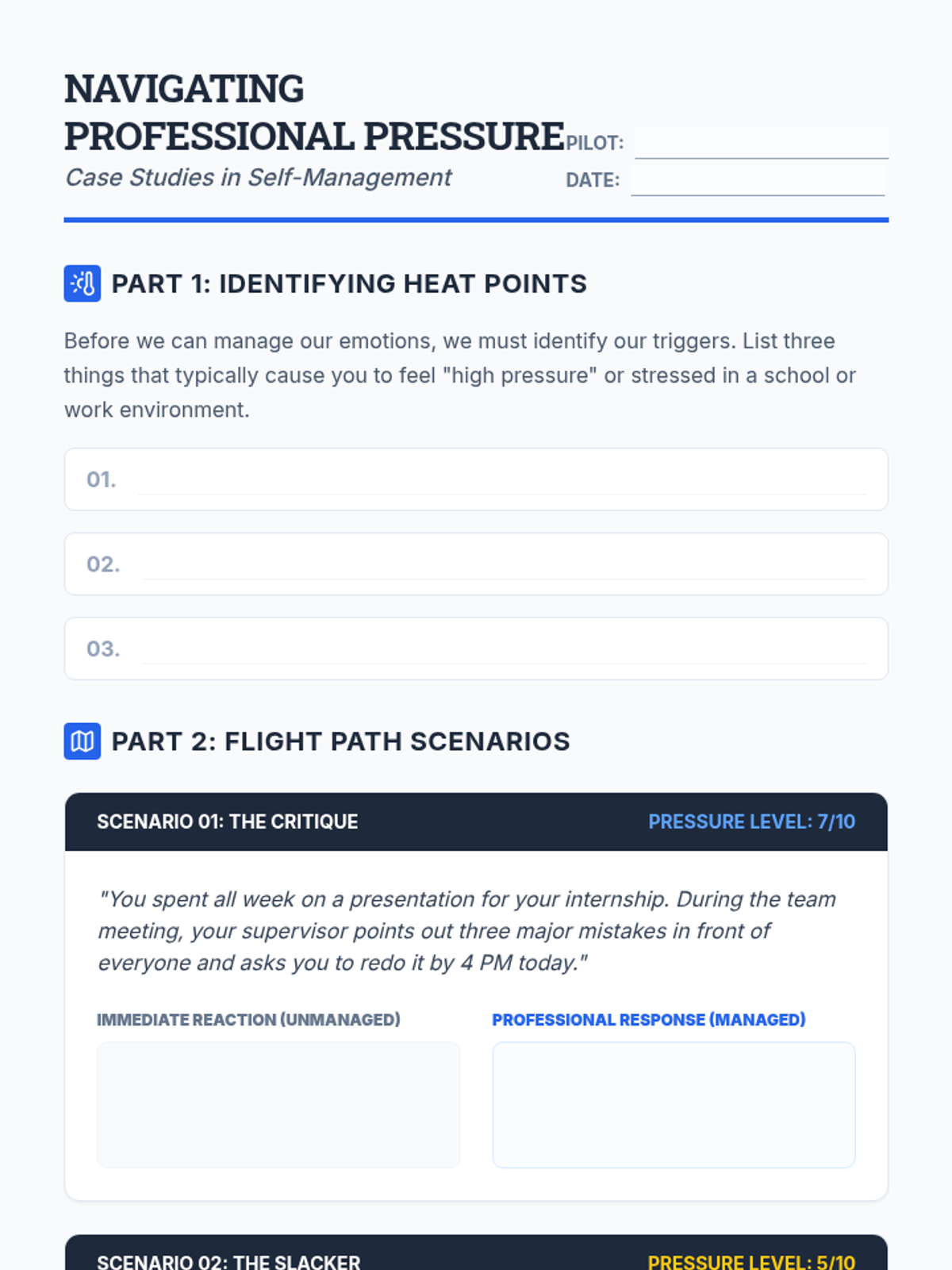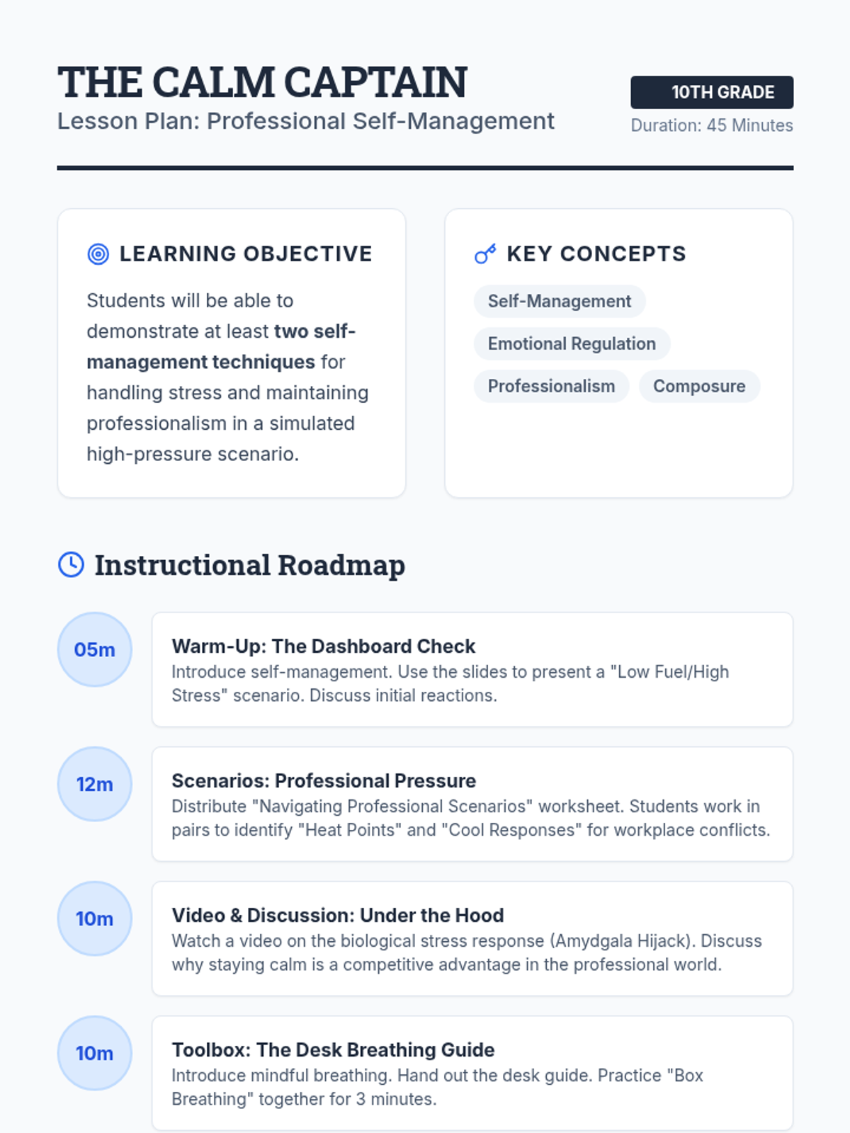 A lesson for 10th graders on mastering self-management and emotional regulation in high-pressure professional environments. Students learn practical stress-management techniques and apply them to real-world scenarios.
