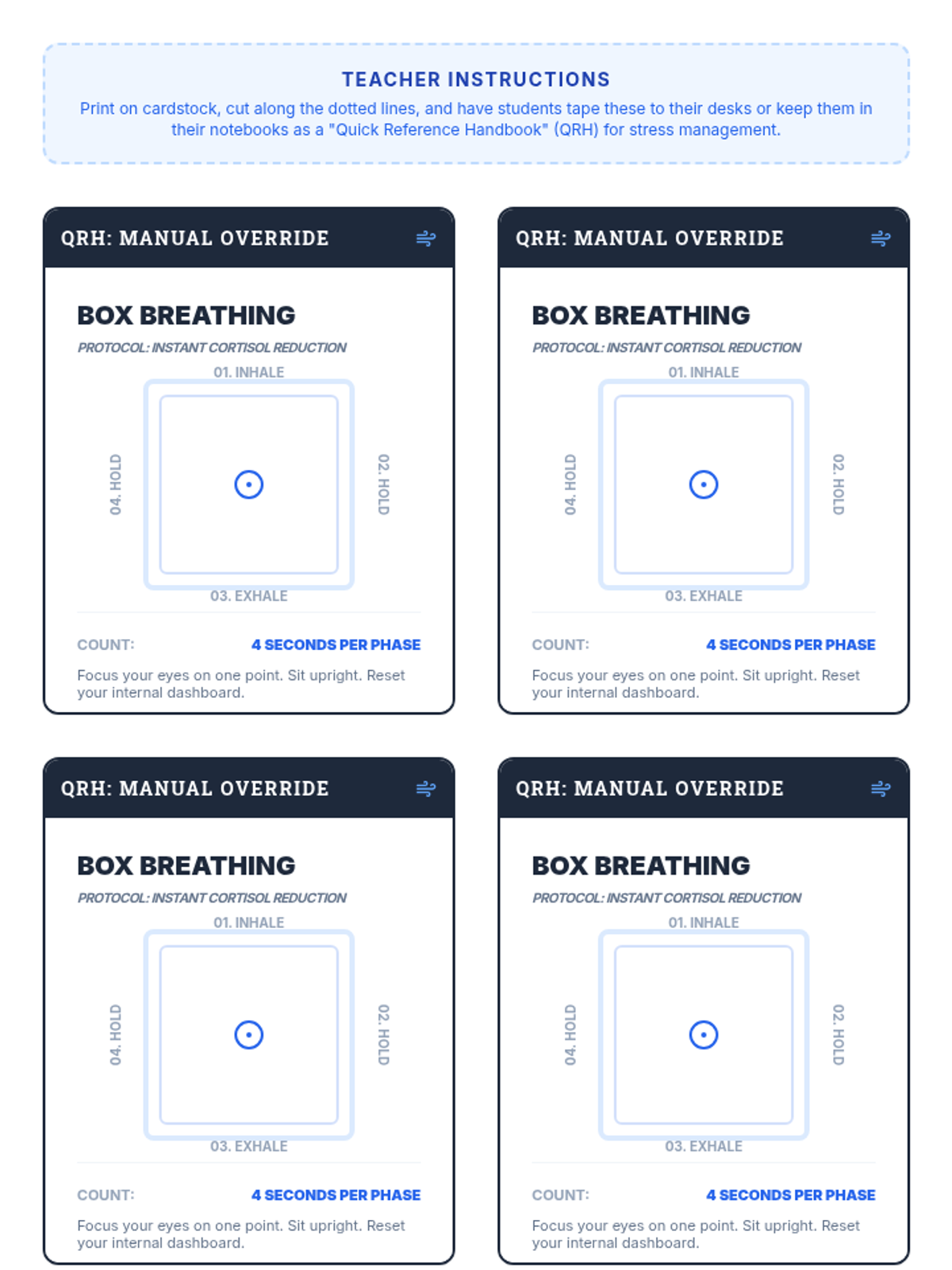 Students will explore a variety of sensory and cognitive coping strategies. They will evaluate which techniques work best for them and begin building their personal 'Coping Menu'.