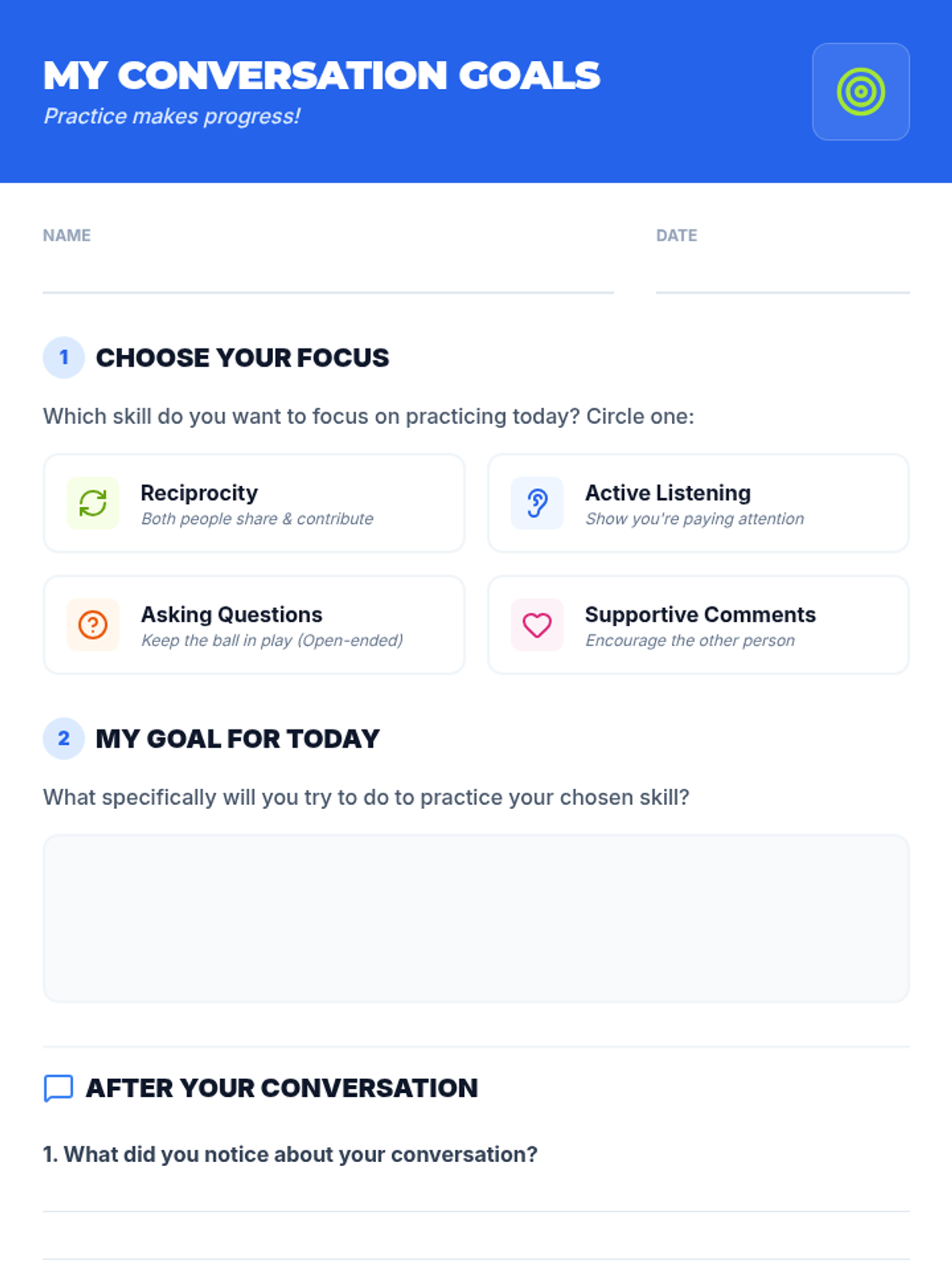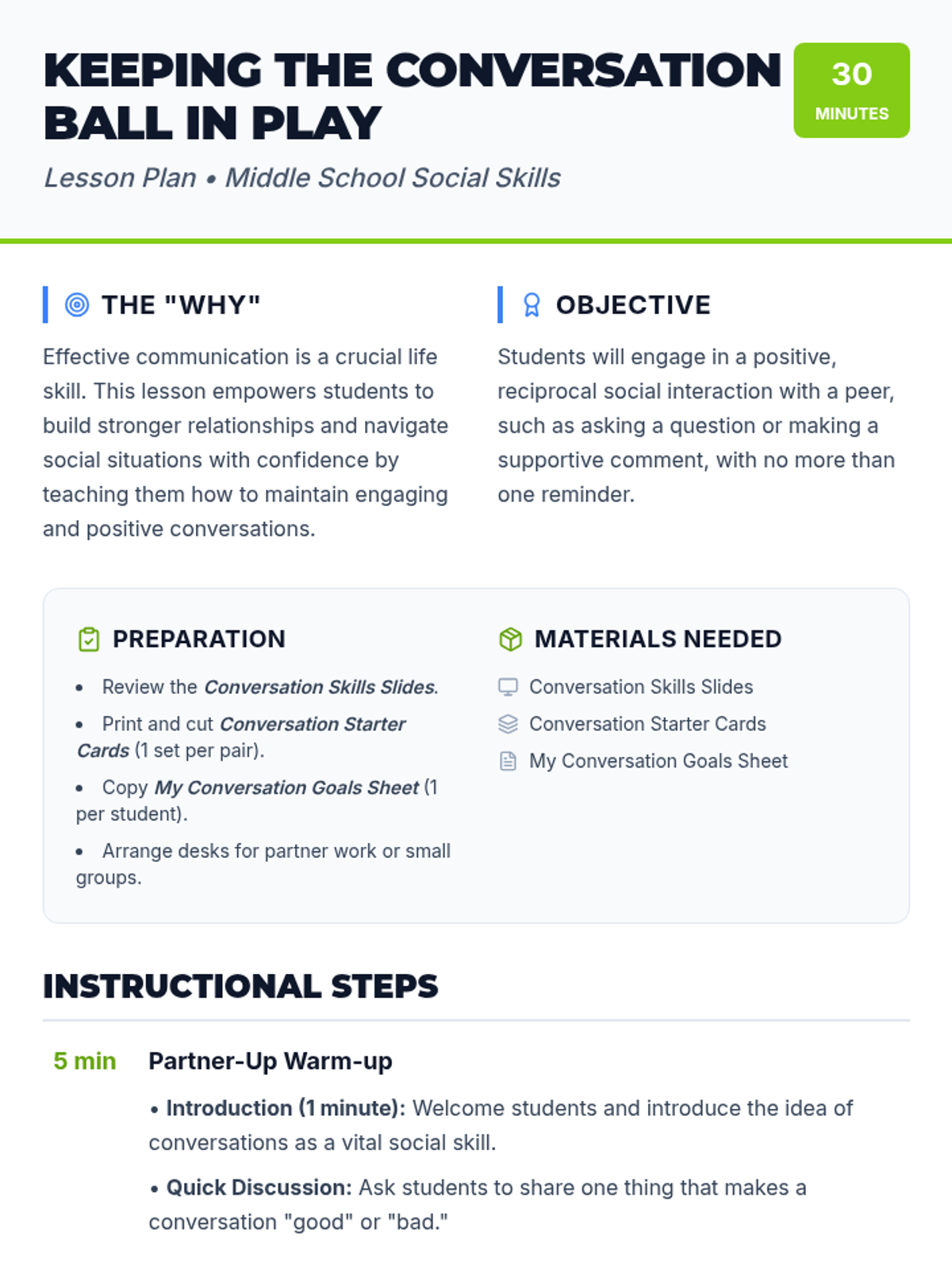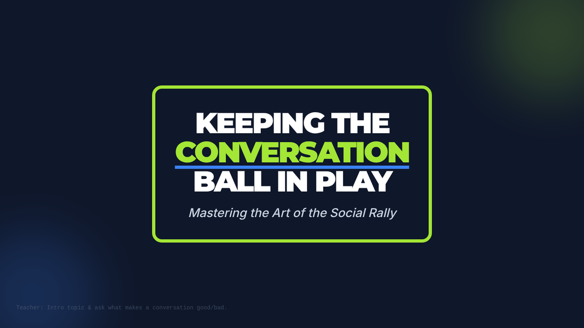A 30-minute social skills lesson for middle schoolers that uses a tennis analogy to teach the importance of reciprocity, active listening, and questioning in maintaining engaging conversations.