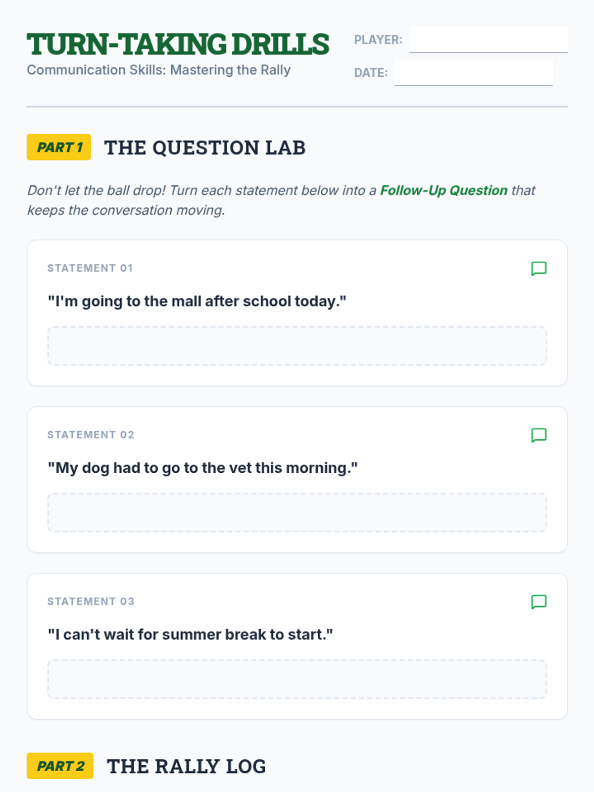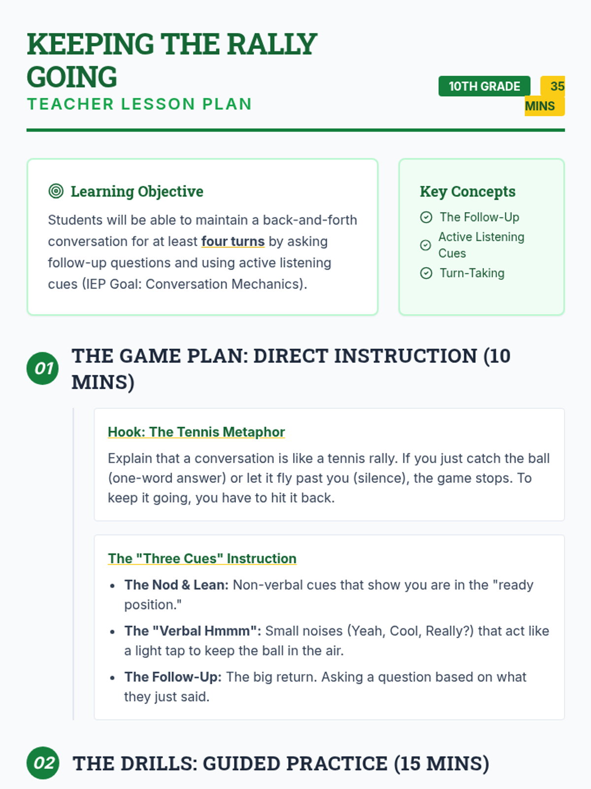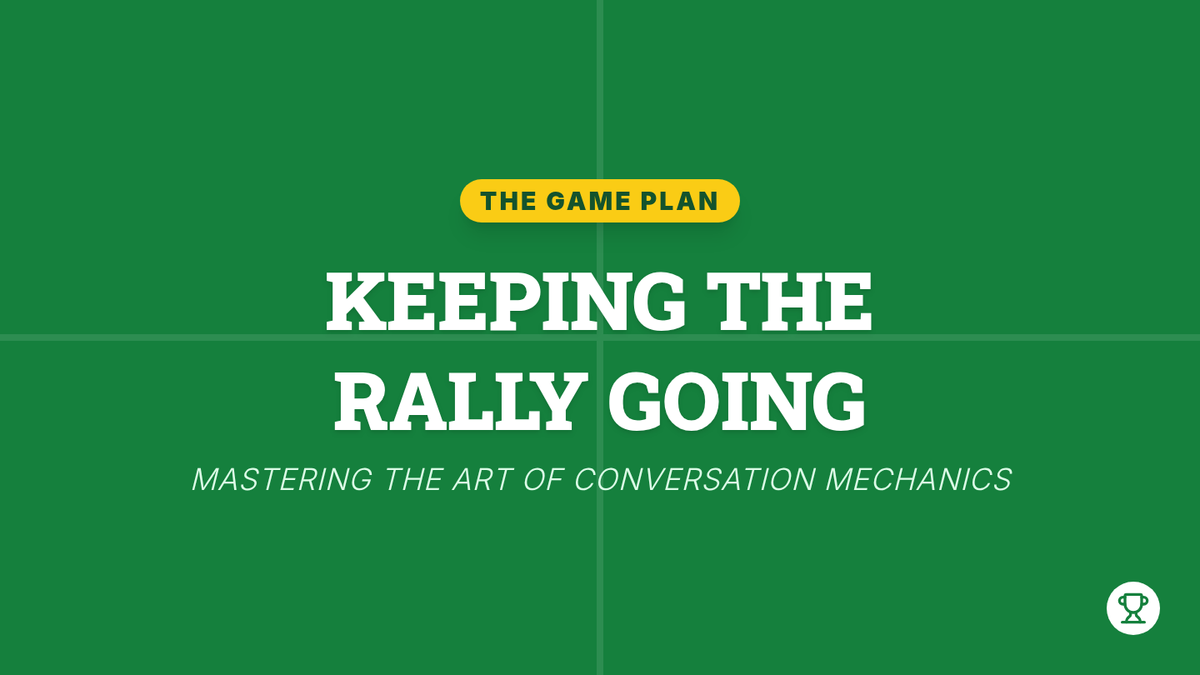 A specialized communication lesson for 10th-grade students focused on maintaining social momentum through follow-up questions and active listening, using a tennis-themed 'rally' metaphor.