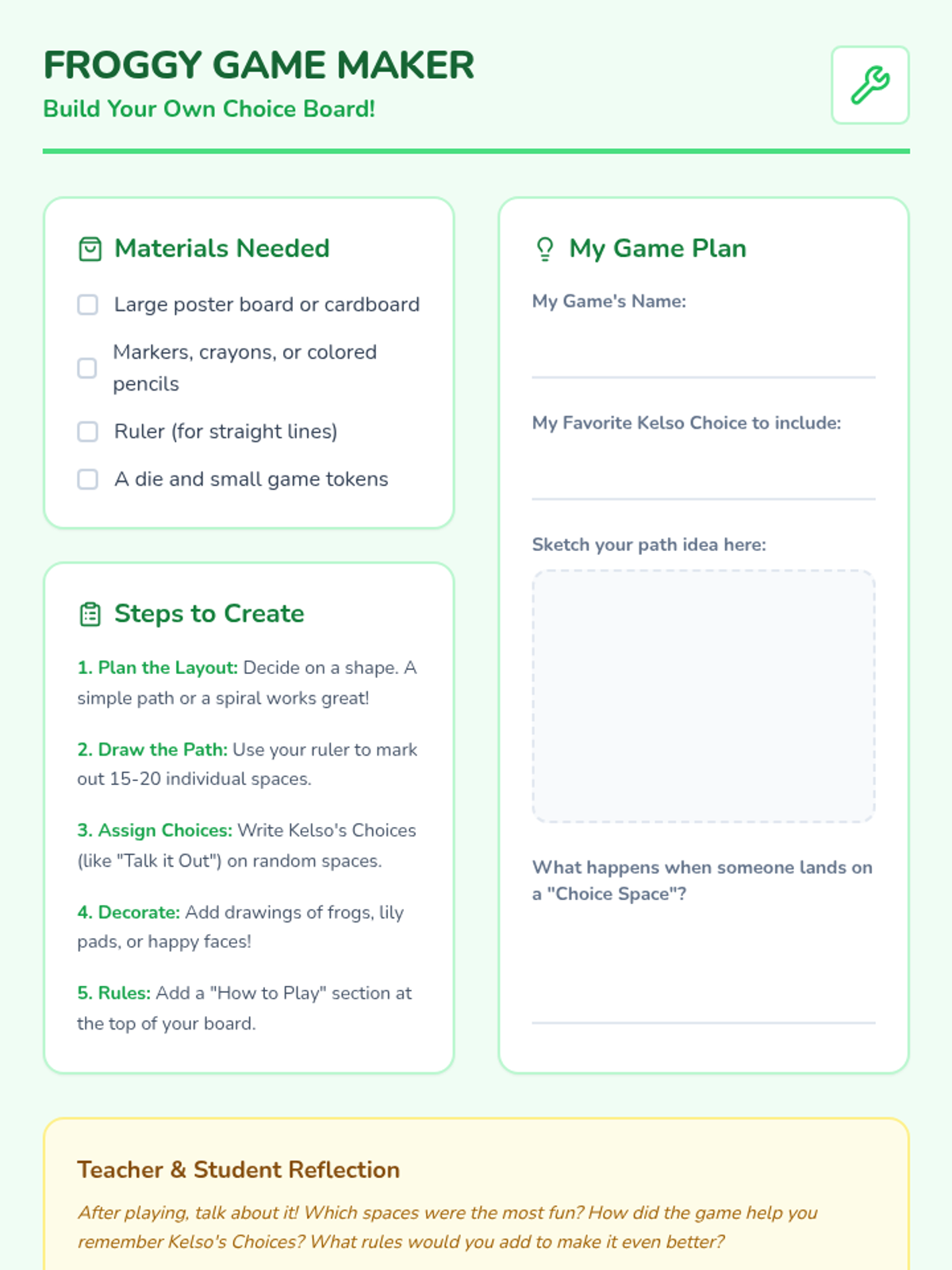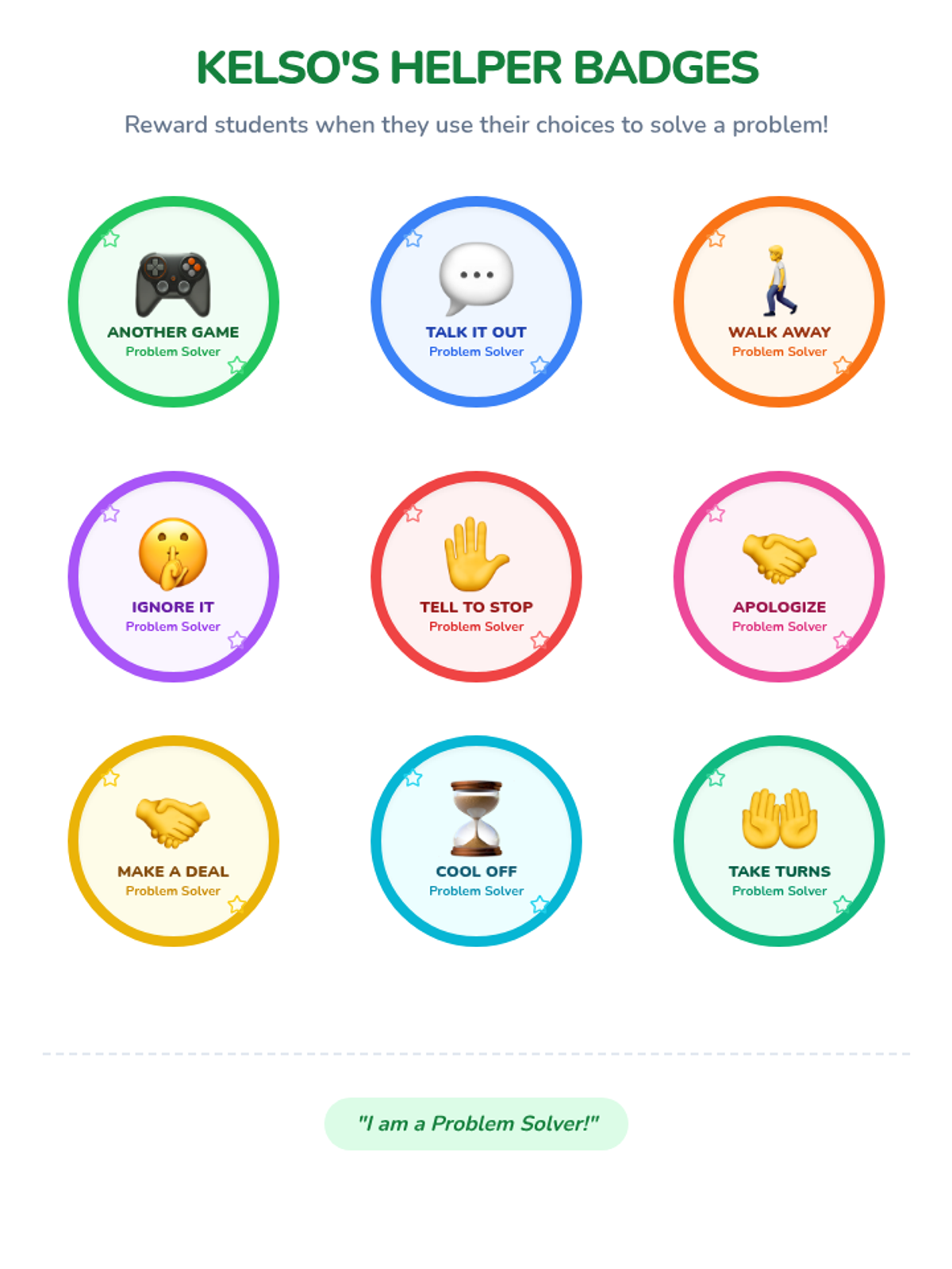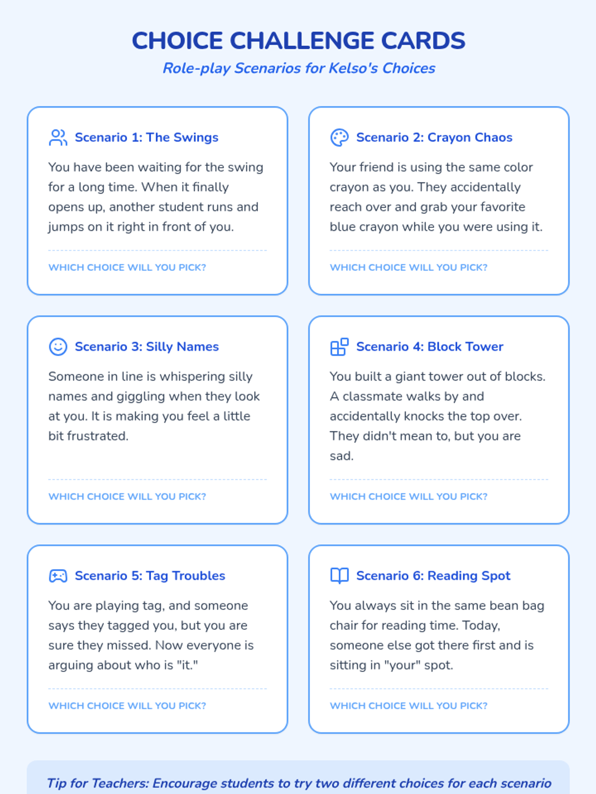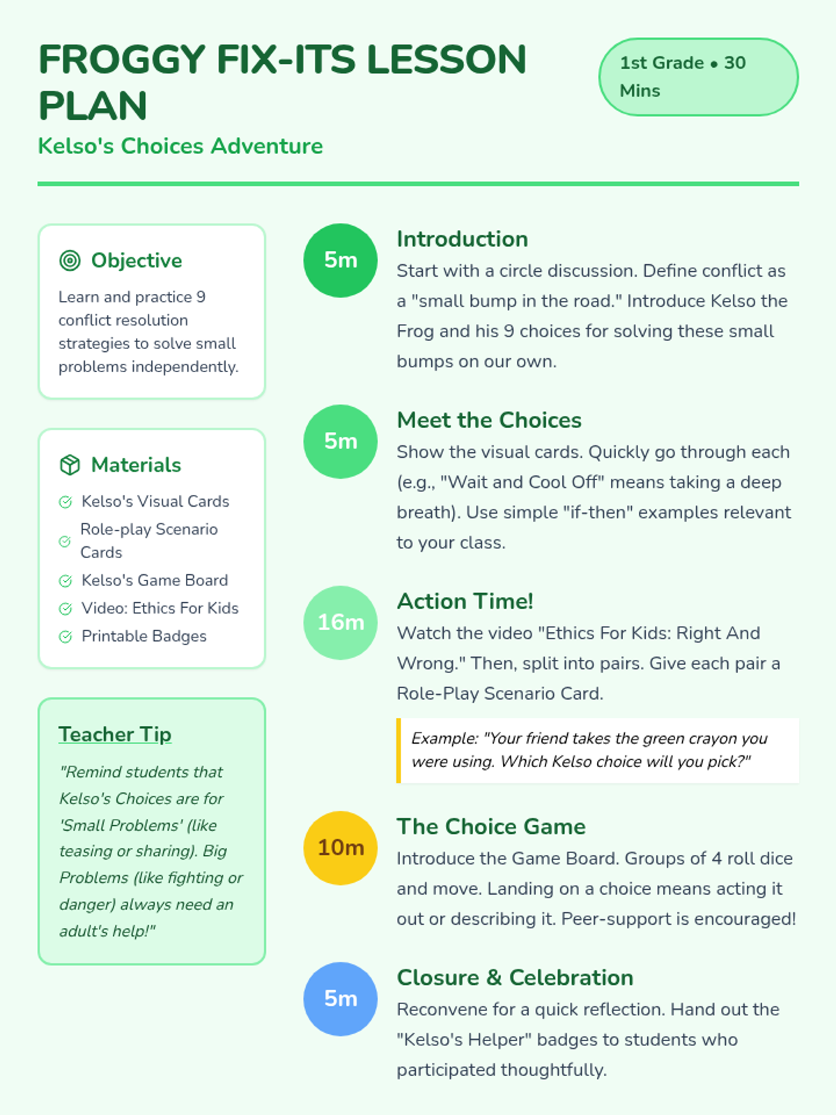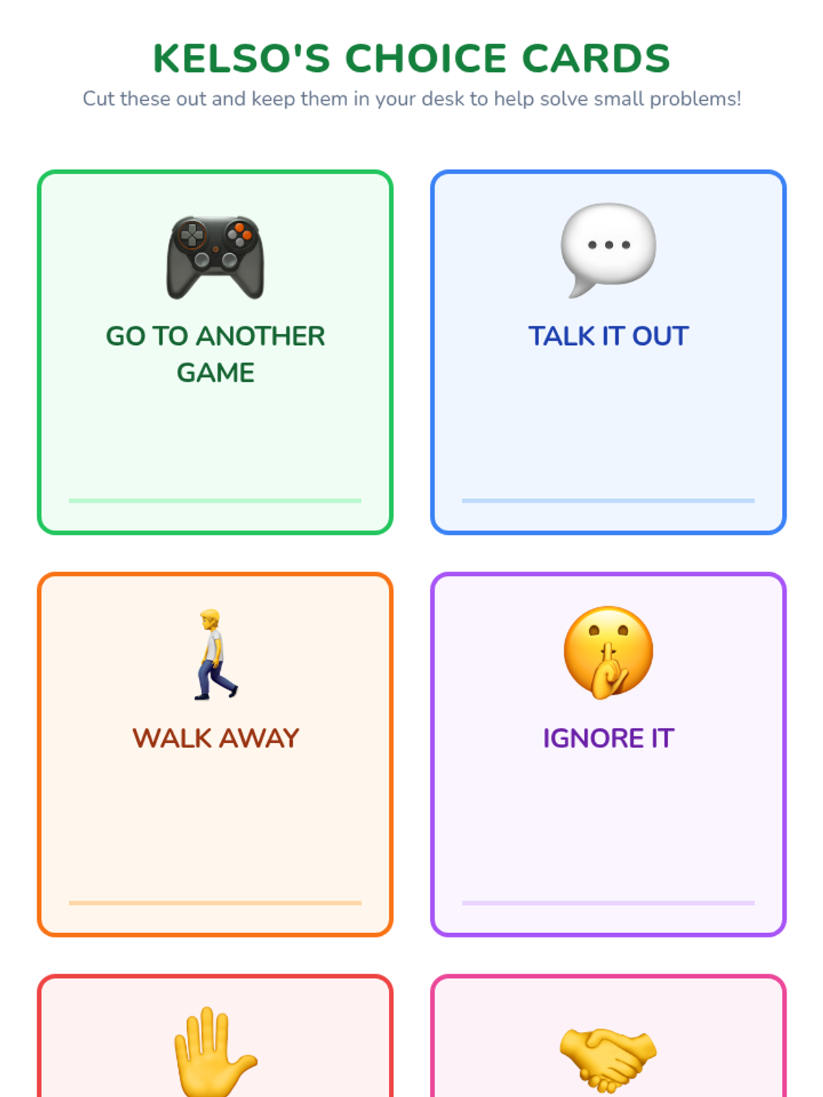 A 1st-grade lesson introducing Kelso's Choices, a set of nine strategies for resolving small conflicts independently. Students will practice these skills through video, role-play, and a board game.