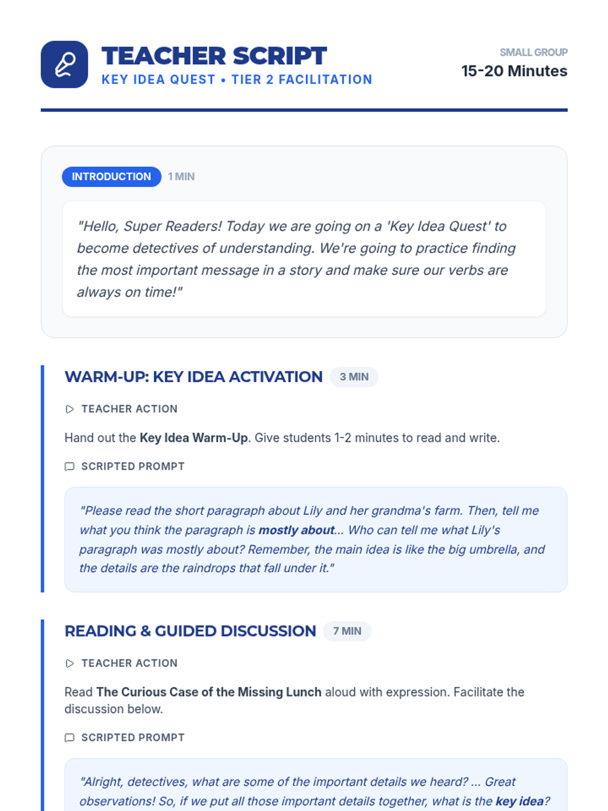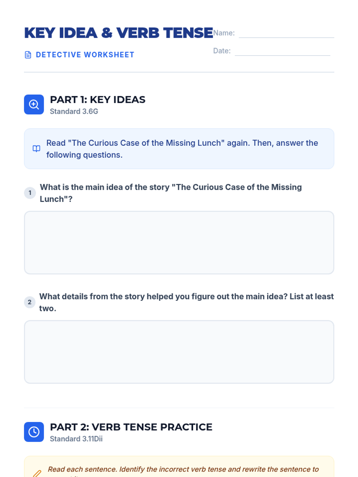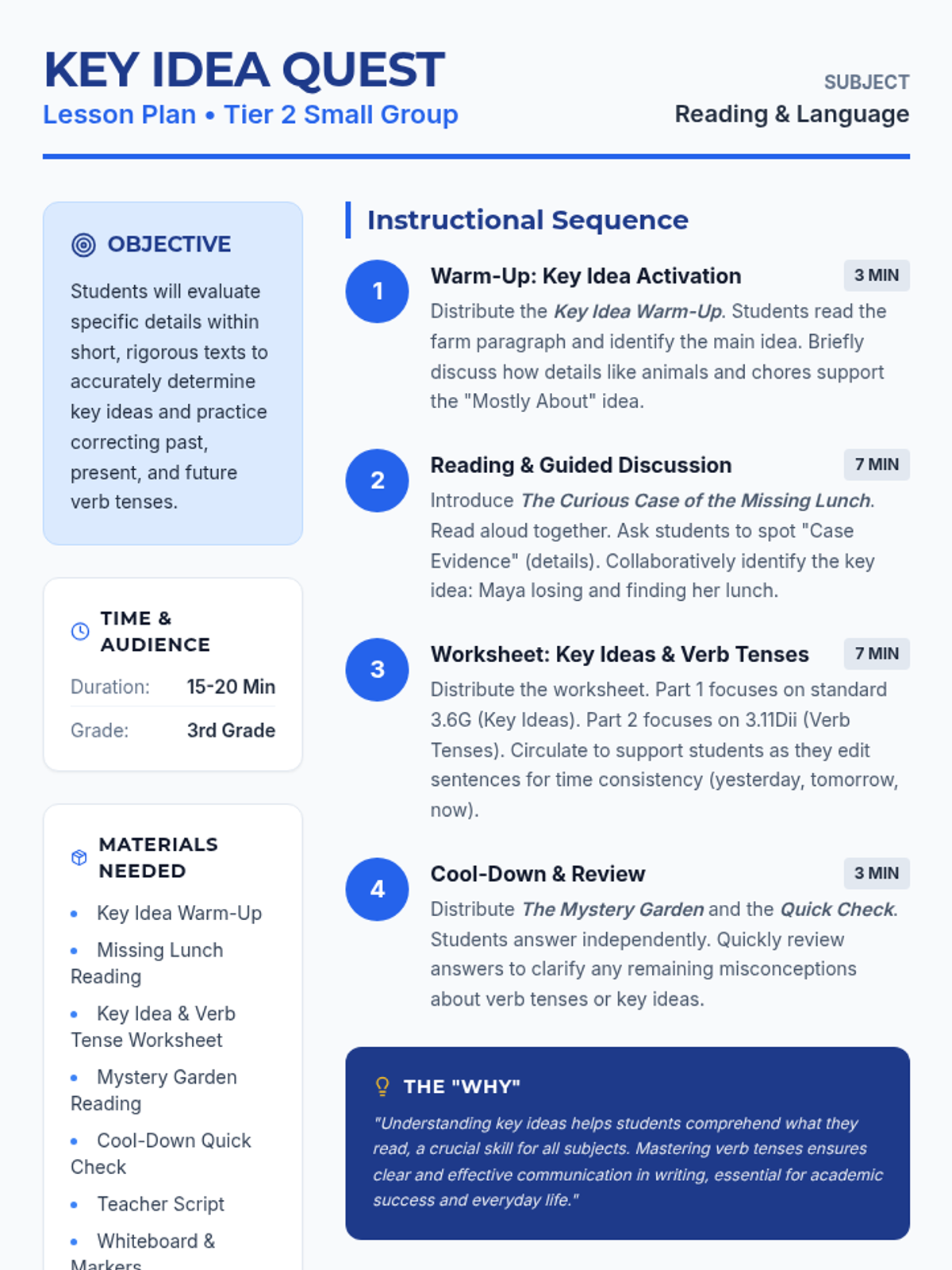 A 15-20 minute small group Tier 2 reteach lesson for 3rd graders focused on identifying key ideas in multi-genre texts and mastering past, present, and future verb tenses.