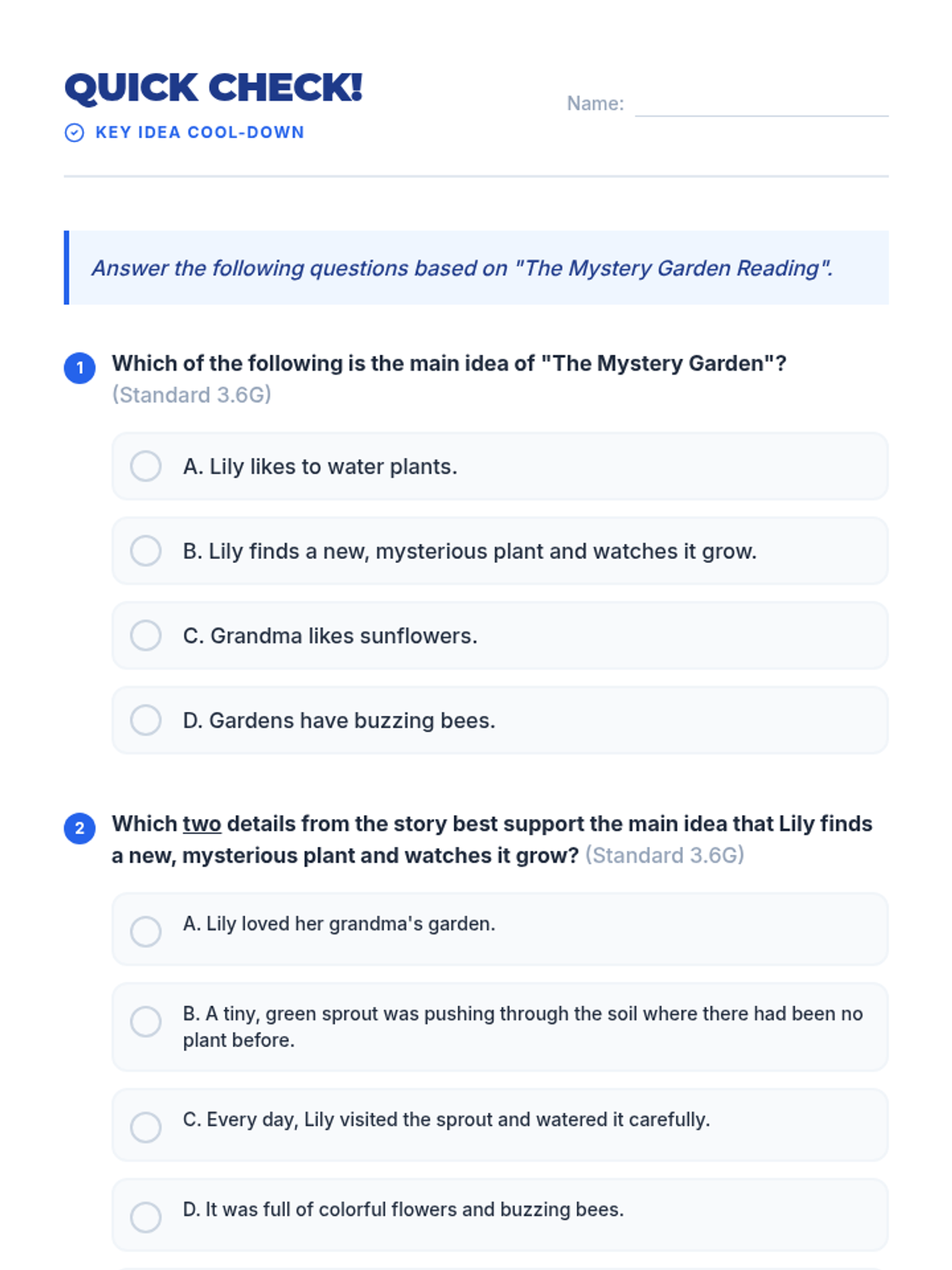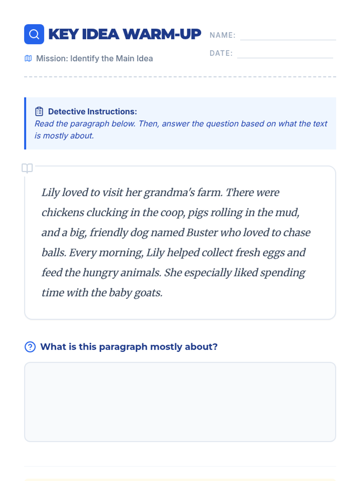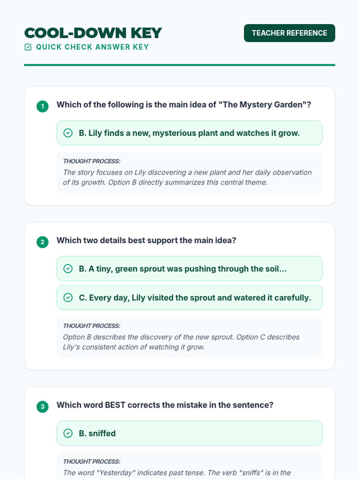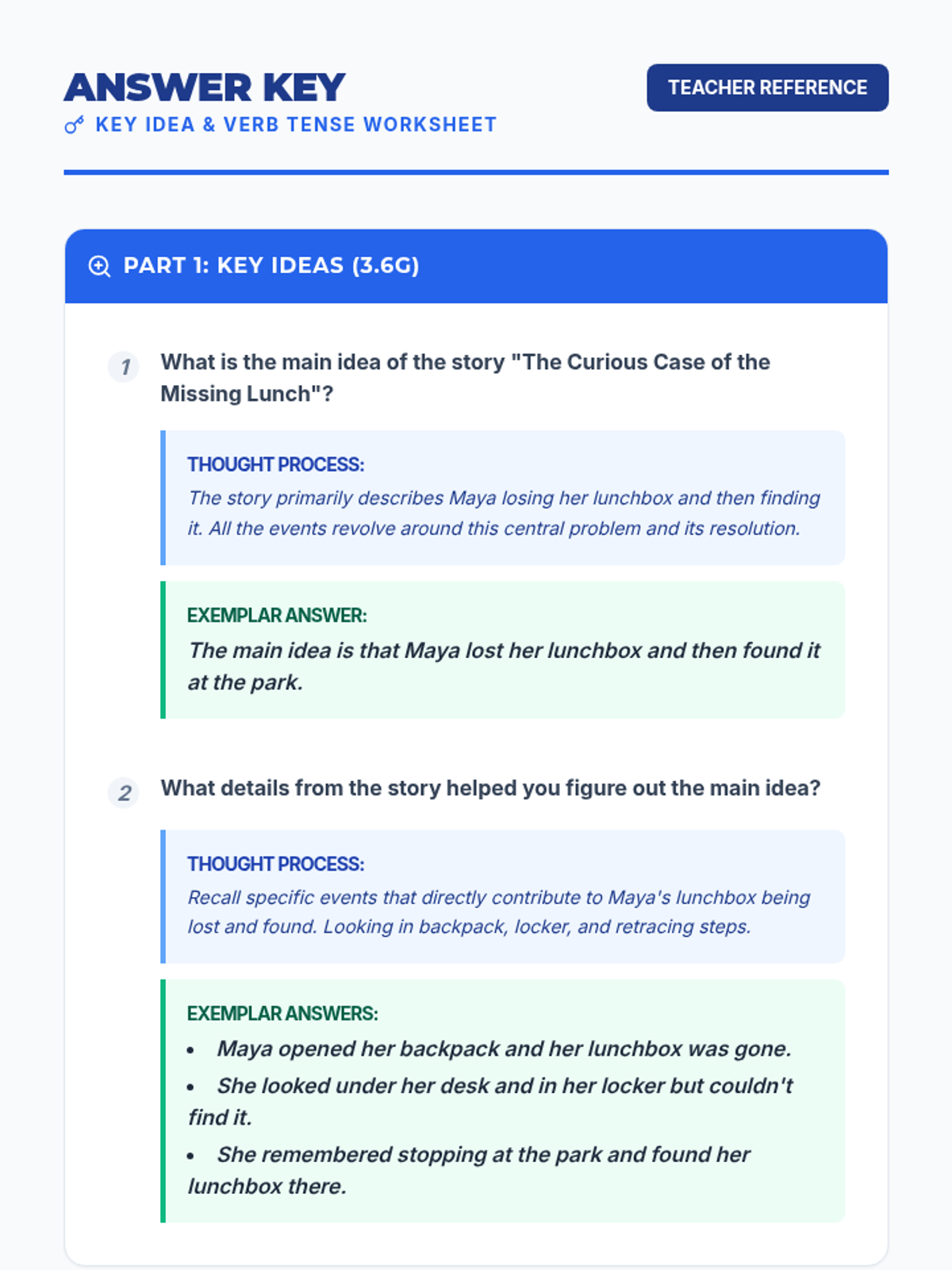 A 15-20 minute small group Tier 2 reteach lesson for 3rd graders focused on identifying key ideas in multi-genre texts and mastering past, present, and future verb tenses.