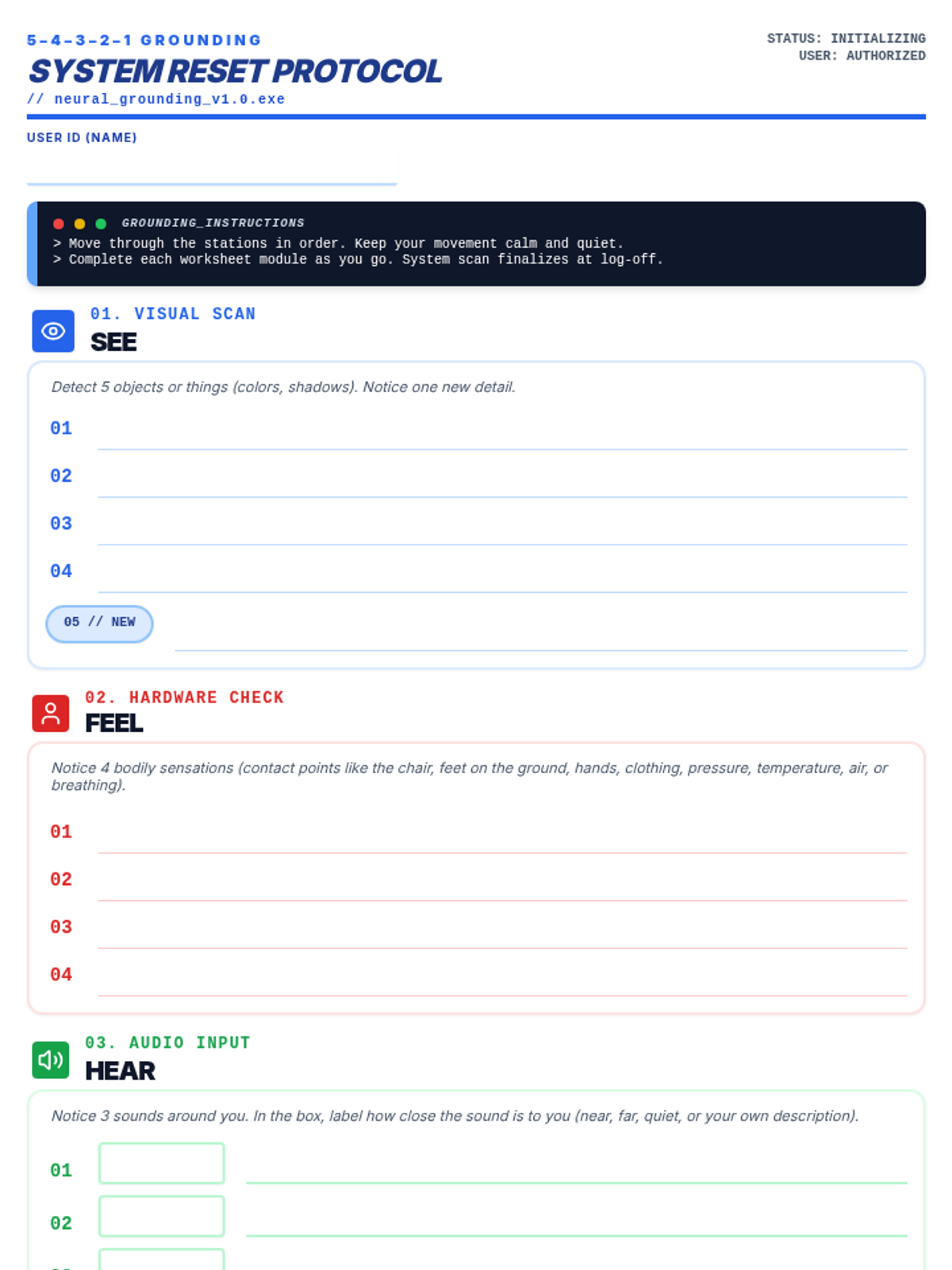 A lesson teaching students how to use the 5-4-3-2-1 grounding technique to manage stress and anxiety, framed through a technical 'system reset' metaphor. Students learn to recognize the 'spinning' state of anxiety and intercept it using sensory inputs.
