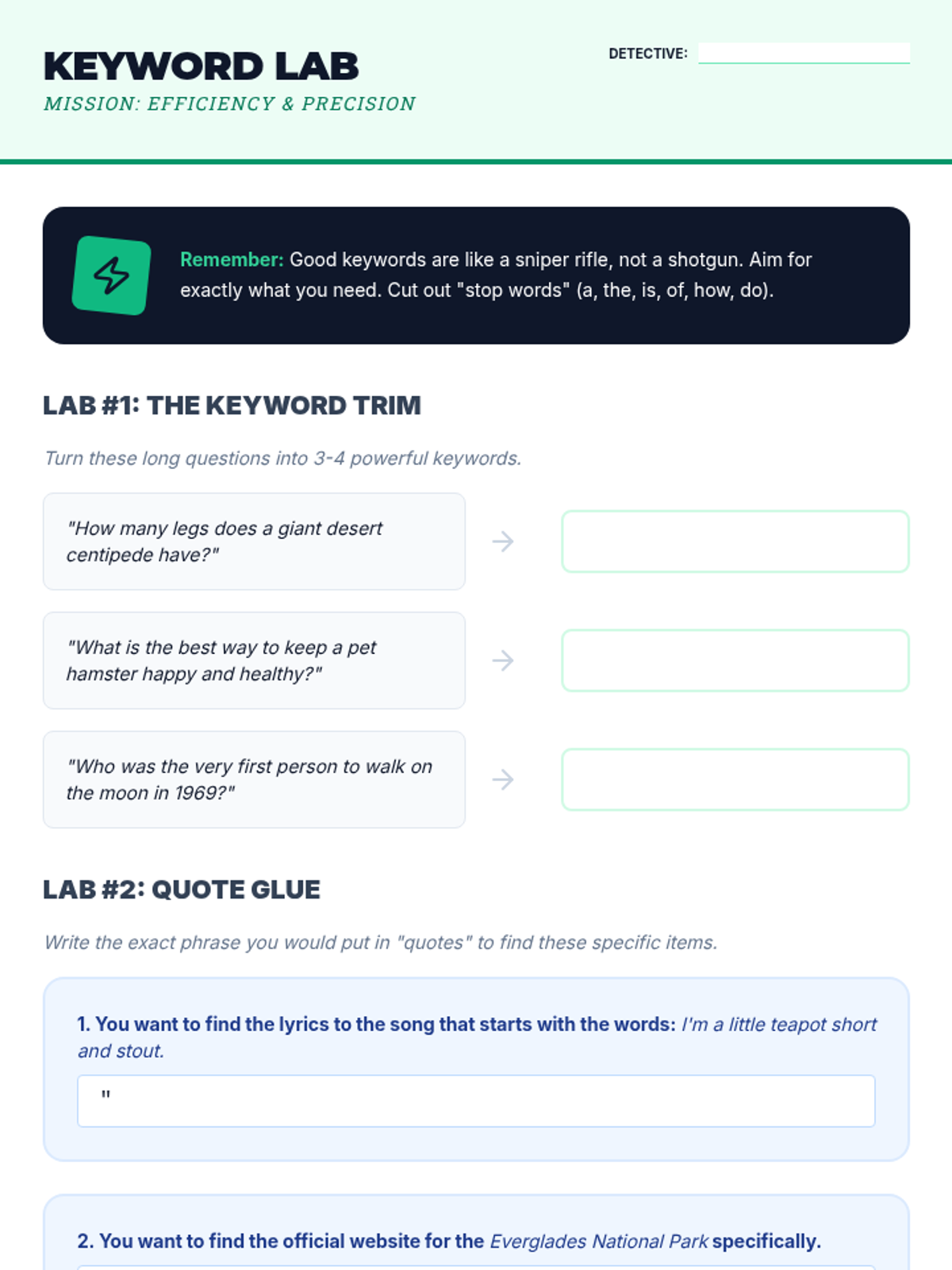 A workshop on search engine mechanics, including refining keywords and using quotation marks for precise results.