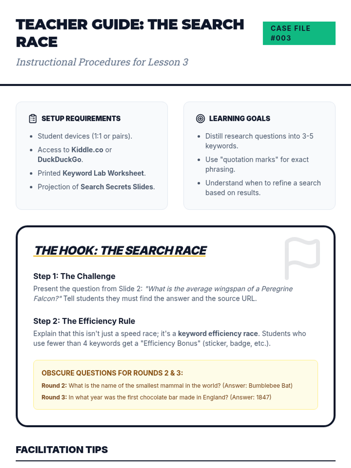 Students participate in a 'Race for Information' where they must decide between skimming or scanning based on the question type, building metacognitive awareness and strategy selection.