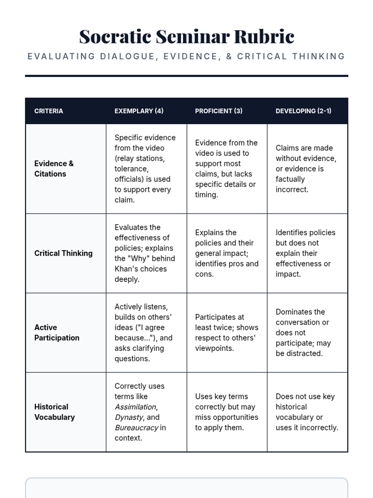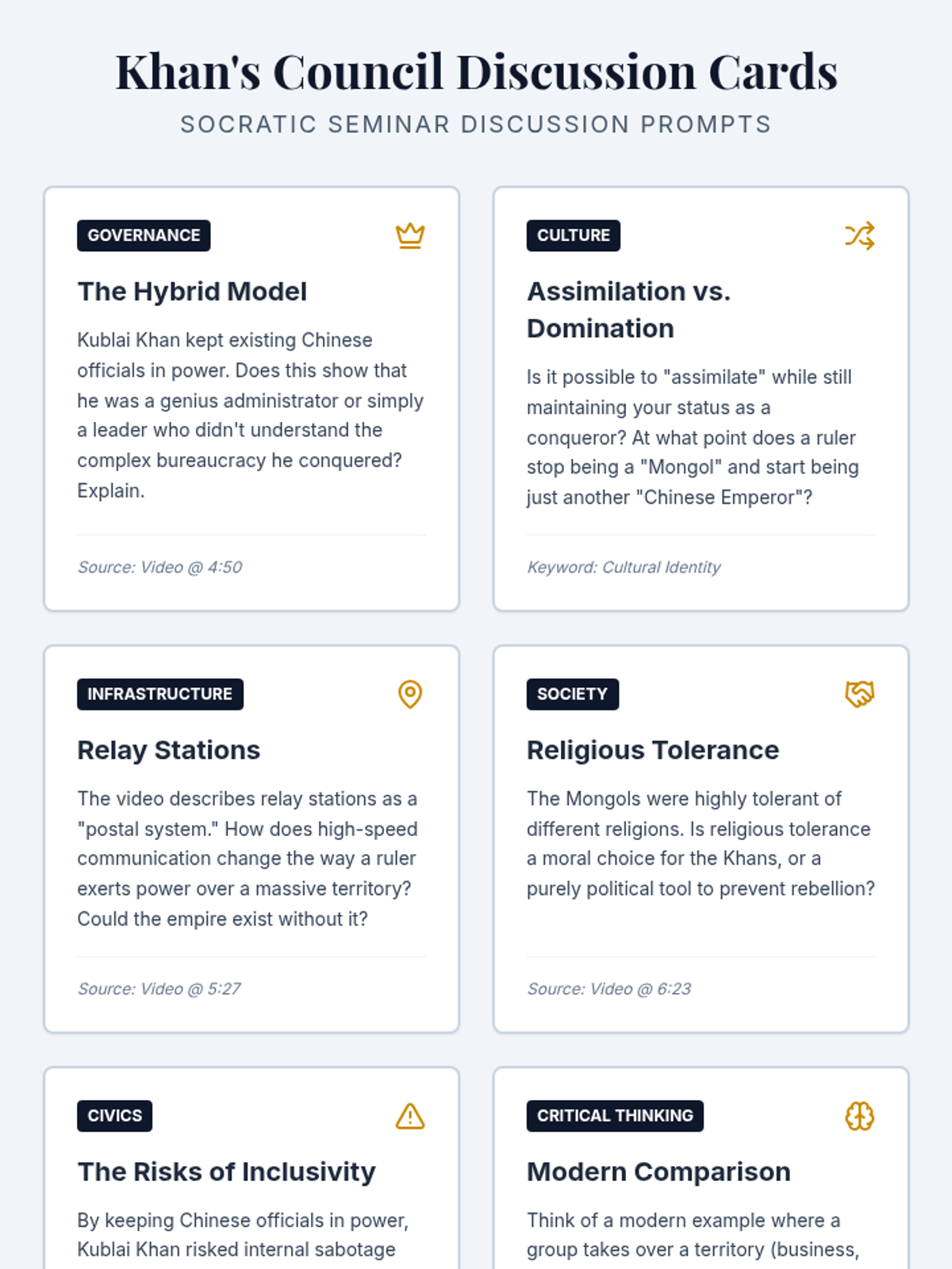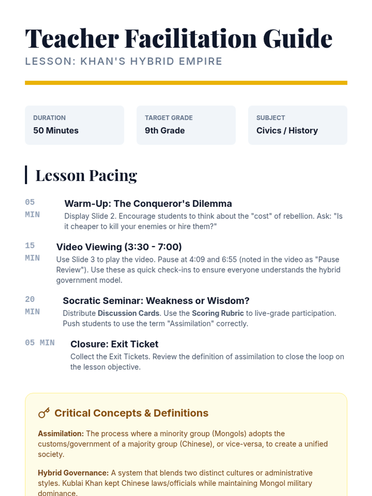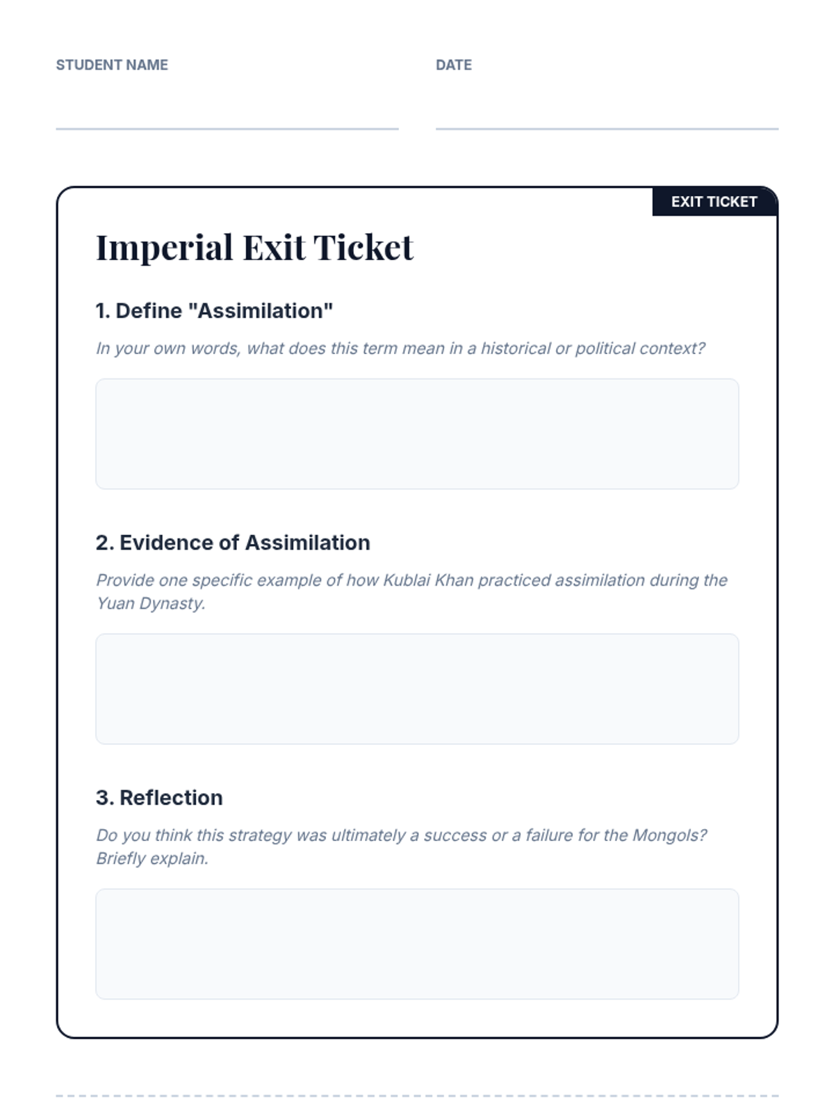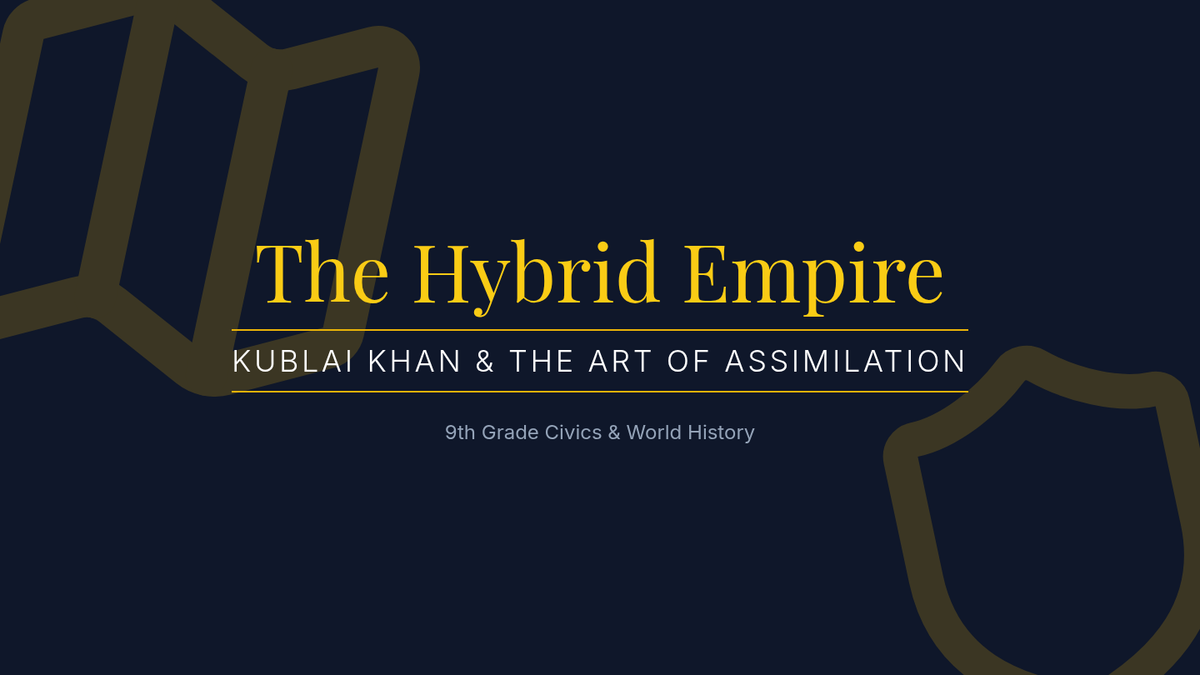 This lesson evaluates Kublai Khan's governance strategies, specifically focusing on the hybrid government model and the concept of cultural assimilation during the Yuan Dynasty. Students will watch a video, engage in a Socratic Seminar, and define assimilation in a historical context.