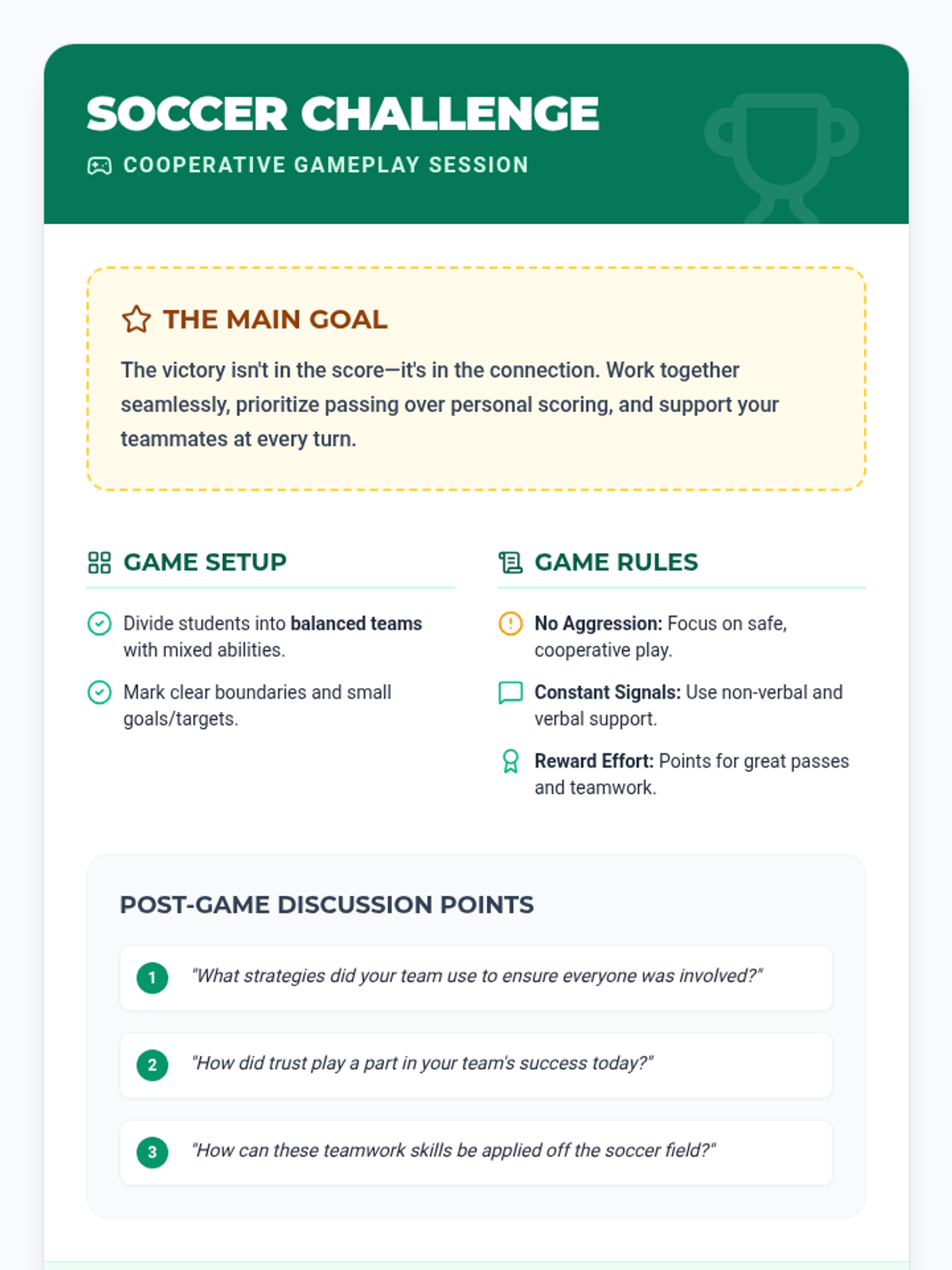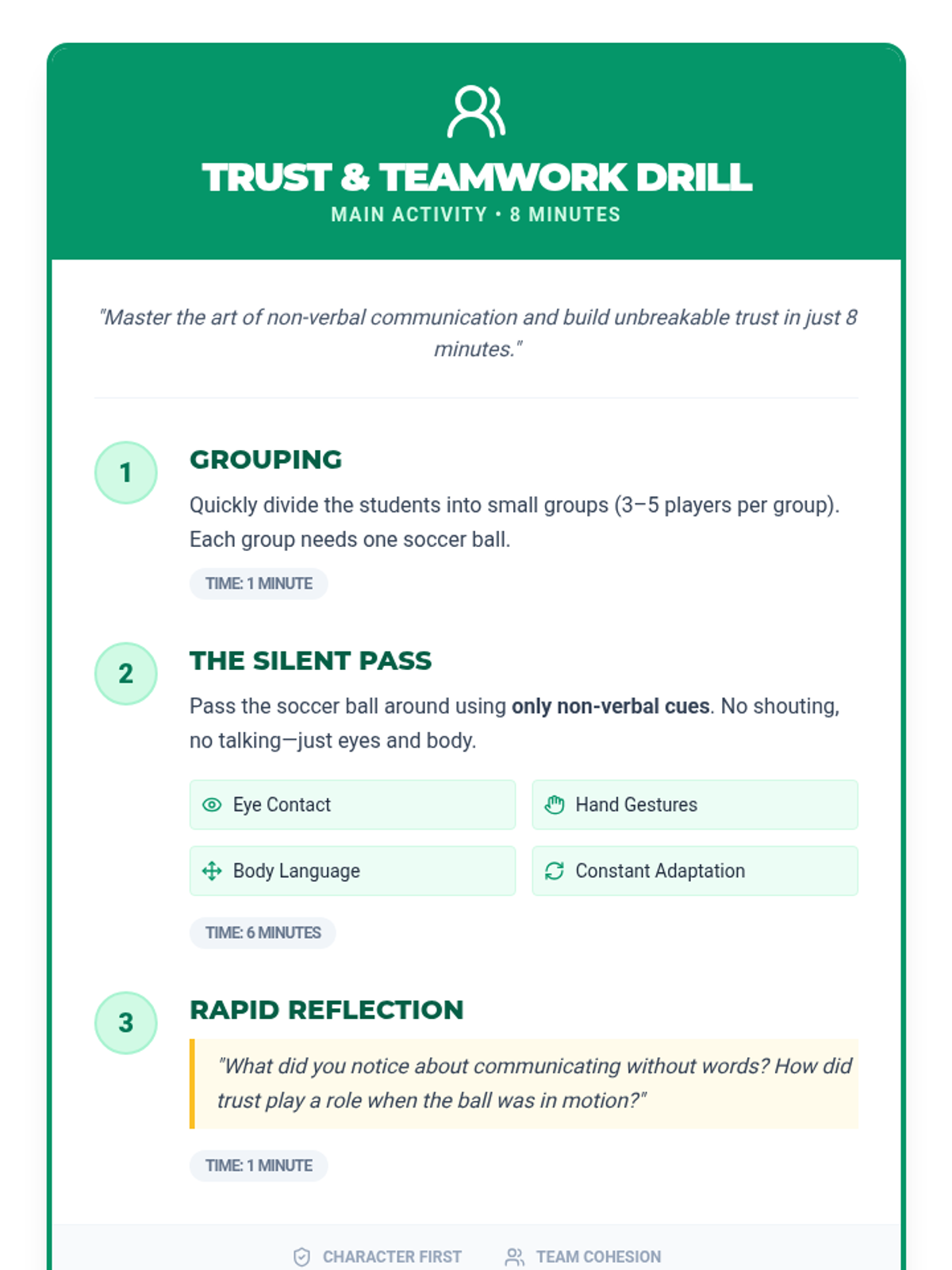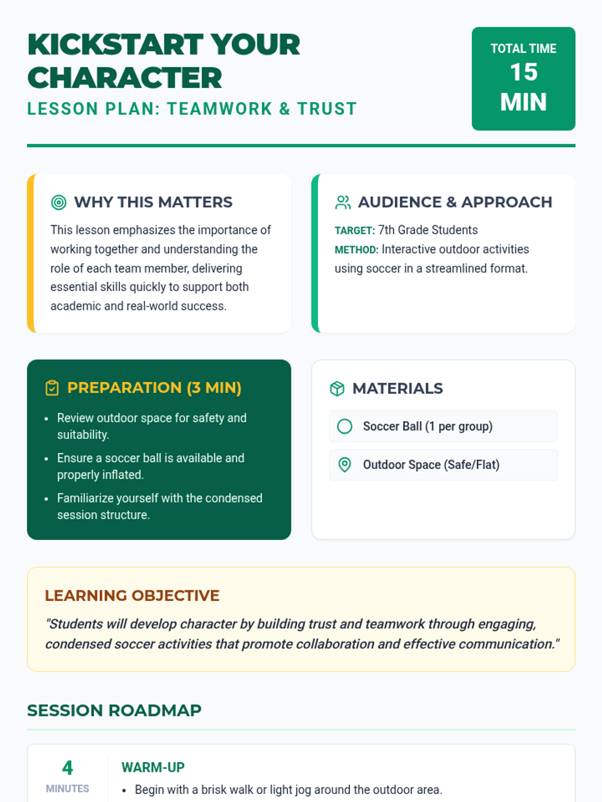 A high-energy, 15-minute outdoor session for 7th graders focusing on character development through soccer-based teamwork and trust activities.