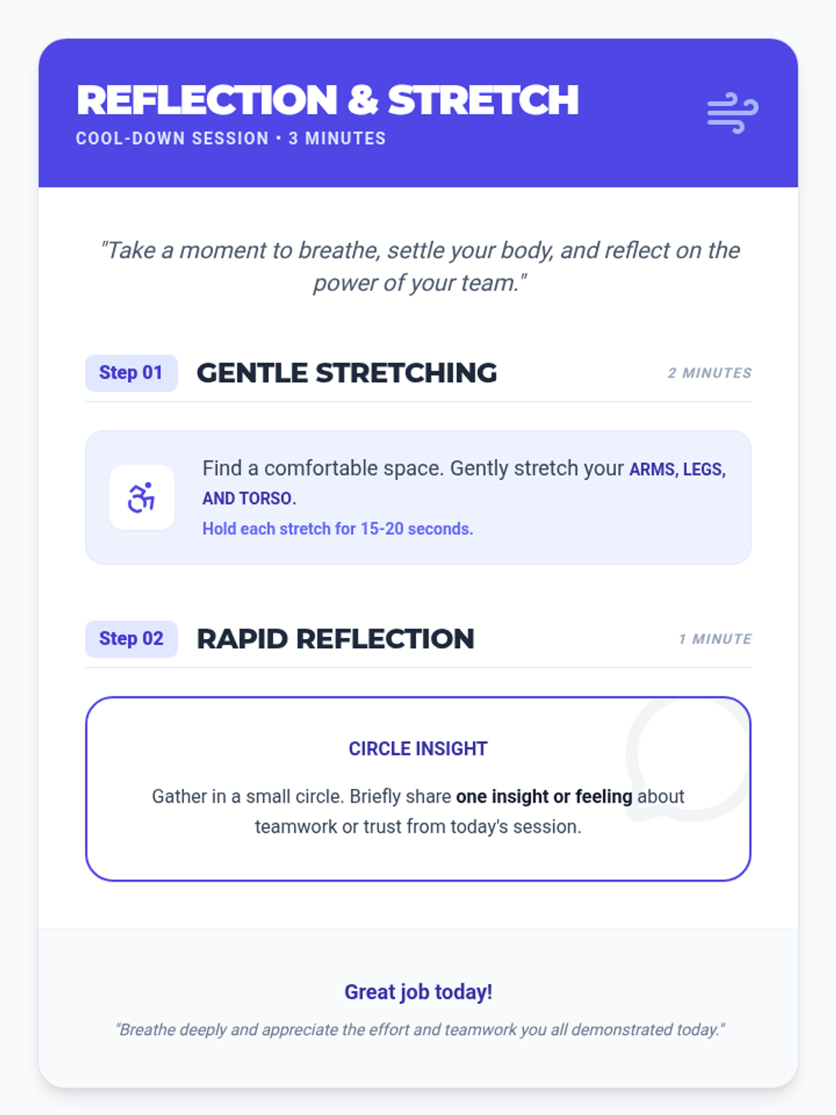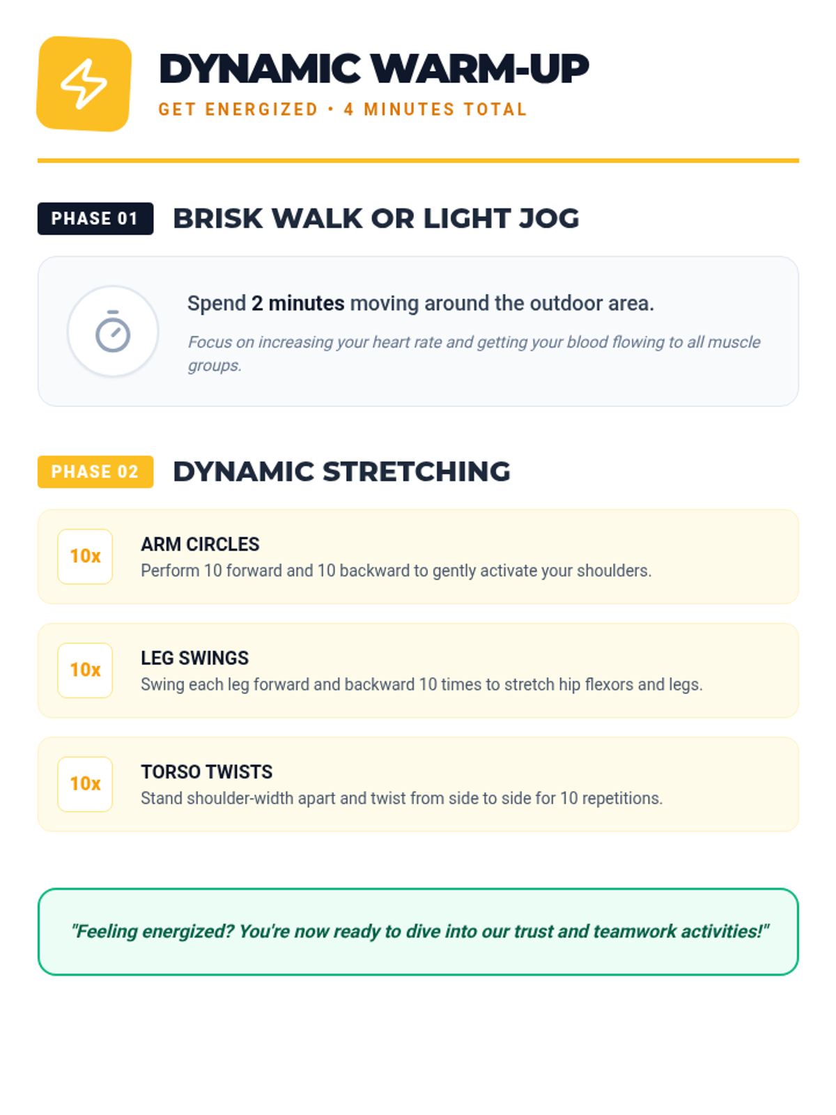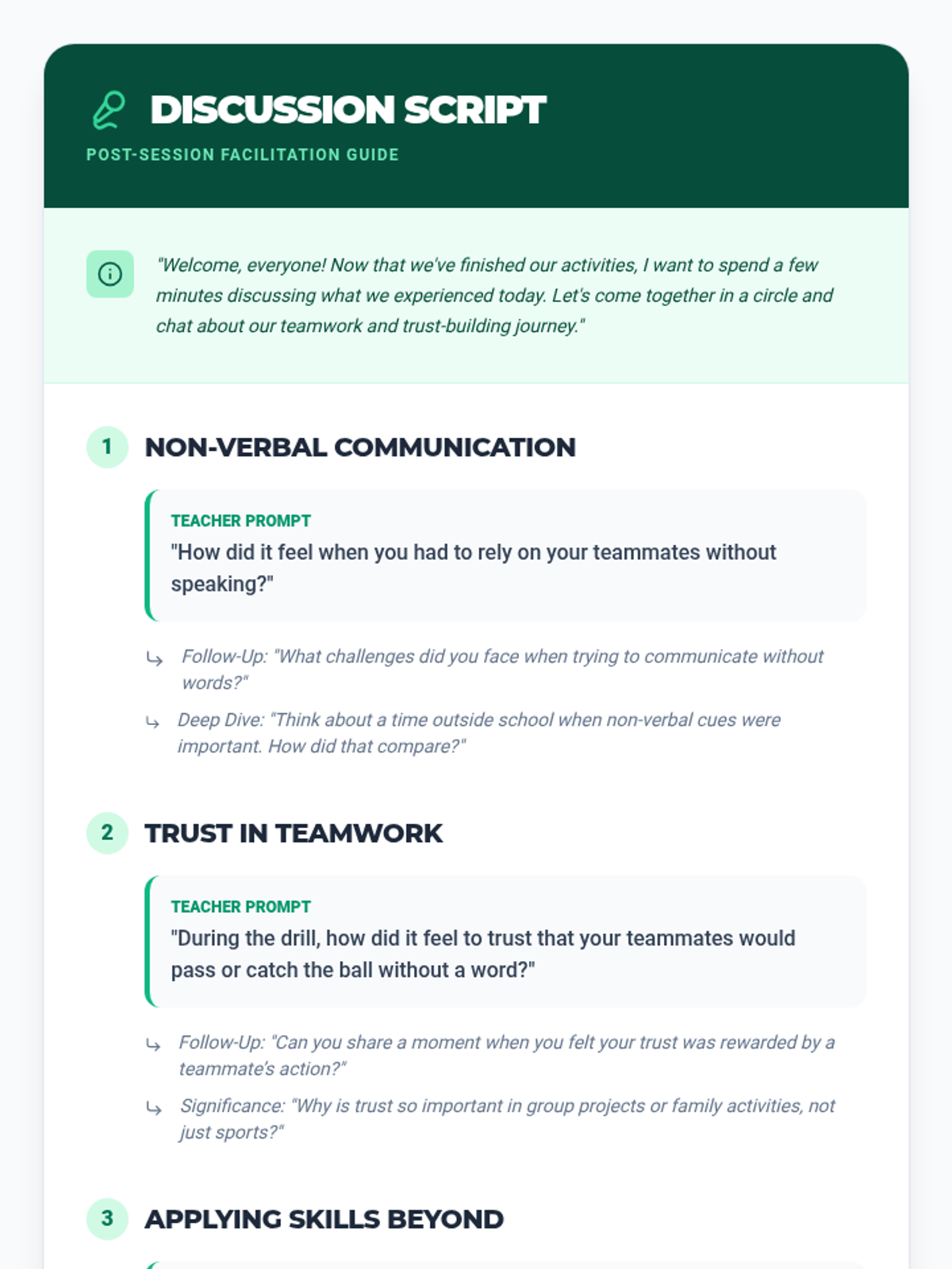 A high-energy, 15-minute outdoor session for 7th graders focusing on character development through soccer-based teamwork and trust activities.